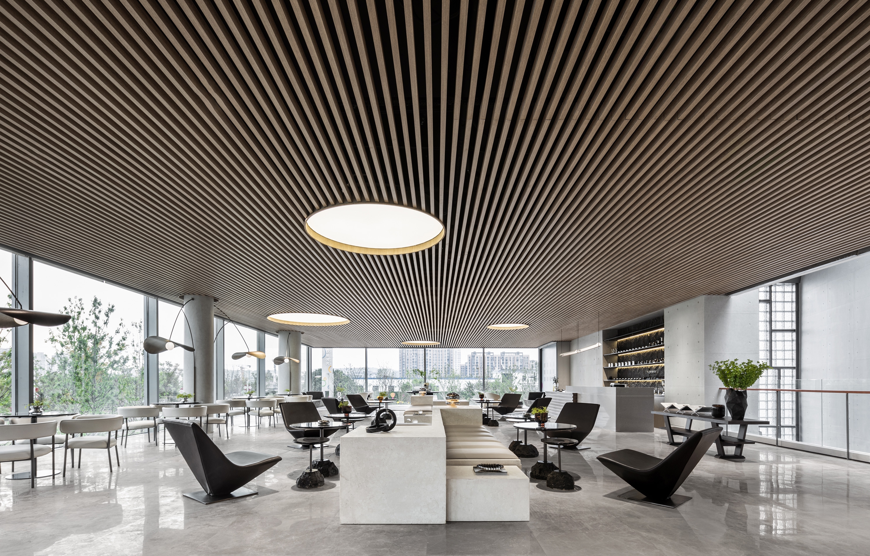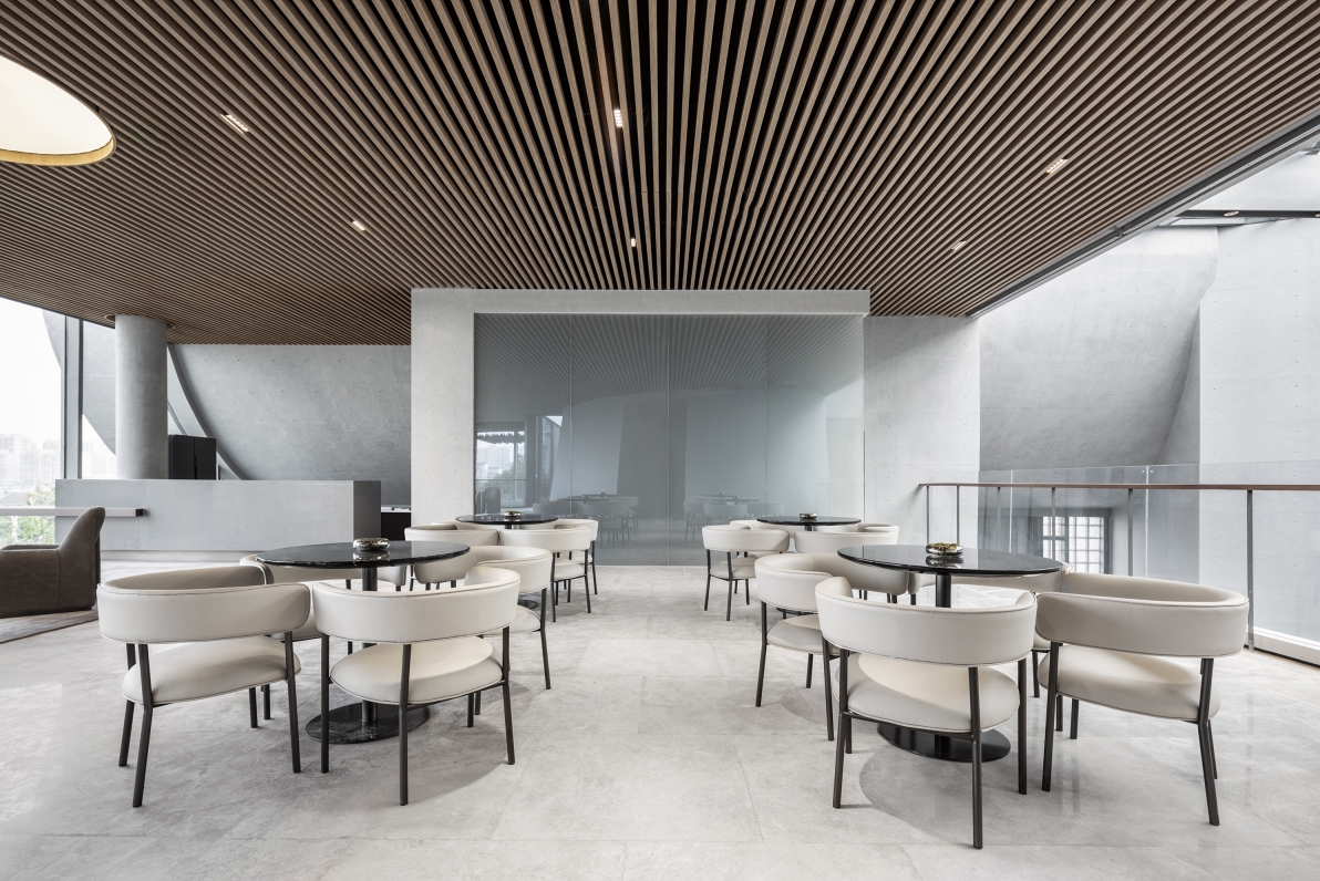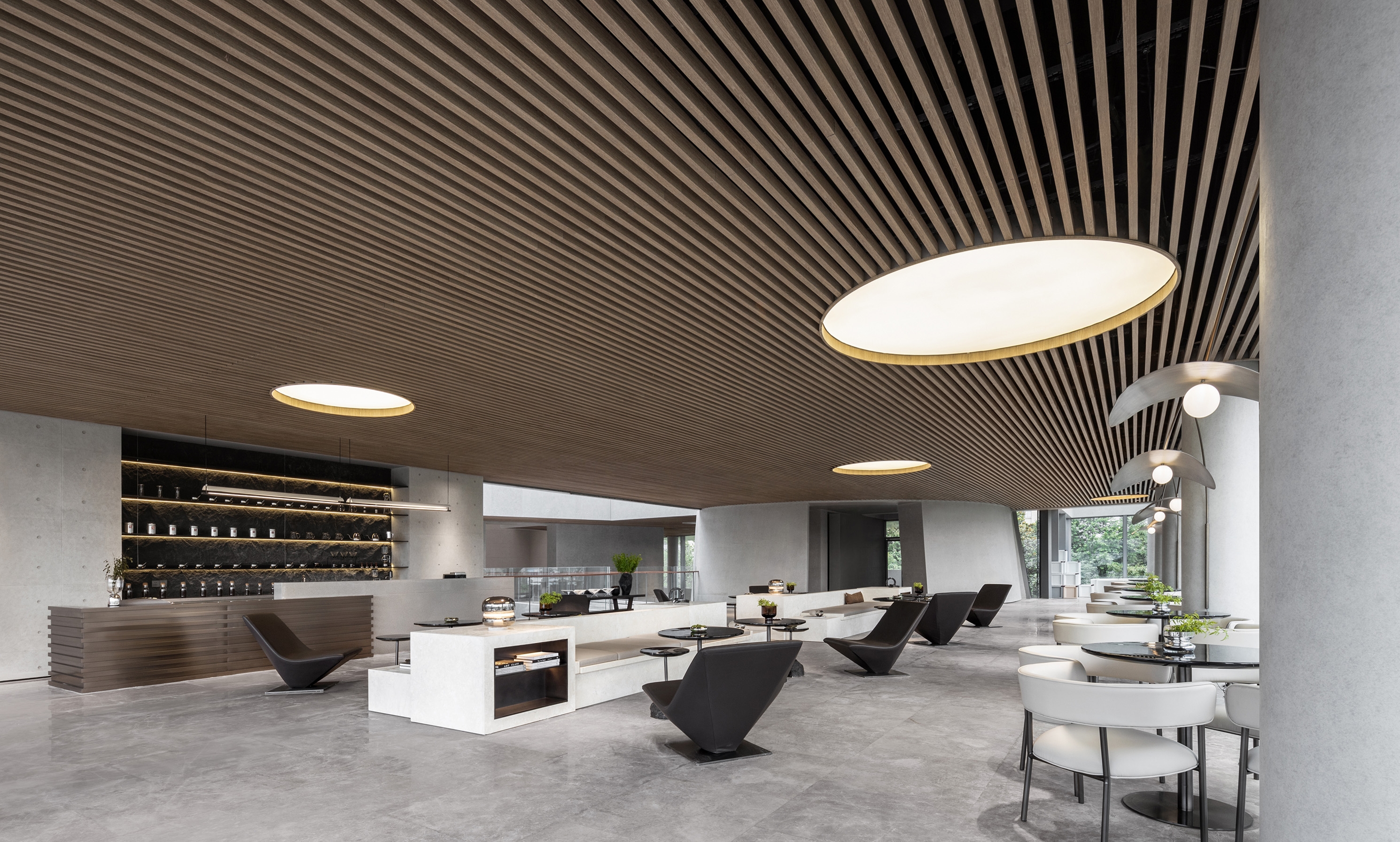 The current shortage of water resources is an imminent issue that human beings have to address without delay. However, this problem has not yet claimed our attention. Therefore, the inspiration of this project comes from Day Zero, a documentary directed by Kevin Sim: “Water may come into people’s daily life in many images, in particular, people’s life of feelings.” The designer extracts the element of “water”, combines “sales center, exhibition center, experience center and art center” in one work, and adopts an open and inclusive design concept to harmonize the indoor and outdoor scenarios, creating an organic commercial space for the residence project where different scenarios interact with each other and complement with the streets.The project is located in Lishui District, the south source of Qinhuai River in the upper stream. The designer extracts the natural elements of Lishui’s “Tian Sheng Qiao (Natural Bridge)” and “Yan Zhi He (The Bridge of Rouge)”, uses large stone panels and caement to create blanks, and adorns the project with wood for a natural feeling of clemency and intimacy.