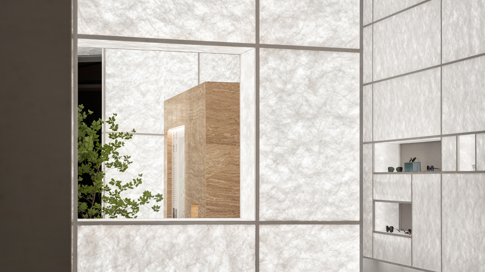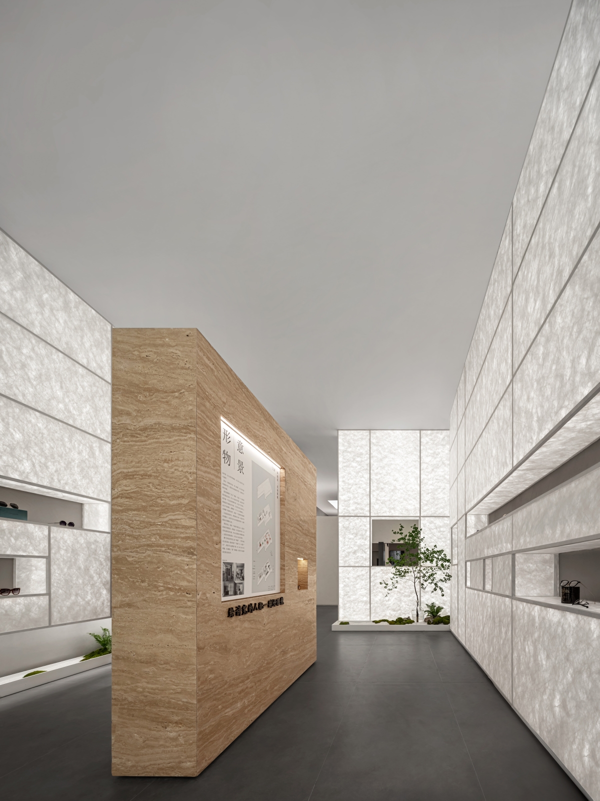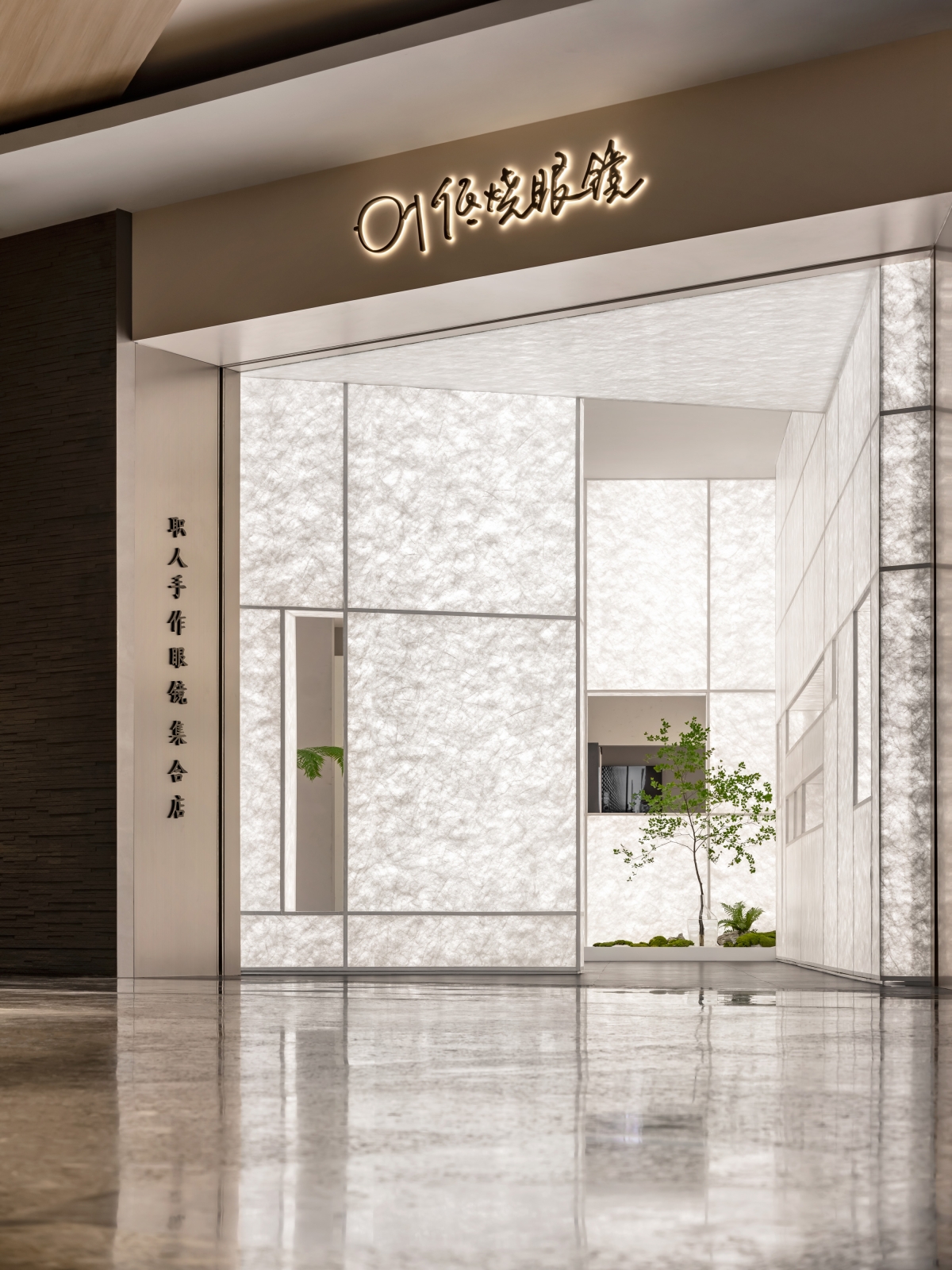 The project subtly combines contemporary context with Oriental charm. Pure geometrical elements and screen walls create a fluid, open space. Synthetic materials such as glass, metal and Tyvek paper are utilized. The project adopts Oriental simplistic aesthetics, and creates contrasting visual effects in the space. Inside the store's entrance, Tyvek paper forms a pure luminous space where eyeglasses are displayed.