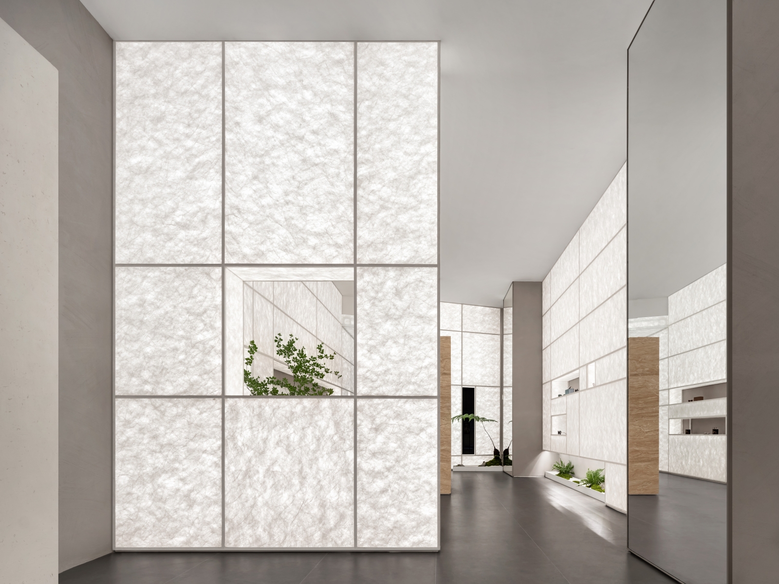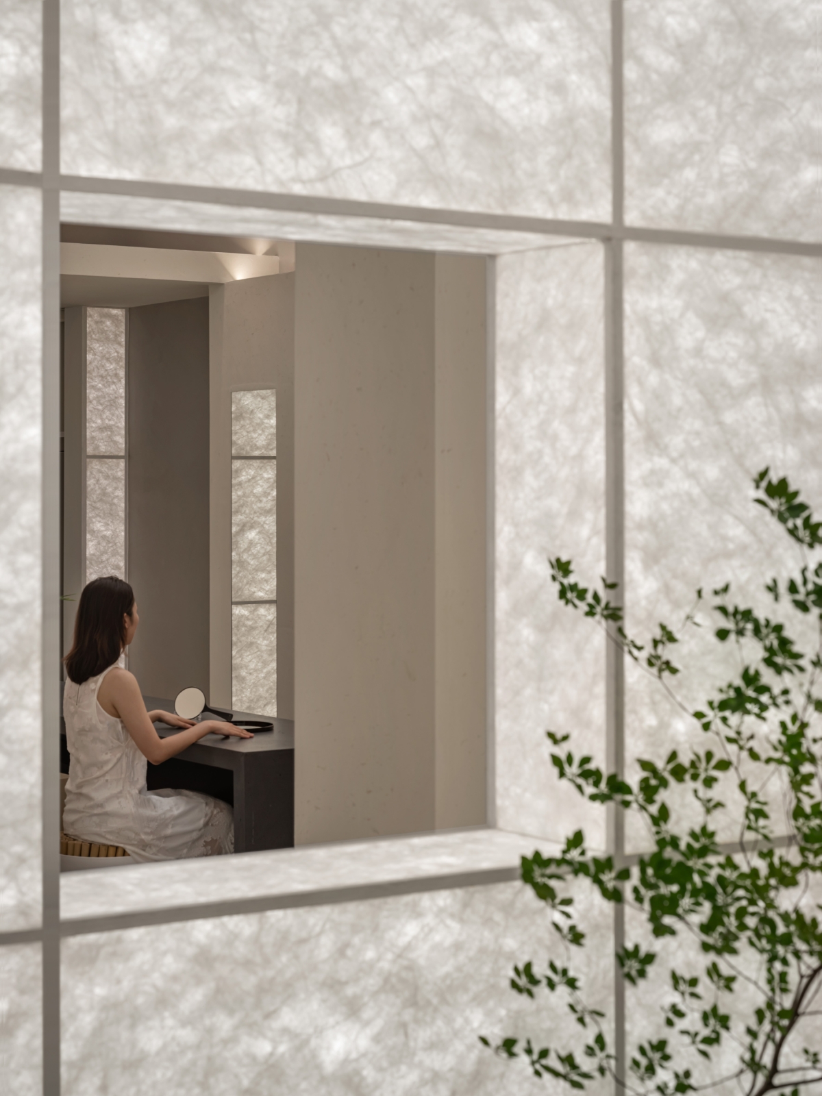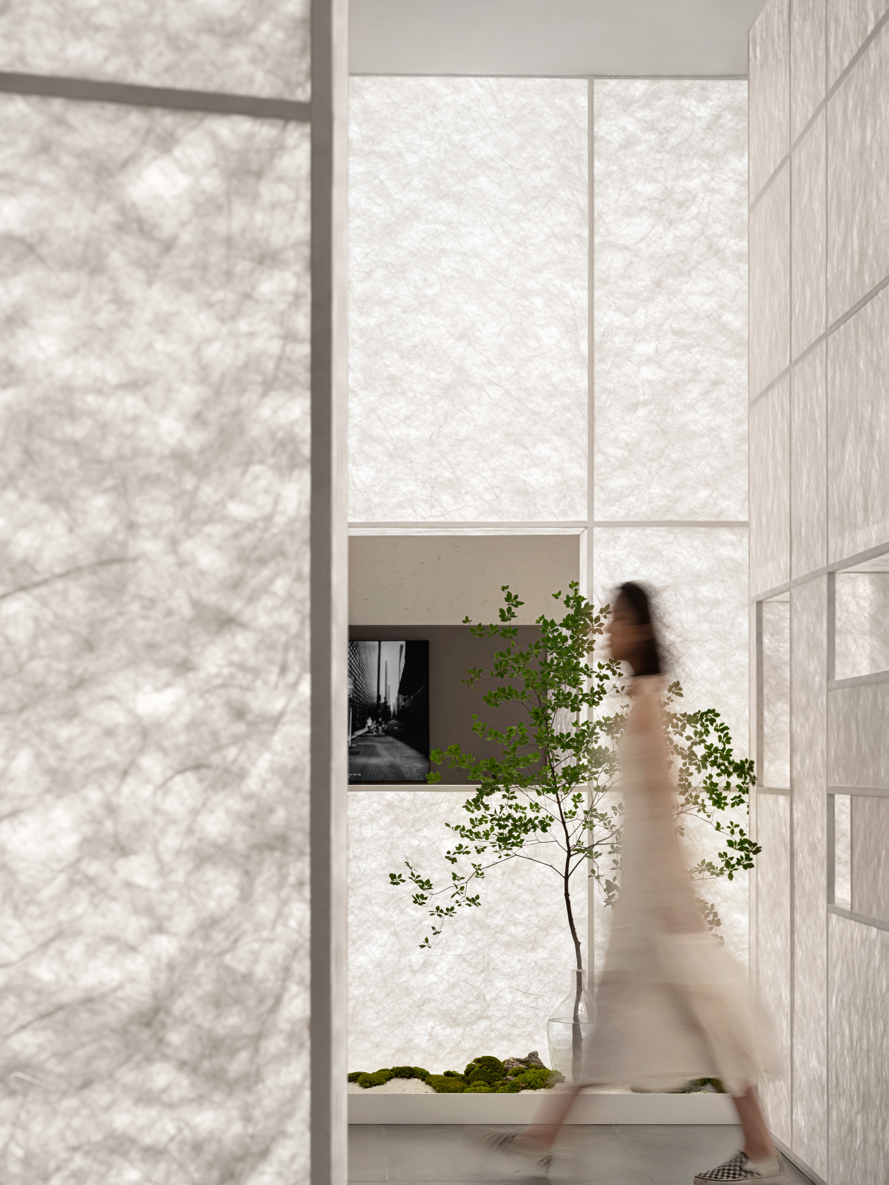 The project subtly combines contemporary context with Oriental charm. Pure geometrical elements and screen walls create a fluid, open space. Synthetic materials such as glass, metal and Tyvek paper are utilized. The project adopts Oriental simplistic aesthetics, and creates contrasting visual effects in the space. Inside the store's entrance, Tyvek paper forms a pure luminous space where eyeglasses are displayed.