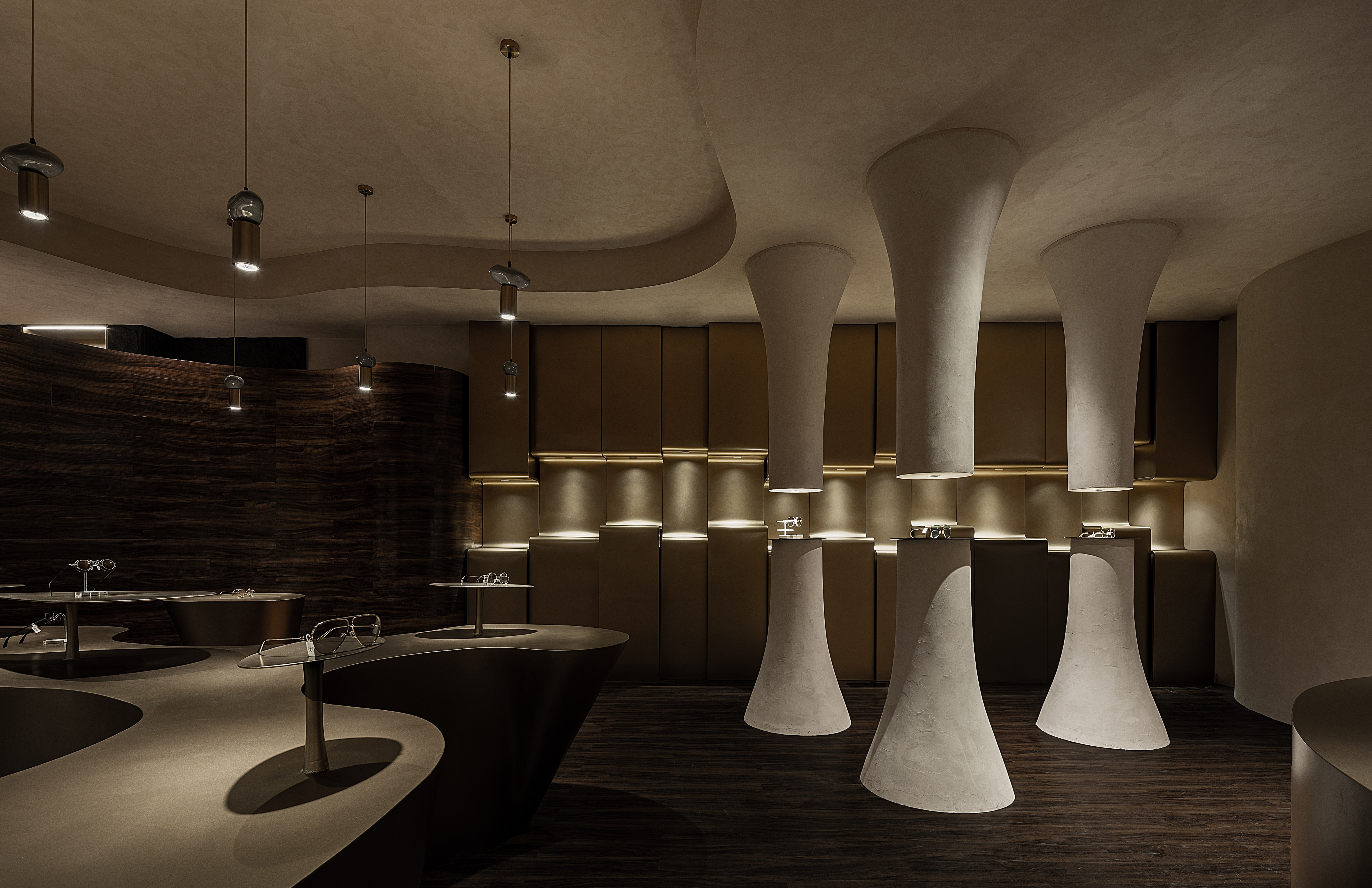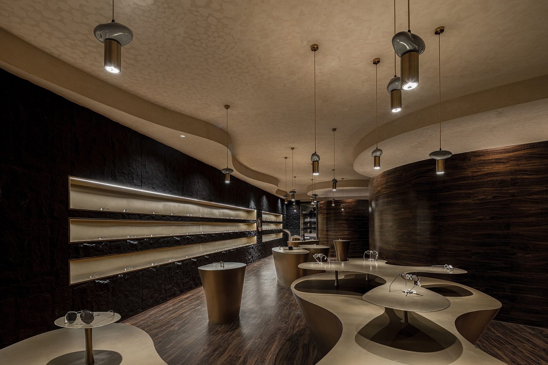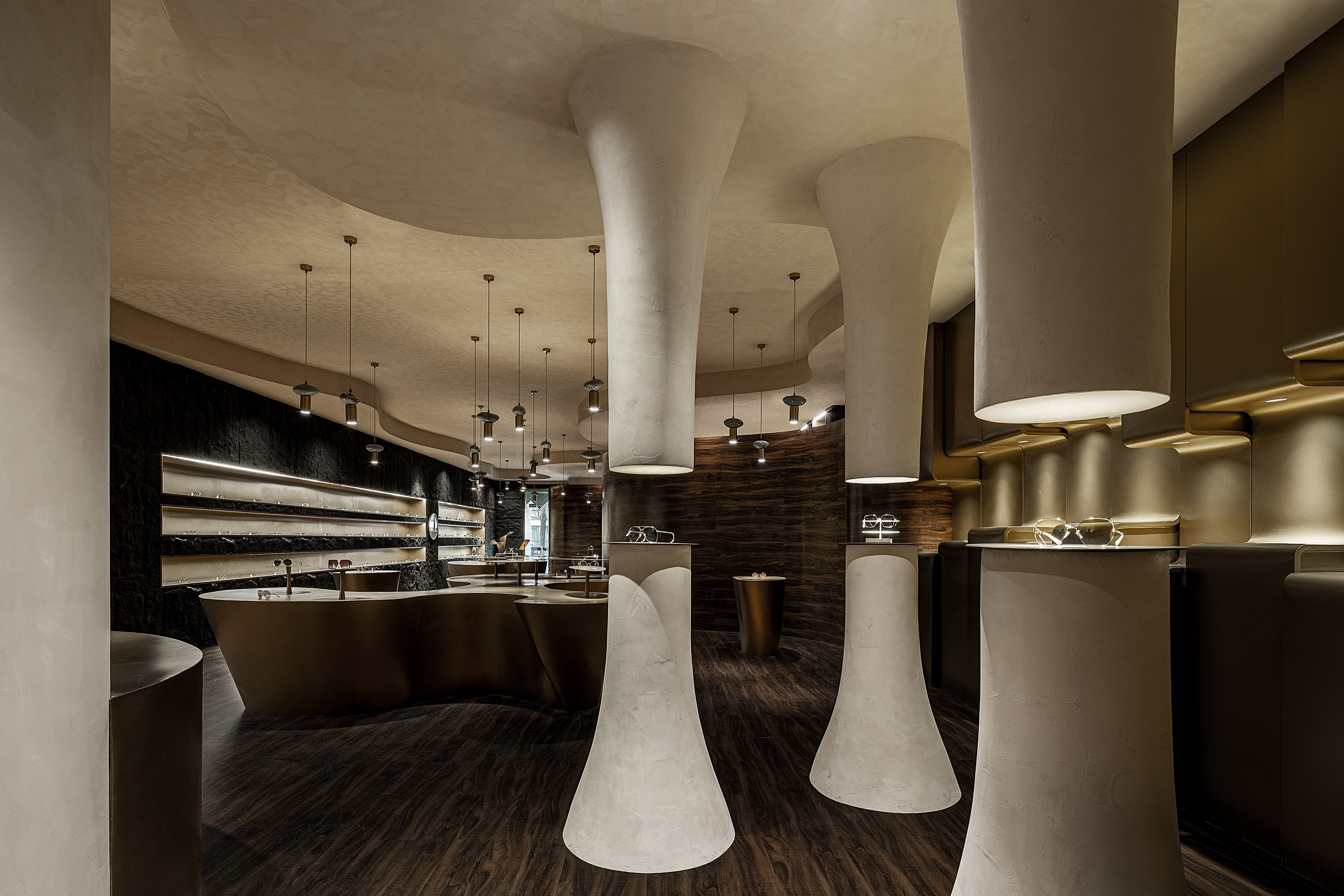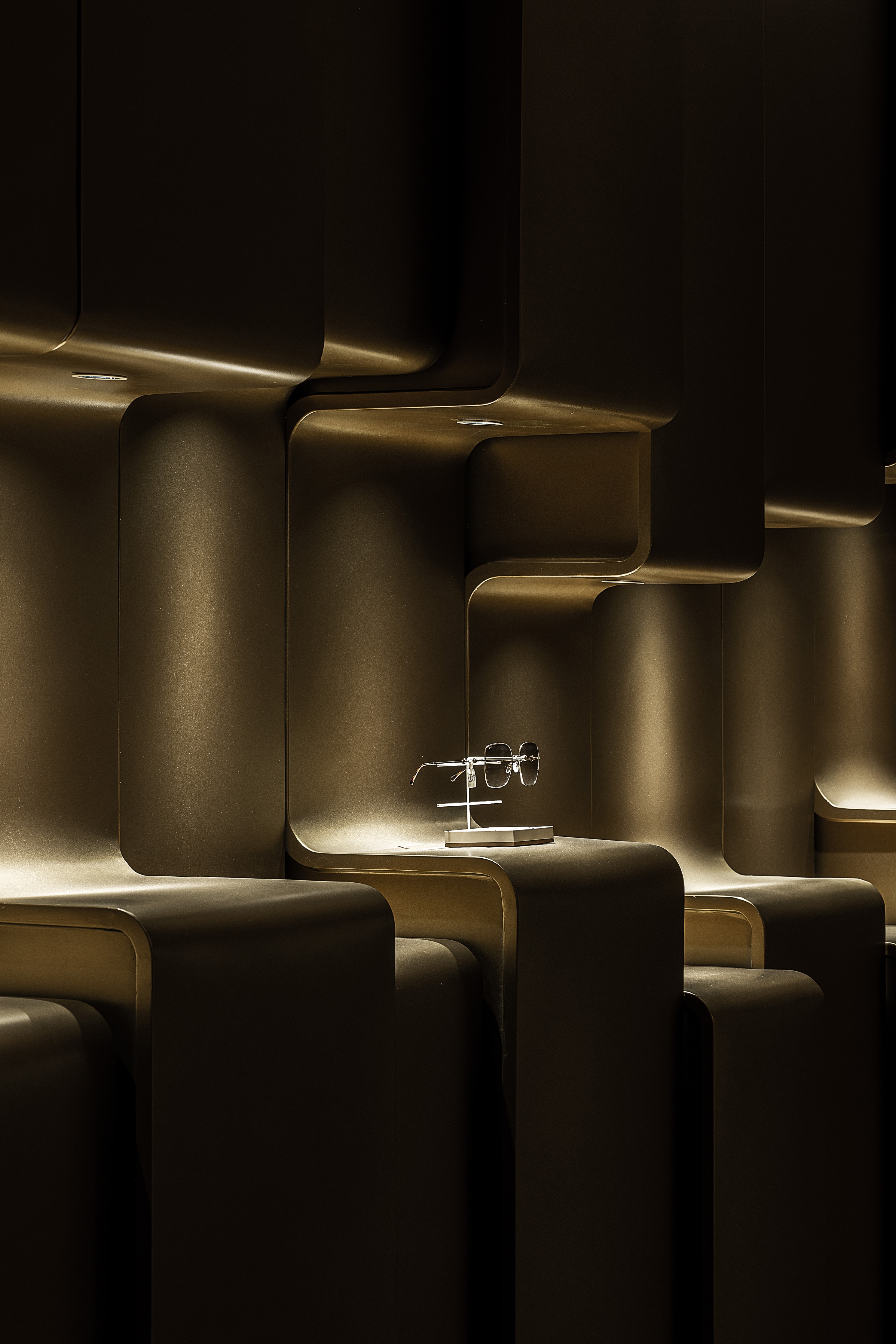 The project is a new business form layout of Lear, a brand rooted in Xi’an for years, in China Western Film Group TIME. It is positioned as a high-end customized brand. The design emphasizes the idea that less is more to show the classic style. The designer breaks the stereotype of traditional eyeglasses shops, puts art and utility in the space, takes golden and black as the main colors and, with a mindset of museum display, highlights the textures and details of each pair of glasses. The space also enriches the customer experience with various forms of booths. The decorative columns of the booths are derived from the shape and design concept of trees. They respectively “grow” up and down, with infinite extension, to expand the spatial vision wide and deep, and give the space more dimensions. The opposite “tree trunks” serve as booths to display glasses. At the other end, the top-down trunks become light sources, each of which creates real effects rather than mere modeling.