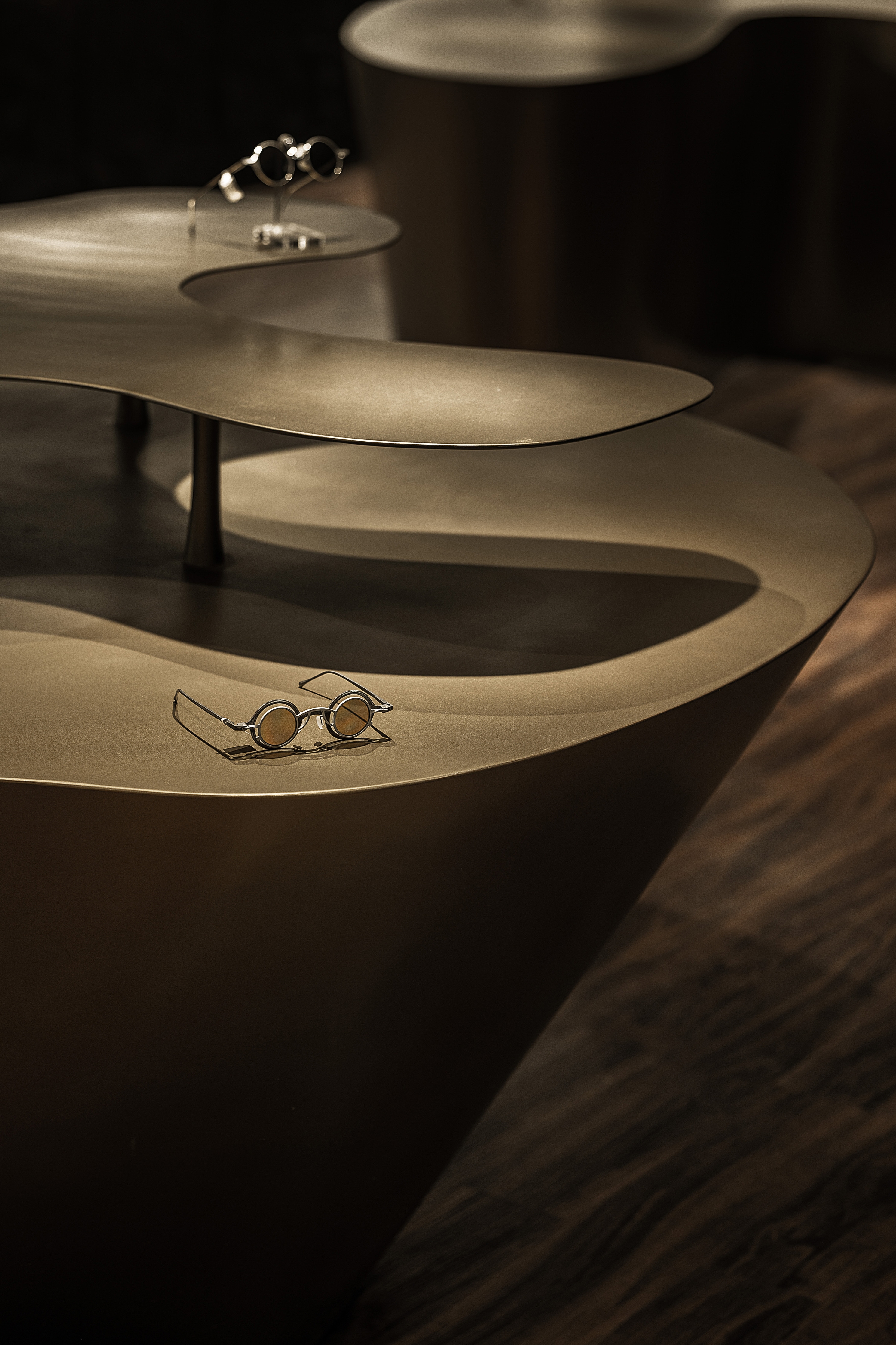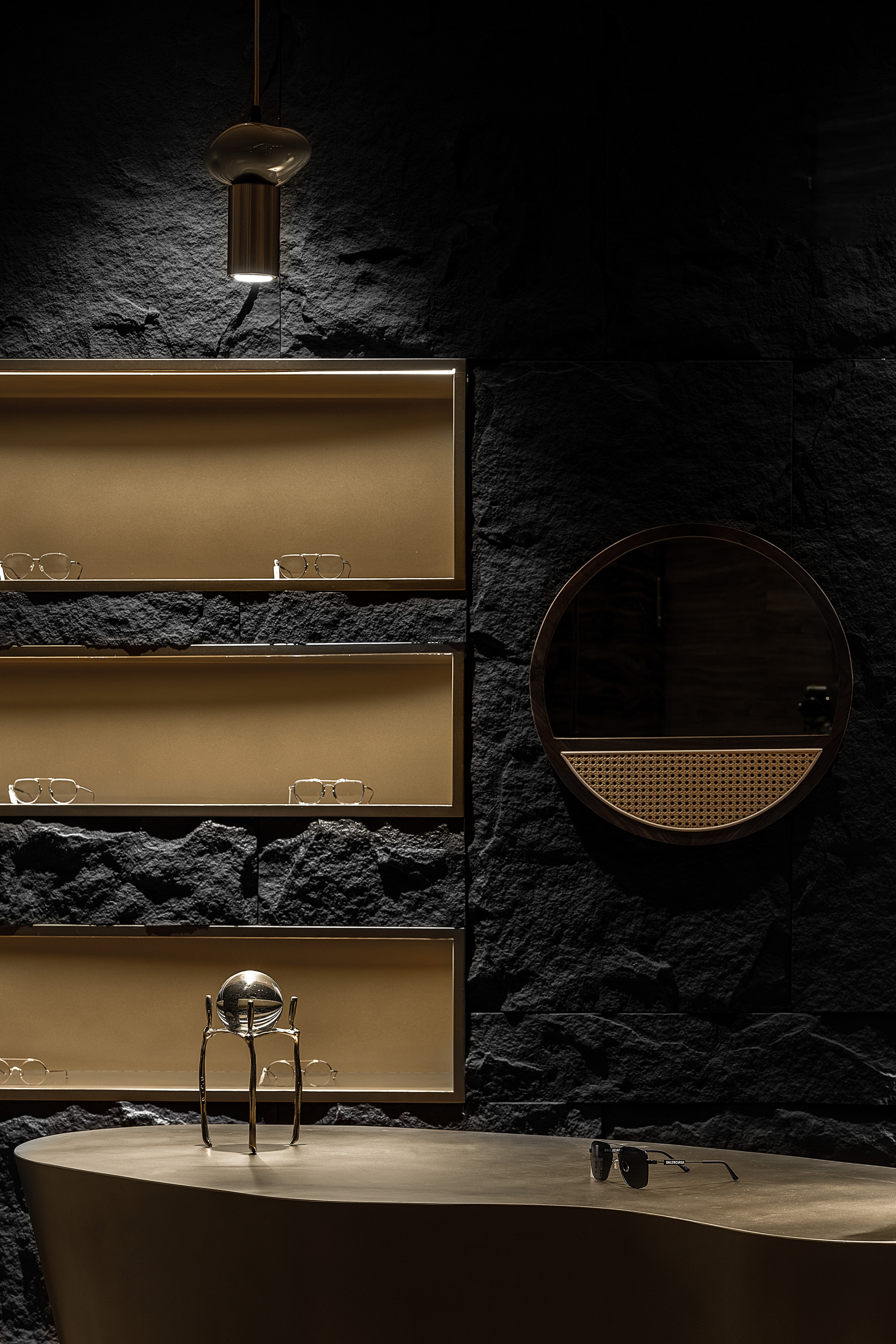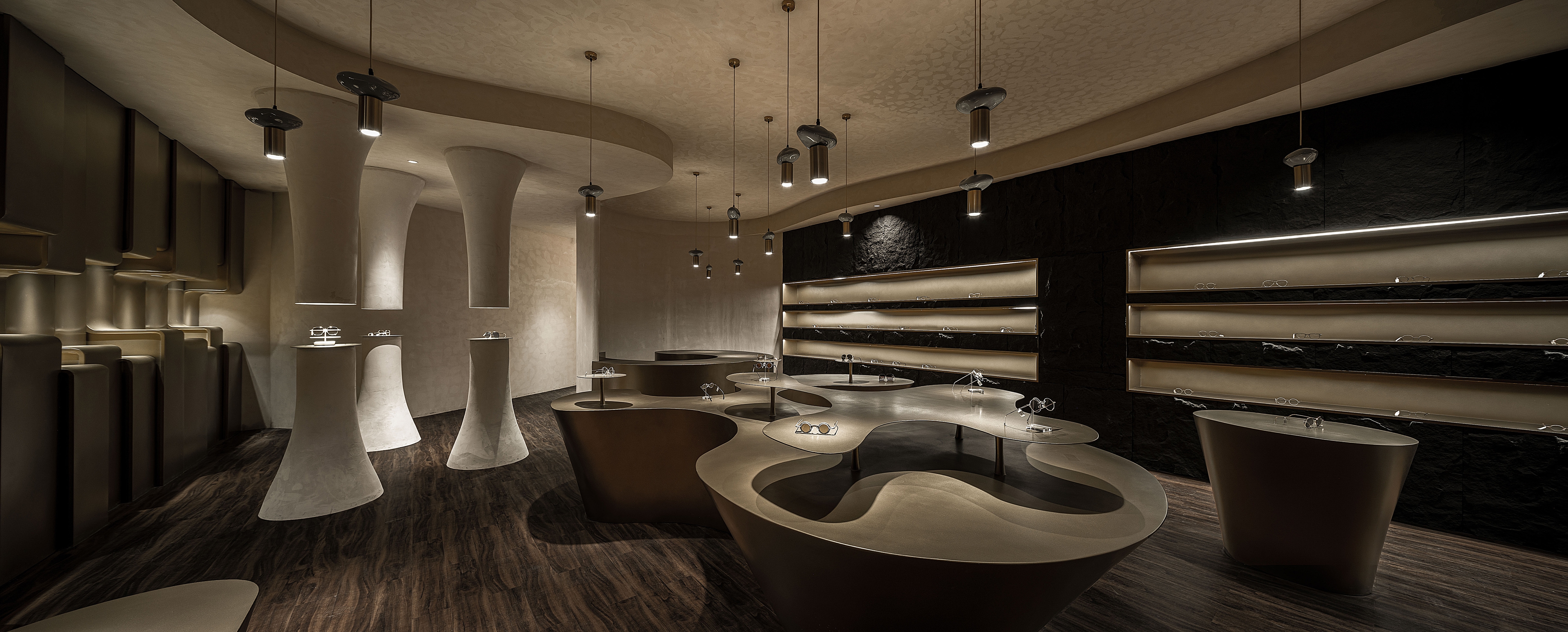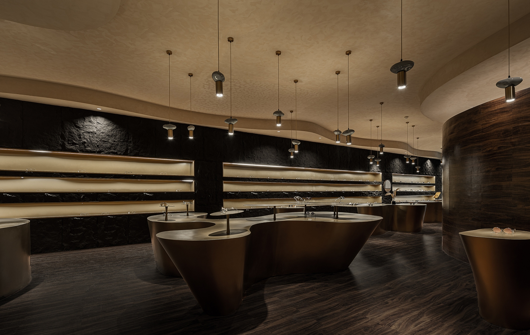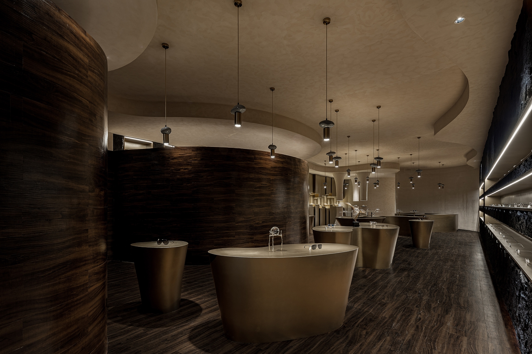 The project is a new business form layout of Lear, a brand rooted in Xi’an for years, in China Western Film Group TIME. It is positioned as a high-end customized brand. The design emphasizes the idea that less is more to show the classic style. The designer breaks the stereotype of traditional eyeglasses shops, puts art and utility in the space, takes golden and black as the main colors and, with a mindset of museum display, highlights the textures and details of each pair of glasses. The space also enriches the customer experience with various forms of booths. The decorative columns of the booths are derived from the shape and design concept of trees. They respectively “grow” up and down, with infinite extension, to expand the spatial vision wide and deep, and give the space more dimensions. The opposite “tree trunks” serve as booths to display glasses. At the other end, the top-down trunks become light sources, each of which creates real effects rather than mere modeling.