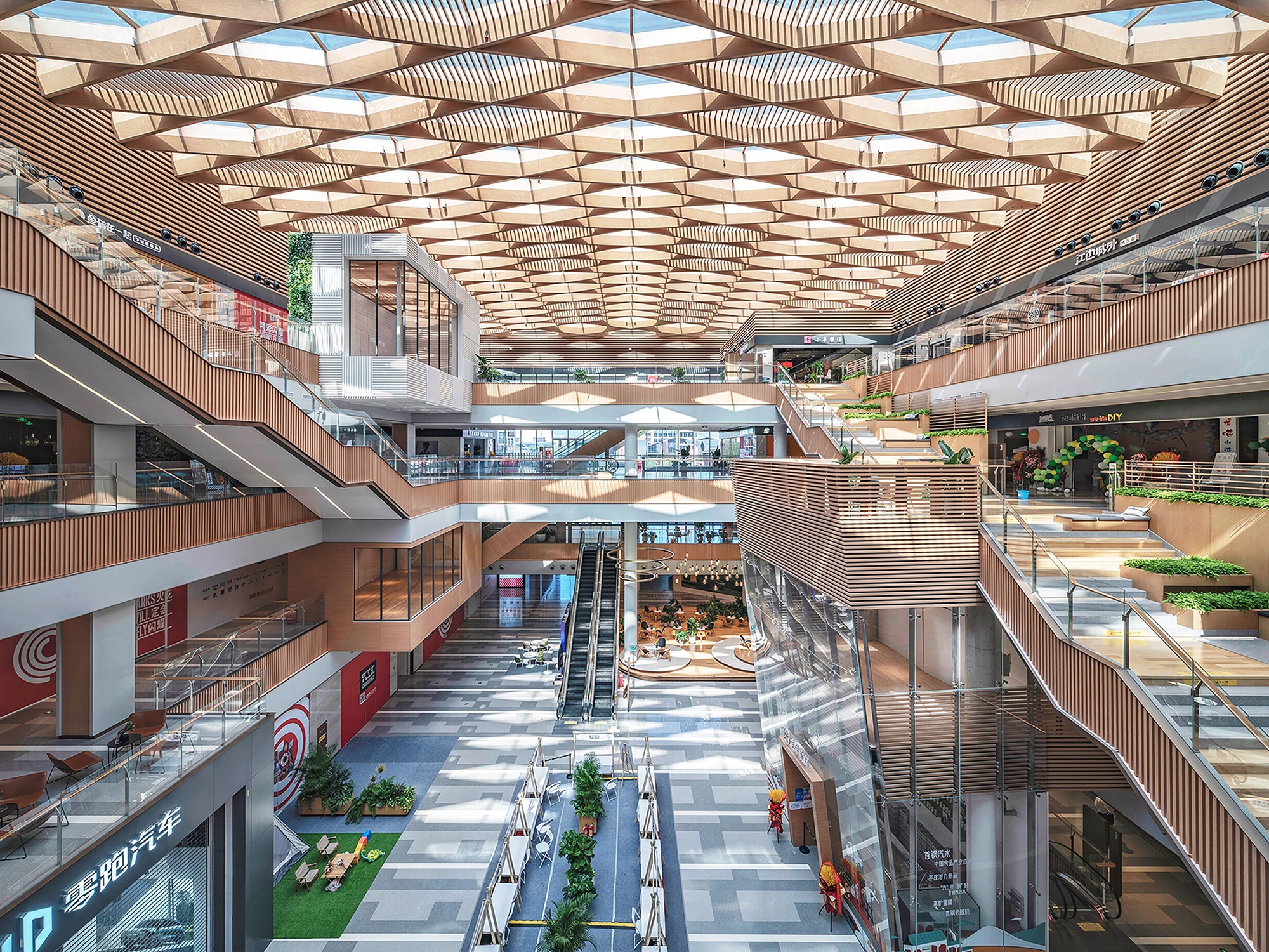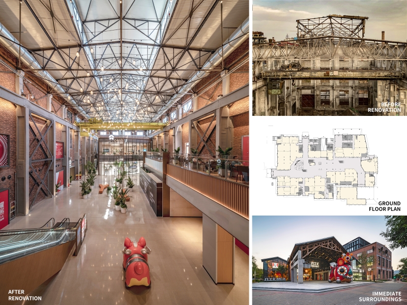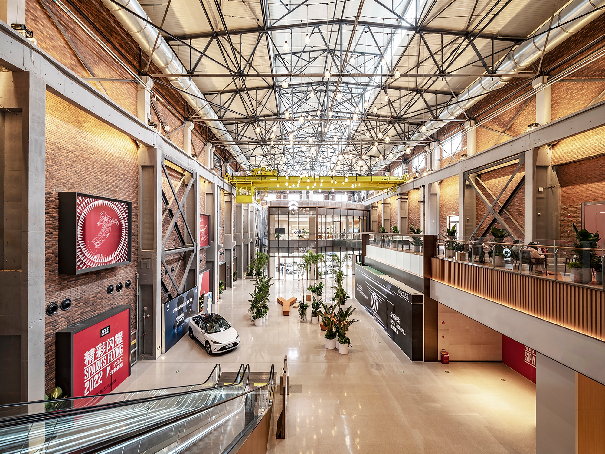 The project is located in the northern part of Beijing's Shougang Park, which was constructed in 1919 and epitomizes the golden era of China's steel industry. As a new commercial landmark, Chang'An Mills inherits Shougang's industrial legacy while forging a brighter future. In doing so, we explored not only the synthesis of past and present, but the ability to create a shared space that meets the needs of the current consumer experience, while retaining dynamic and interactive elements. The old site’s Fan Room was built in 1992, after the renovations, it now functions as the project’s main entrance and east atrium. The project’s authentic industrial atmosphere proved to be the core modeling concept for the design; the original truss structure, overhead crane and structural columns have been preserved in their original form, together with the red brick texture of the old factory façade. The peoject uses diamond-shaped array, semi-permeable boxes of various dimensions which can be dynamically used for retail and stairways in the new-building space, allows people to travel through time and space and experience the singular atmosphere of this place.