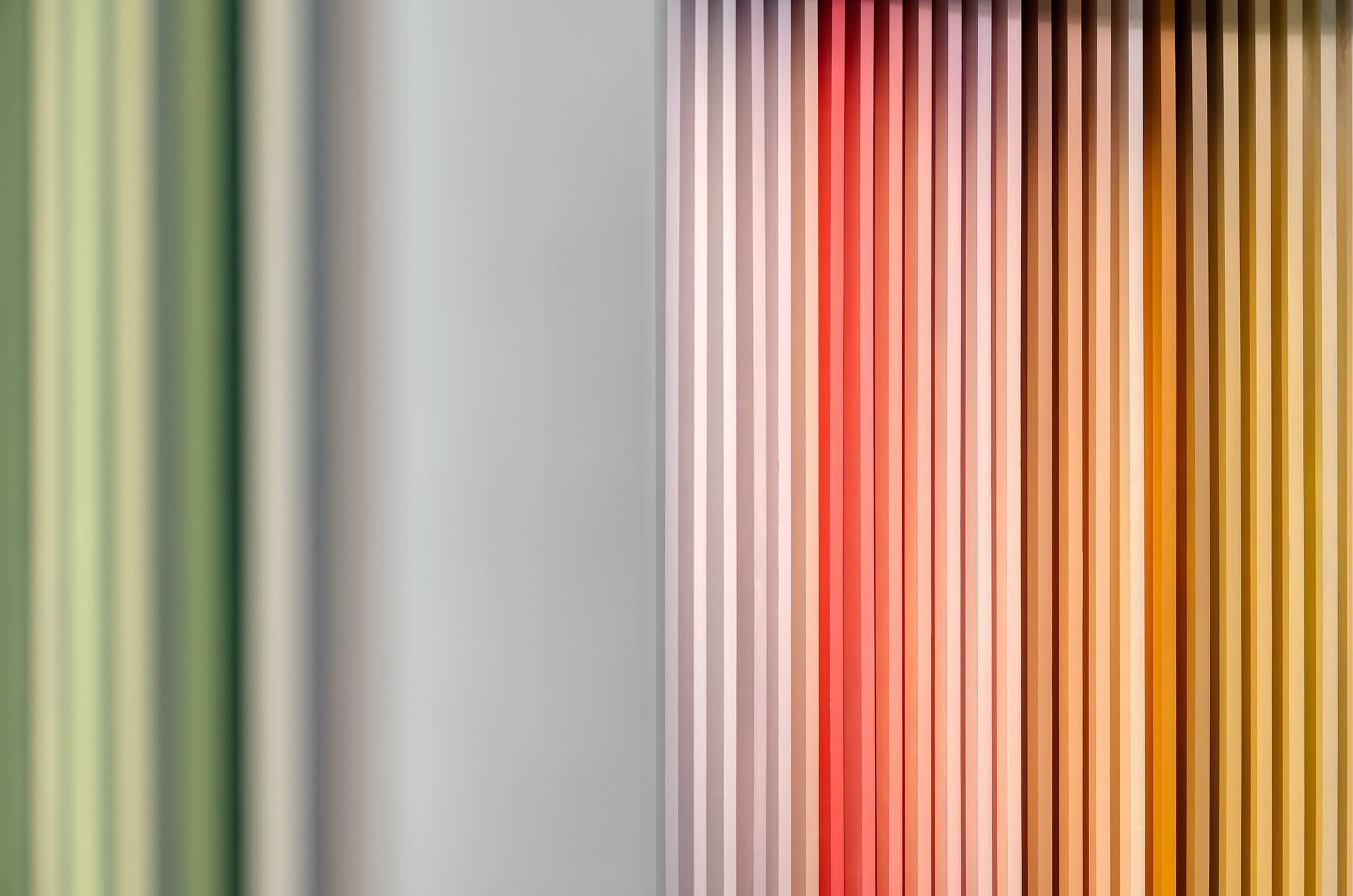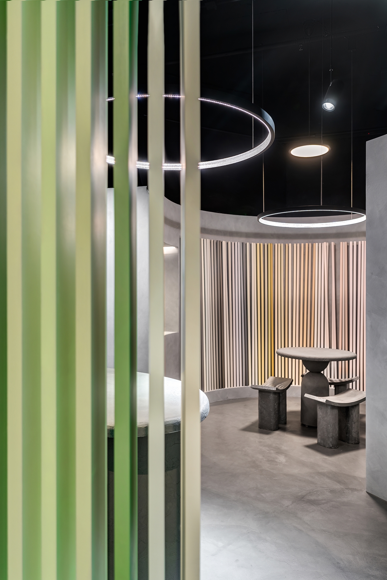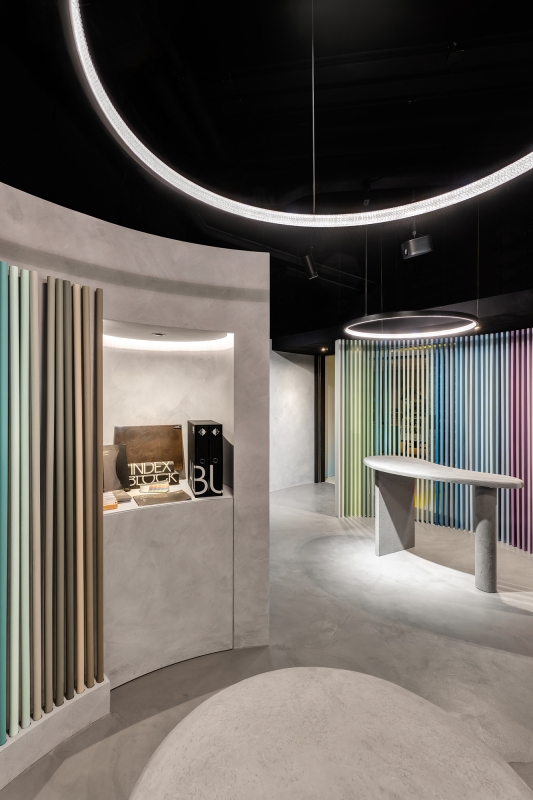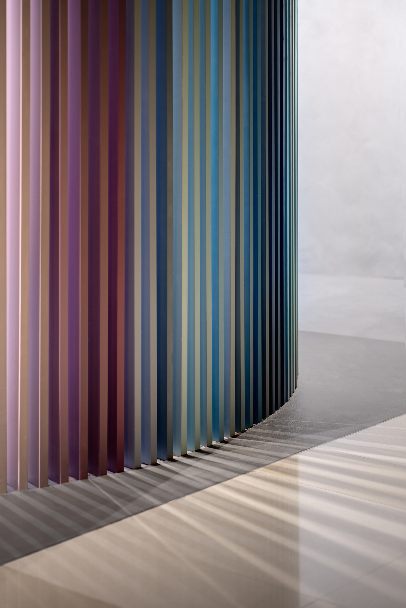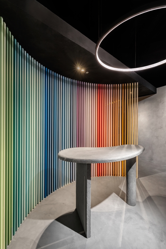 Original floor plan of this store was a polygon, which being segmented perfectly by circles to two meeting areas, passage & storages with 65 sticks, all painted with different colour from Valpaint collection, working as partition and also the display at the same time; Interval between sticks enable enough lights but keep certain privacy to who using meeting area.