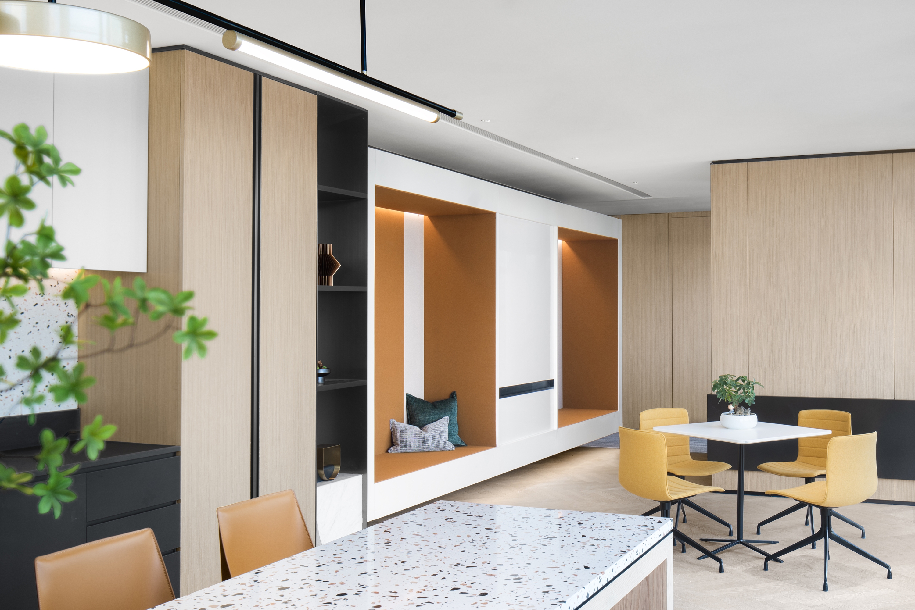 The designers adopted a simple spatial language to express the space, and enriched the space with materials of different textures to break its inherent form. The design team set up “boxes” similar to display windows to bring taste to the space, create a vibrant atmosphere and enrich the spatial layers.