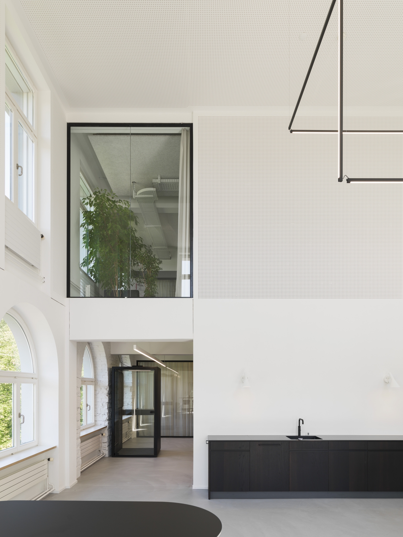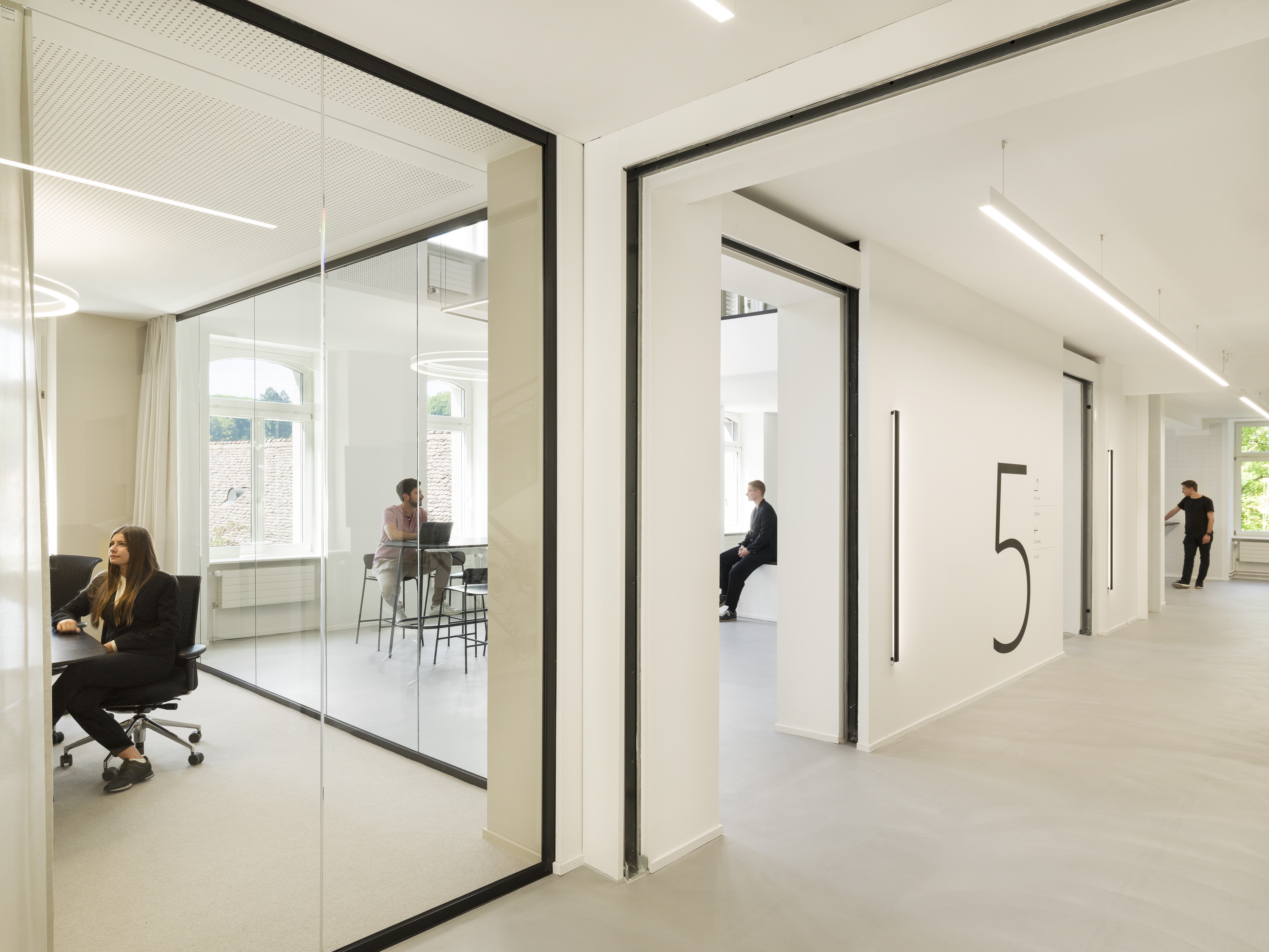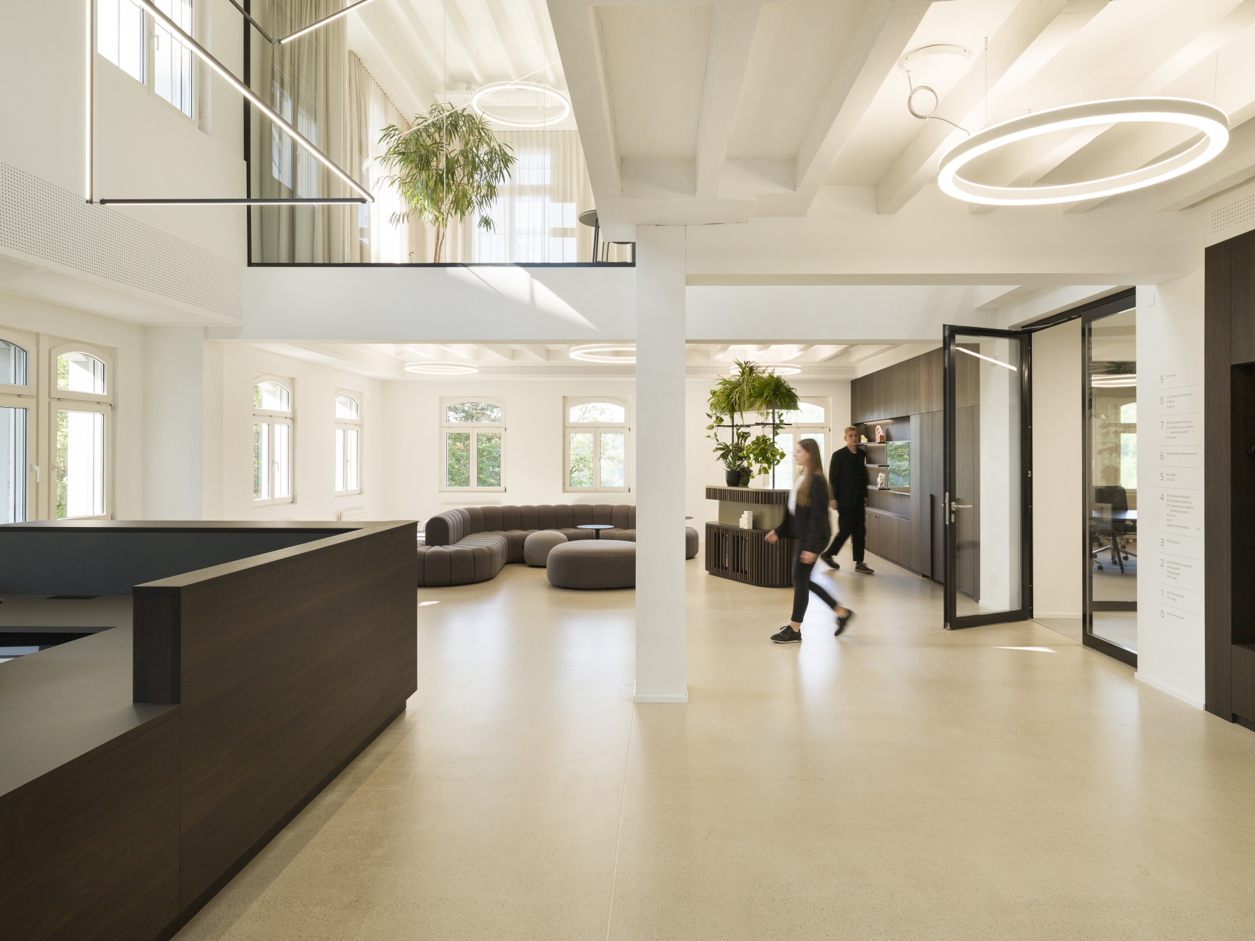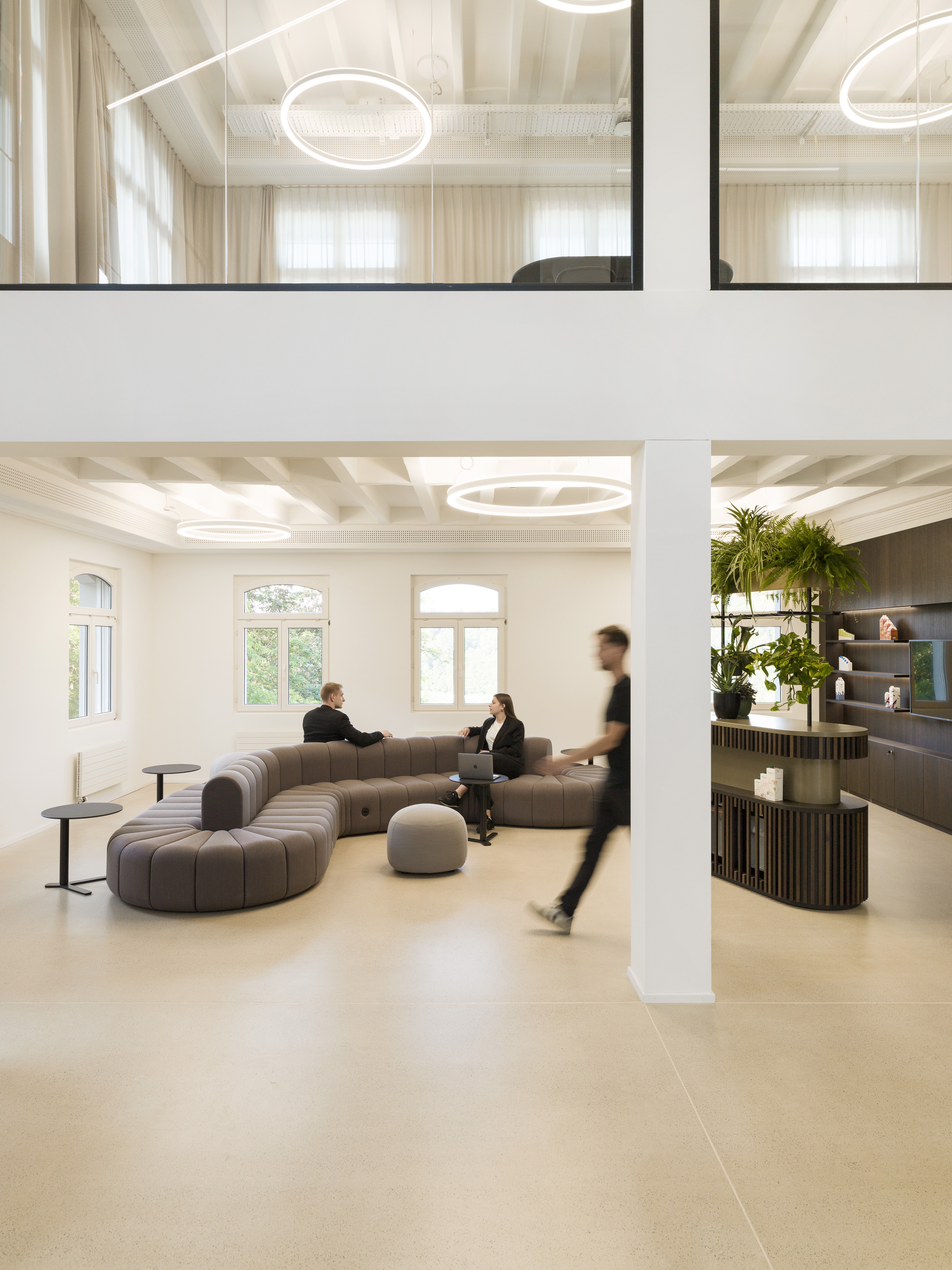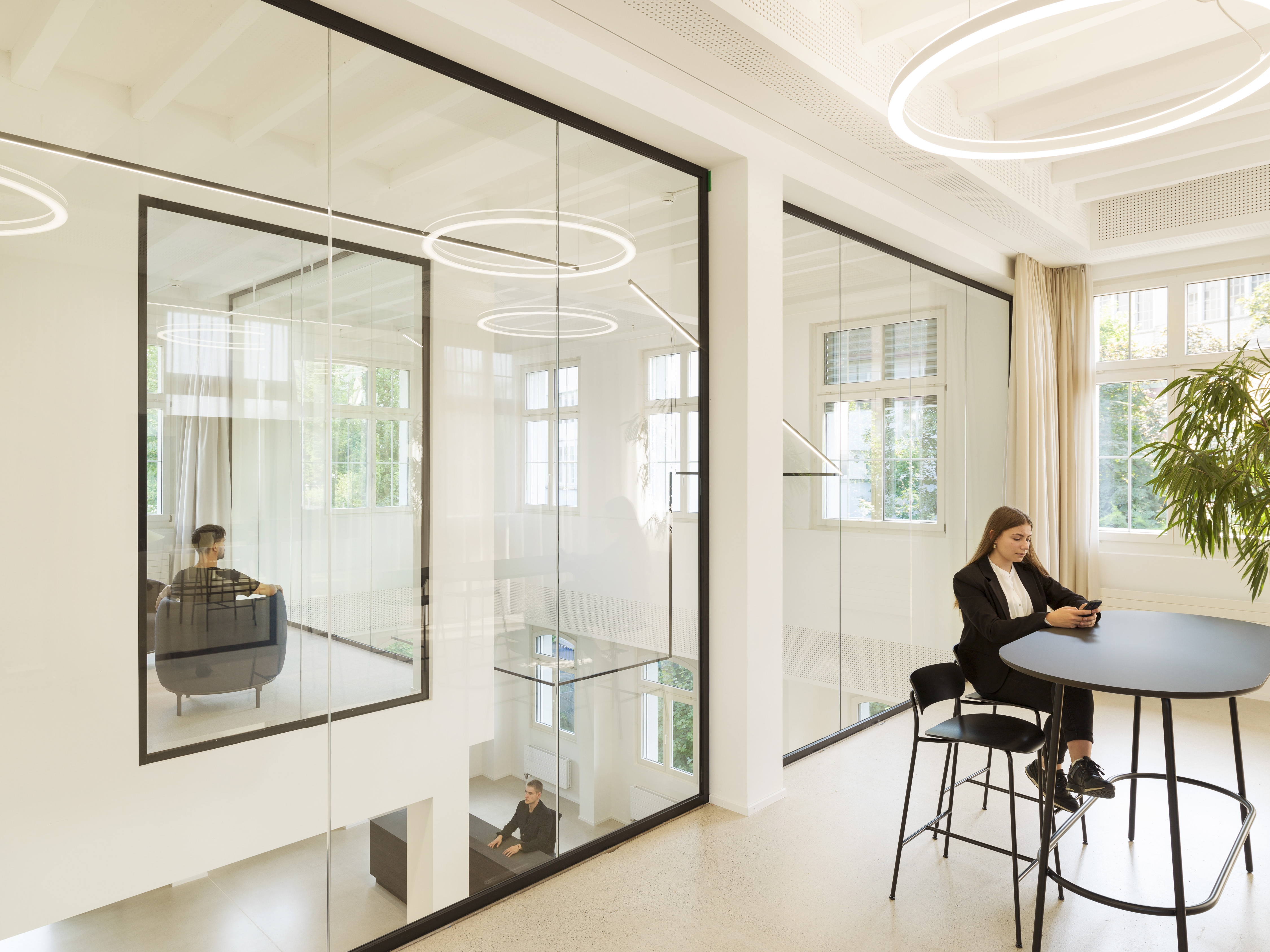 Within the existing exterior of this nationally protected monument, Dost develops a flowing spatial concept. Cross-story ceiling openings connect sight lines, visually accessing the individual areas of the company through the meeting spaces. This creates a new feeling for the impressive building geometry and the exposed location. At the interface of the elevated and the longitudinal building, through the new connection within the house, a space of shared appreciation has been created. Where the actual quality of the current workplace design lies.