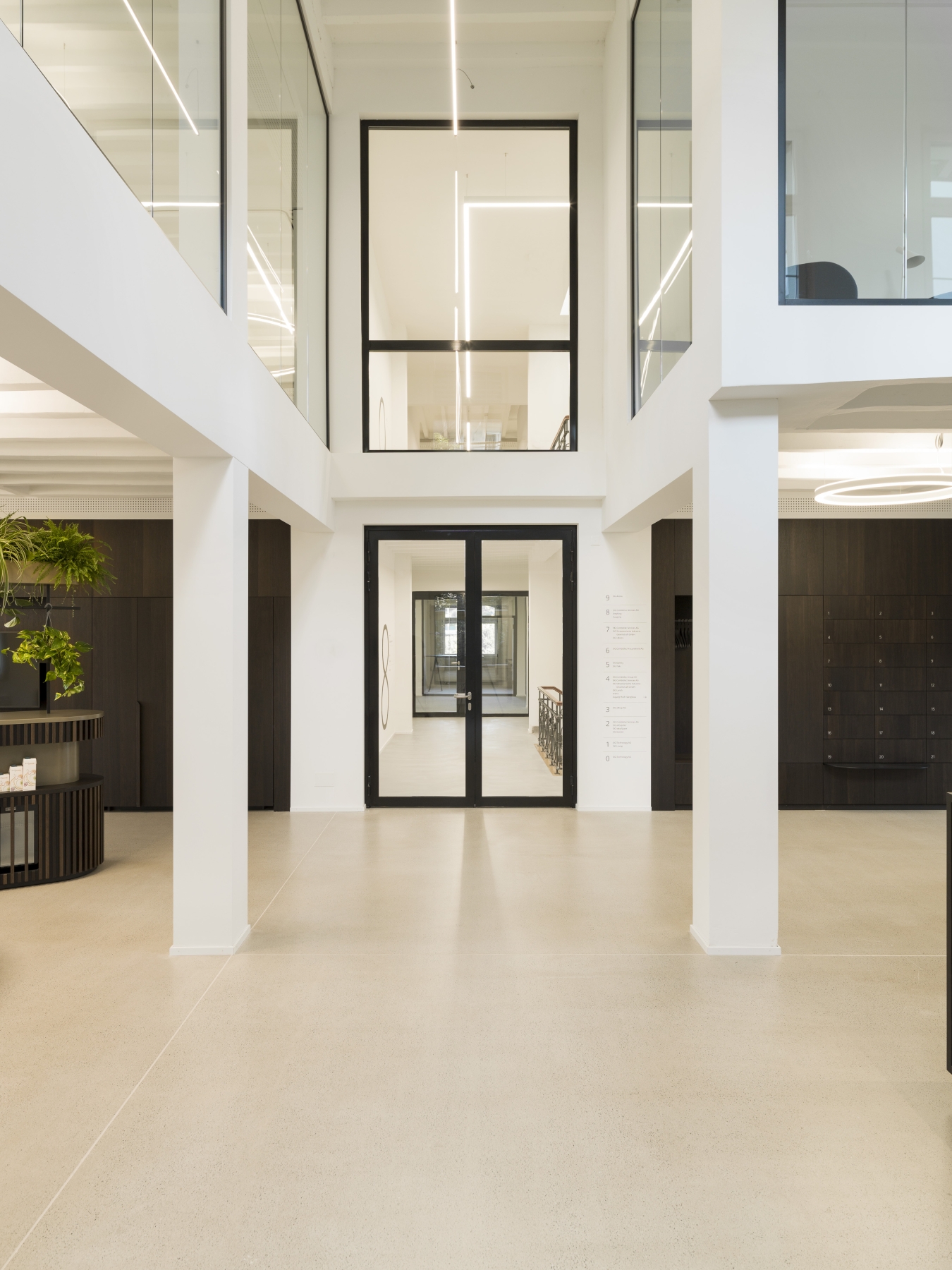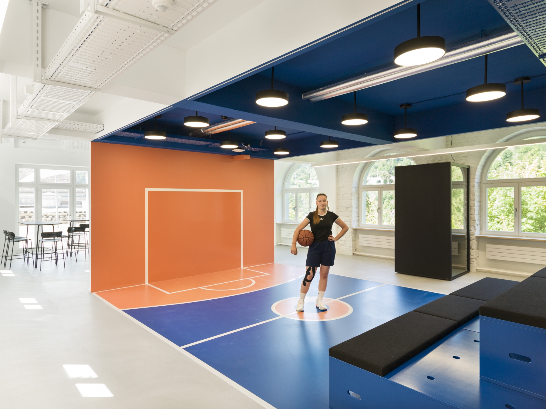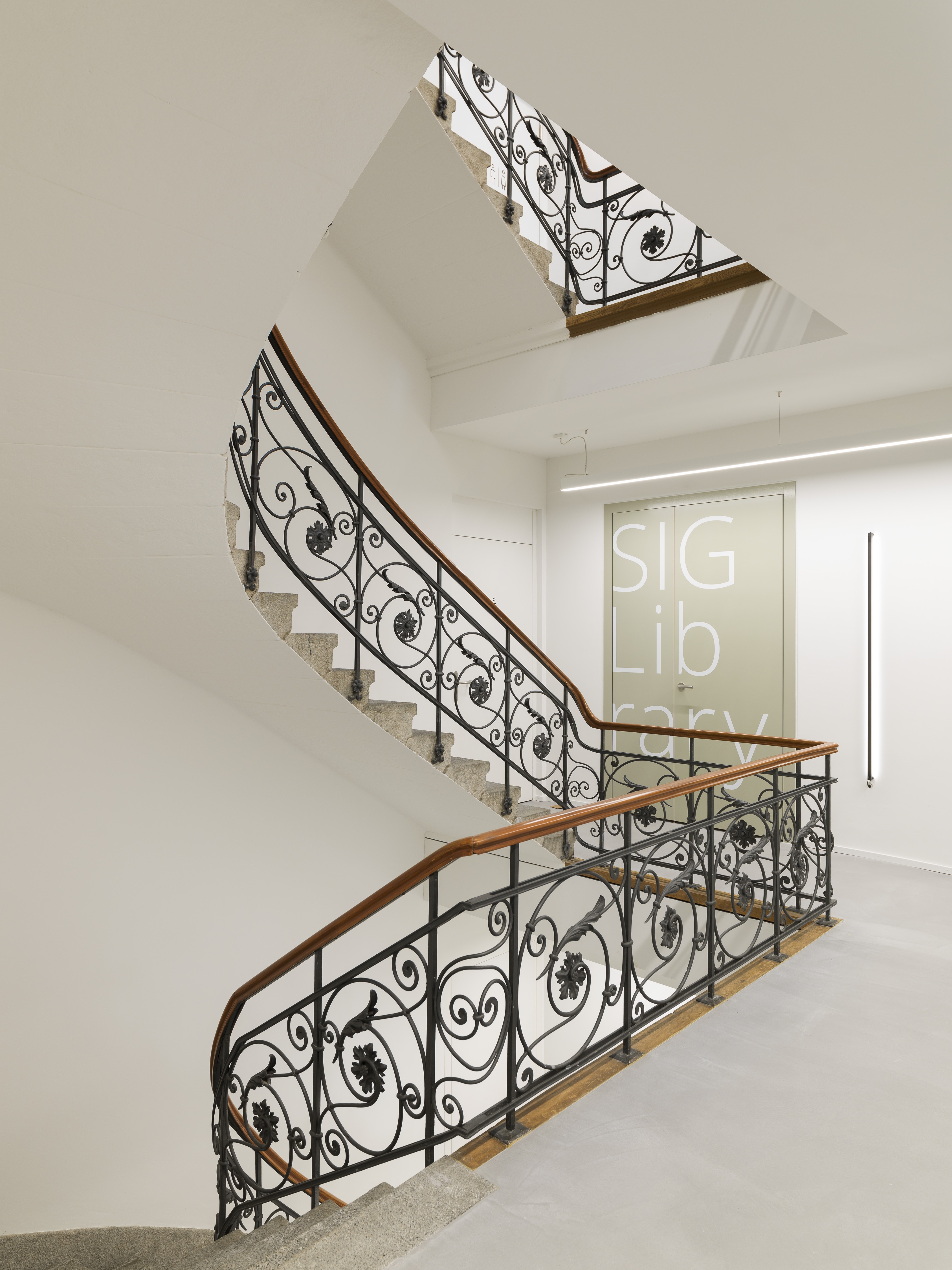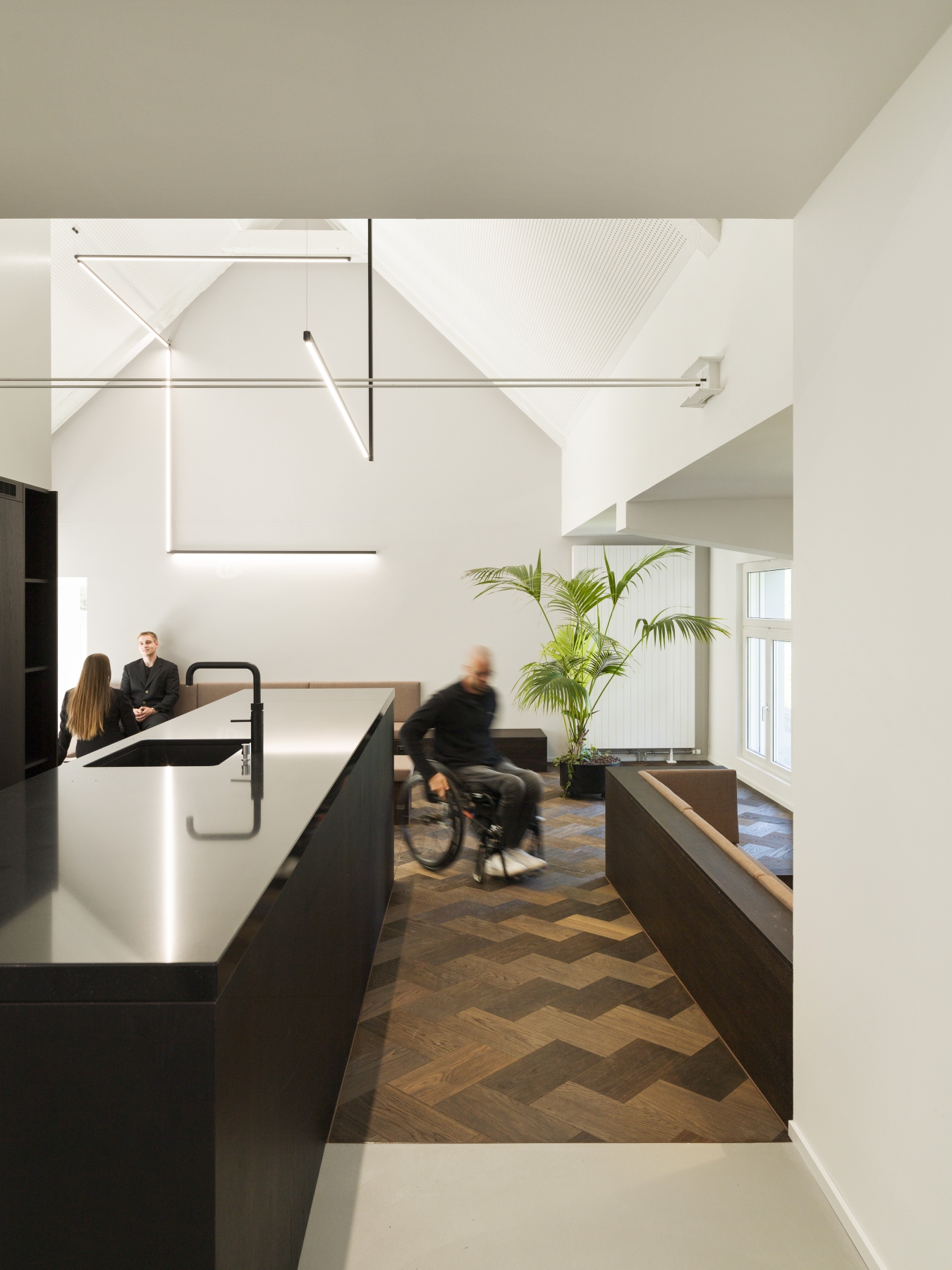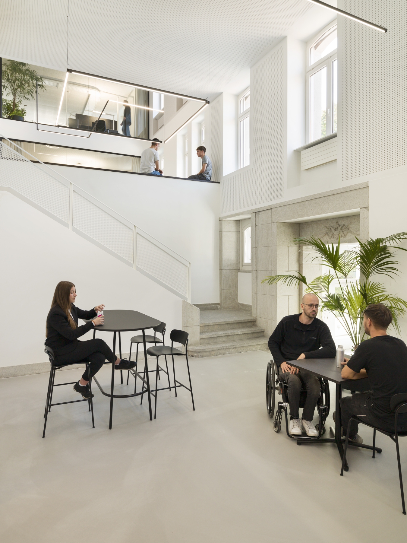 Within the existing exterior of this nationally protected monument, Dost develops a flowing spatial concept. Cross-story ceiling openings connect sight lines, visually accessing the individual areas of the company through the meeting spaces. This creates a new feeling for the impressive building geometry and the exposed location. At the interface of the elevated and the longitudinal building, through the new connection within the house, a space of shared appreciation has been created. Where the actual quality of the current workplace design lies.