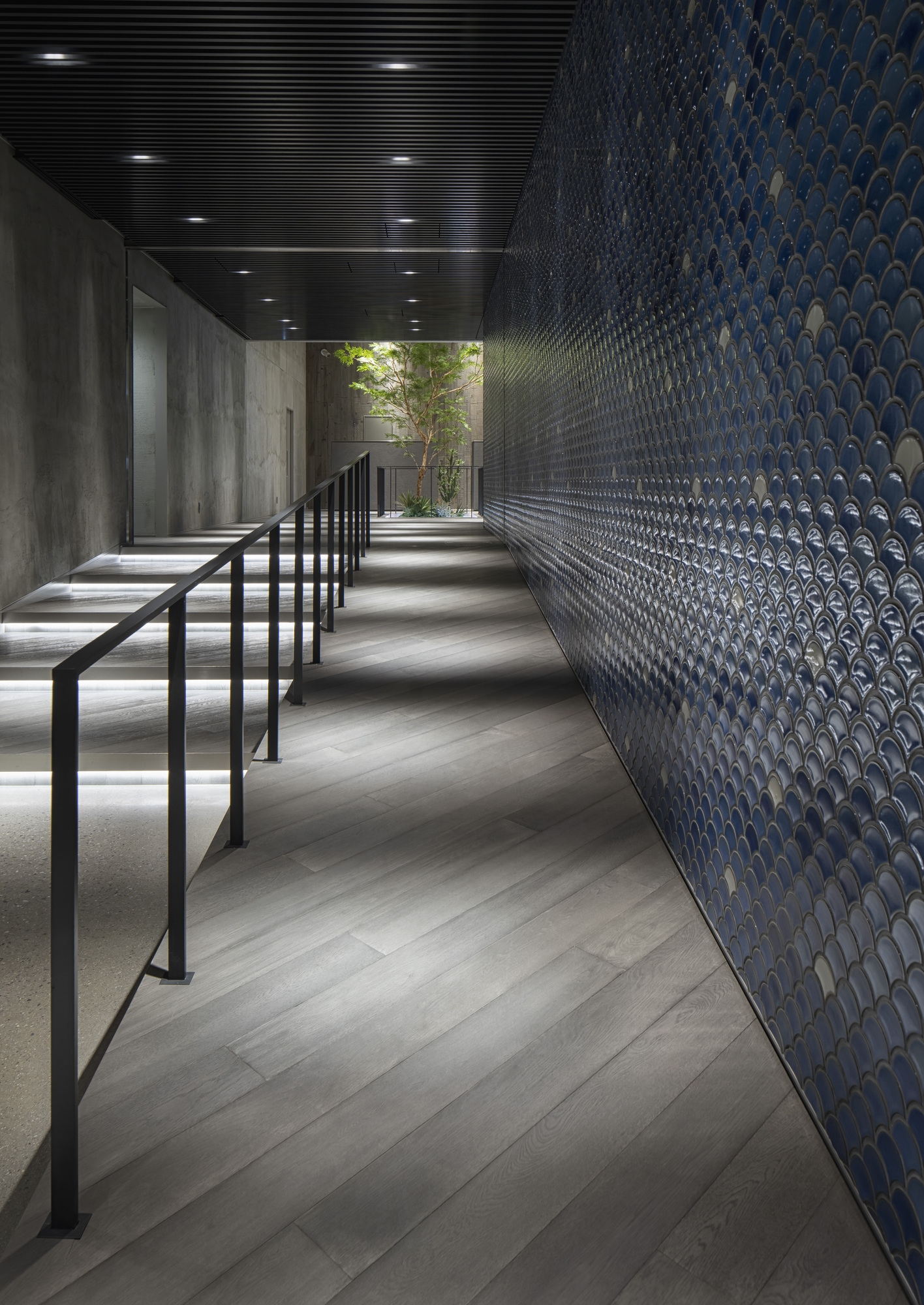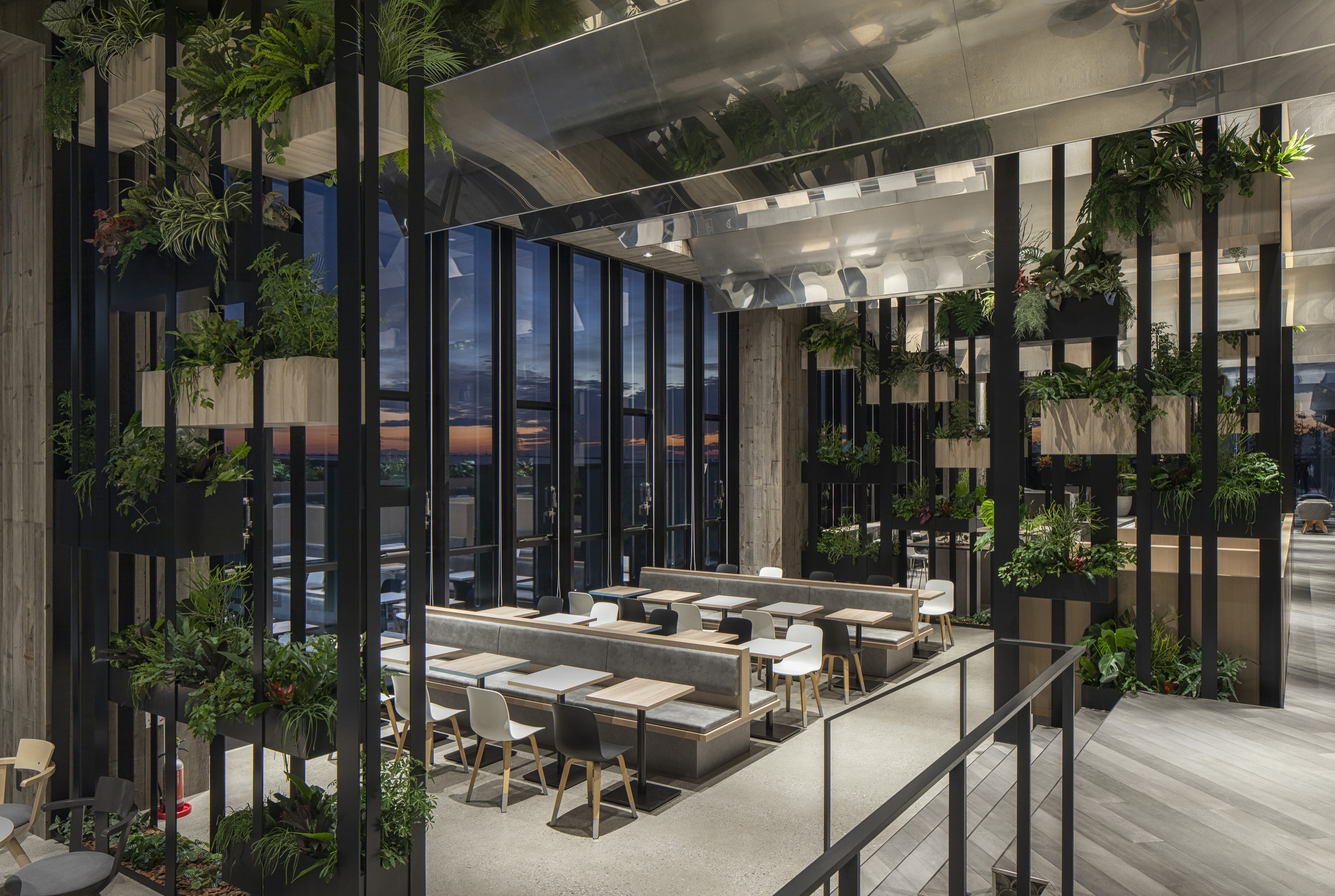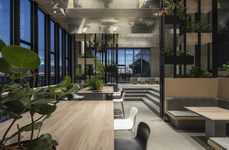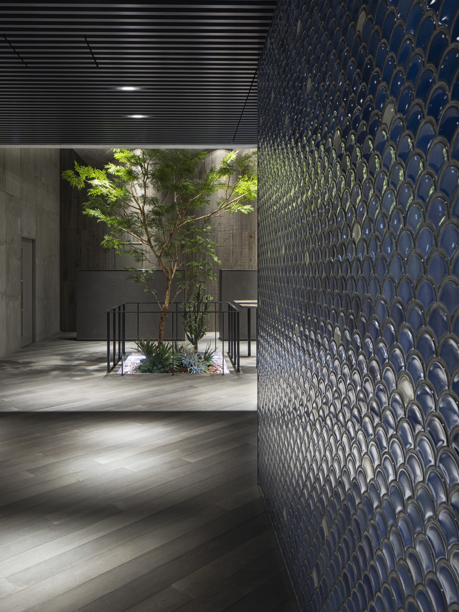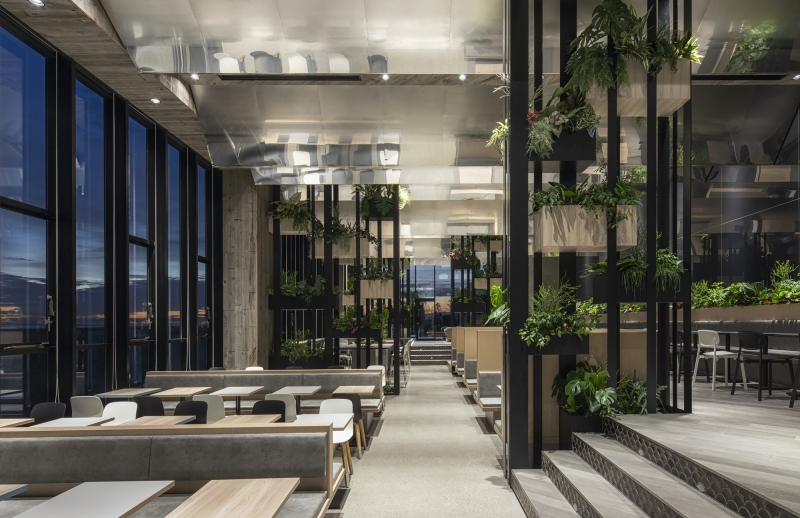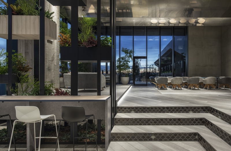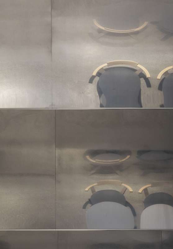 Since the amenity space was required to be both relaxing and healing, we have created a space where people can feel and sense the nature and sea of Australia, where Goodman Group headquarters are located. The entire space is designed to resemble the sea surface. This has been achieved by creating waves on the ceiling surface that come form the gradation to vibration of stainless steel processed onto the mirror face. By using the materials that reflect on the walls the movement of people, clouds and the sun, we have arranged a space where you can feel the fluctuations of the whole interior. On top of that, by making indoor plants look like seaweed we have expressed the underwater life.