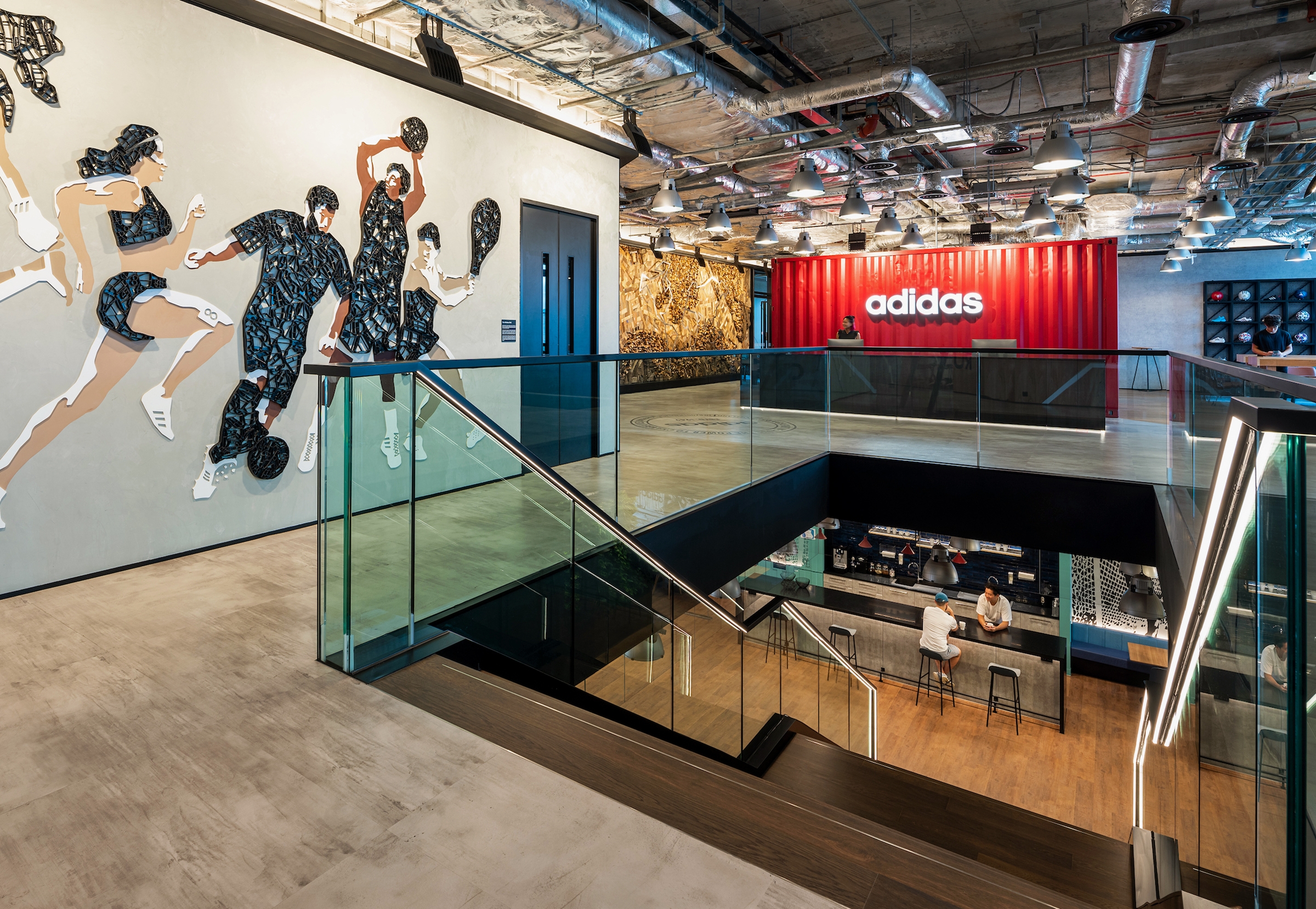A preloved shipping container is a spectacular showpiece, doubling as a mailroom and coffee bar. Serving as a tangible reminder of the practical reality of adidas’ global supply chain.