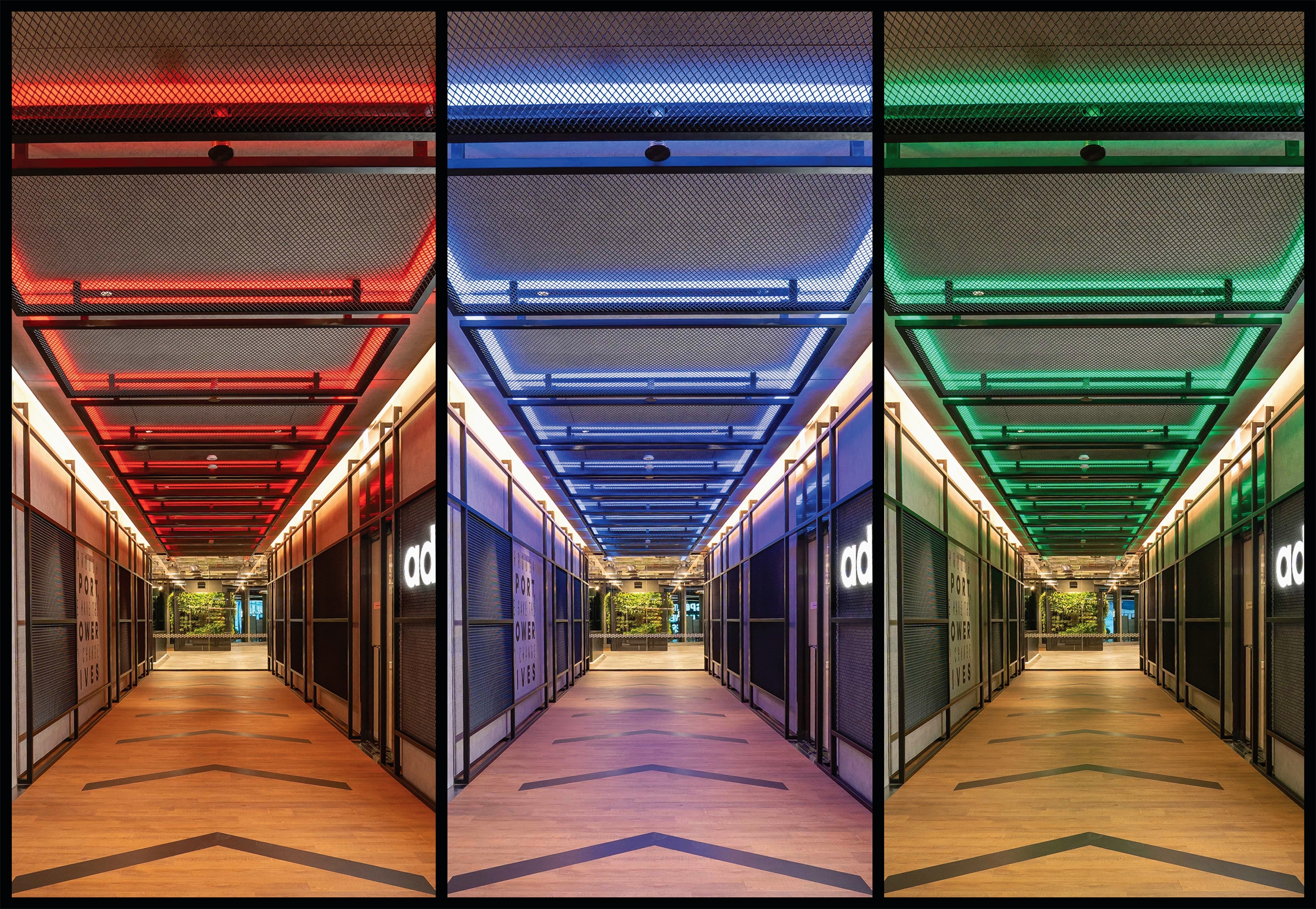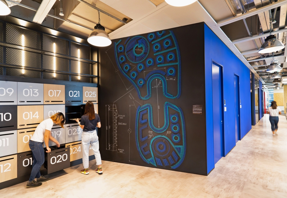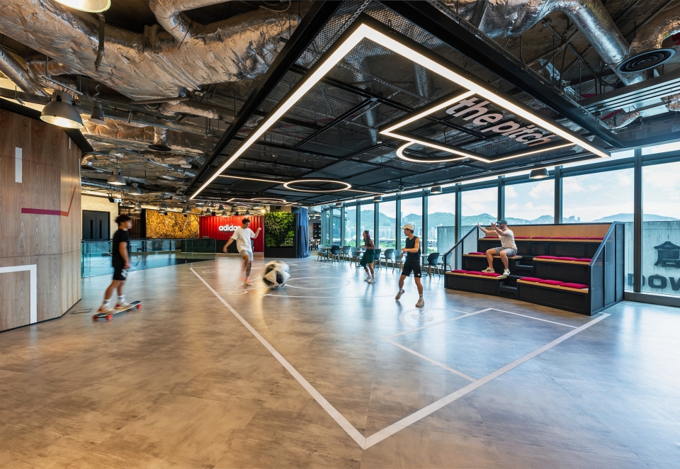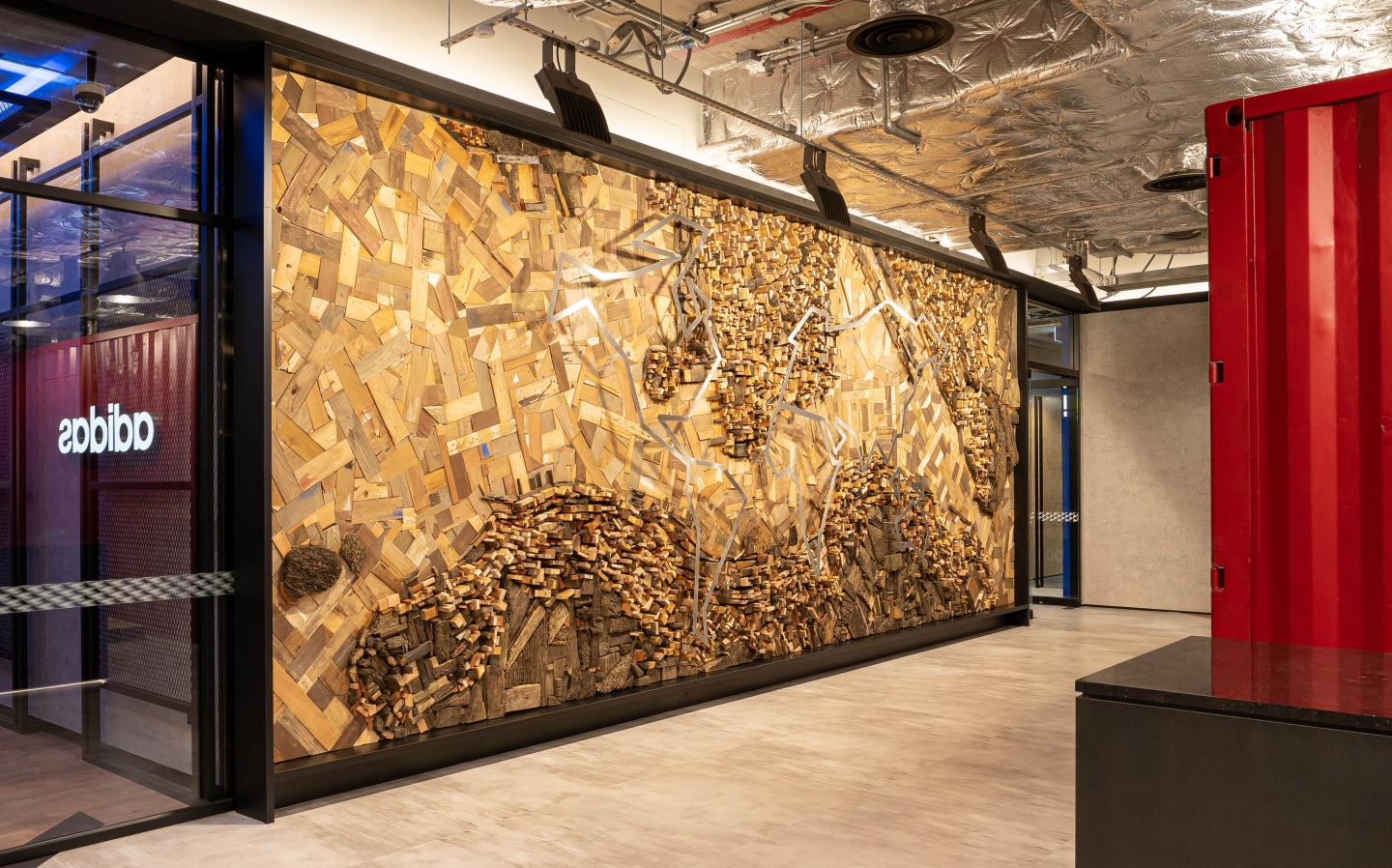 The space contains dynamic artworks celebrating adidas’ commitment to its location, history, and industry. A vast map, of repurposed wood, picks out every building in Hong Kong overlaid by a metallic outline of the world; a mural of the city’s vibrant sporting landscape celebrates iconic events; nail and string art is brought back using surplus shoelaces; and a monumental frieze presents a pantheon of sporting archetypes, constructed from up-cycled sneaker manufacturing dies.
