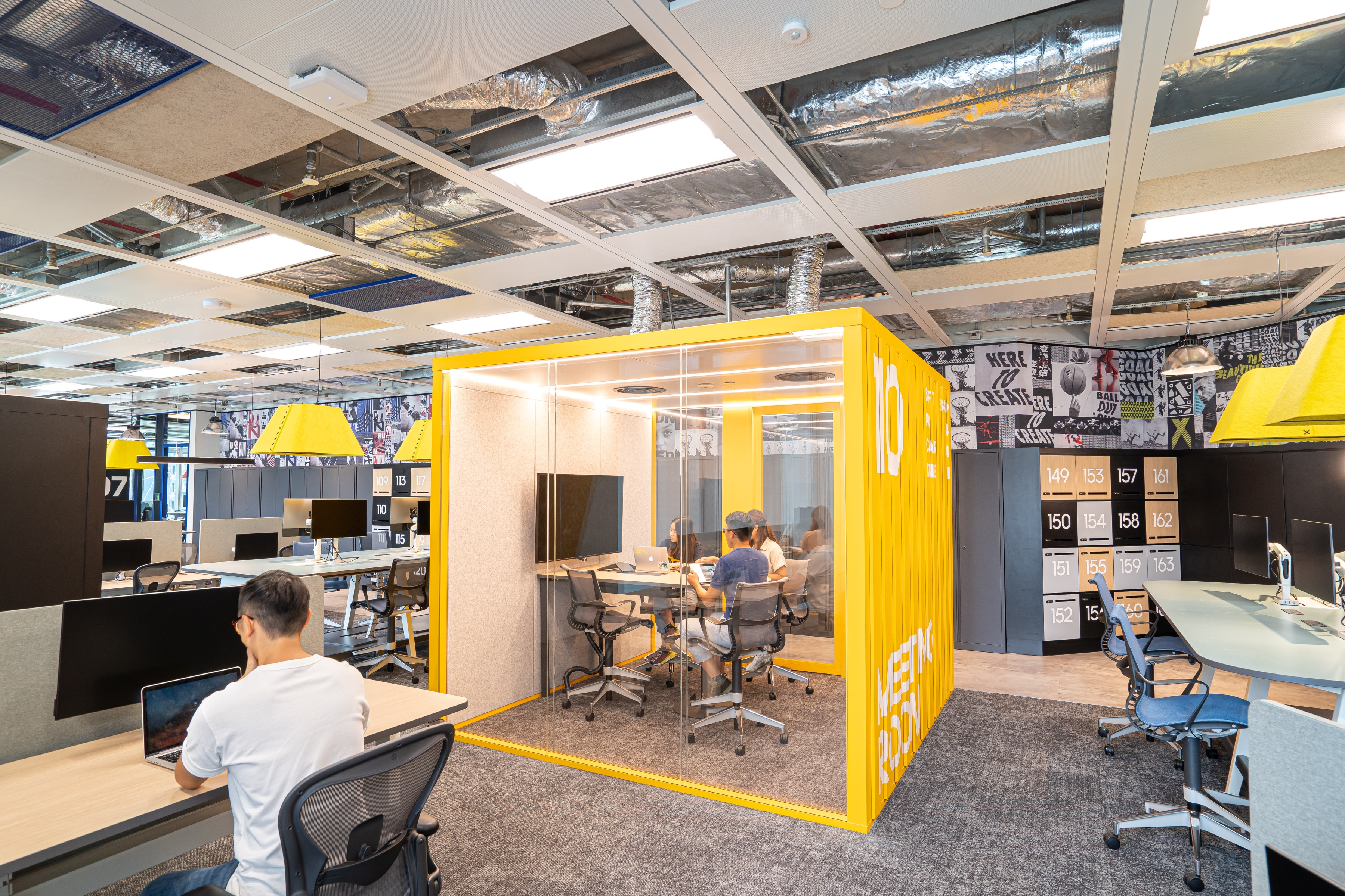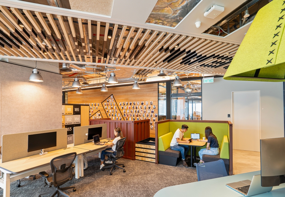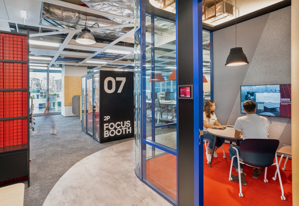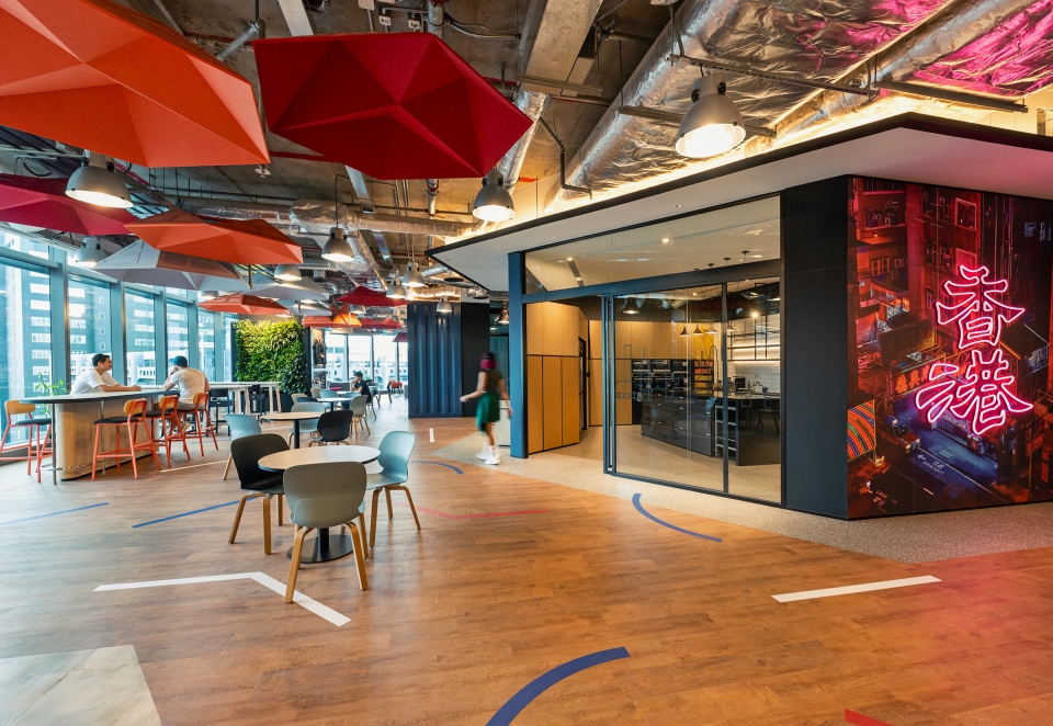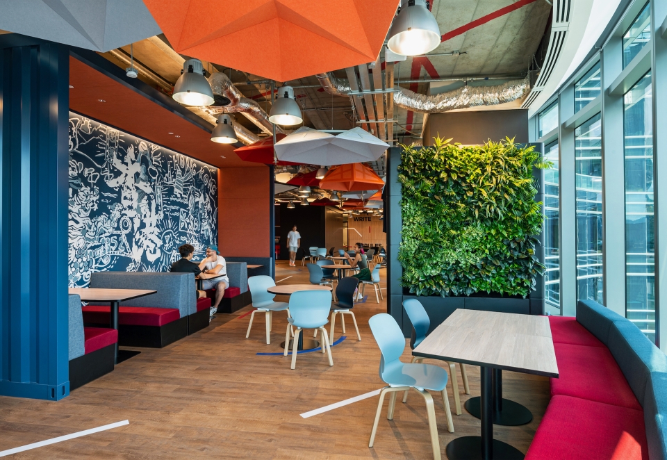 Zoning is denoted through the confident use of primary colours. Wayfinding is encouraged with mesh or acoustic panel ceiling over main walkways – while the floor emulates a running track.