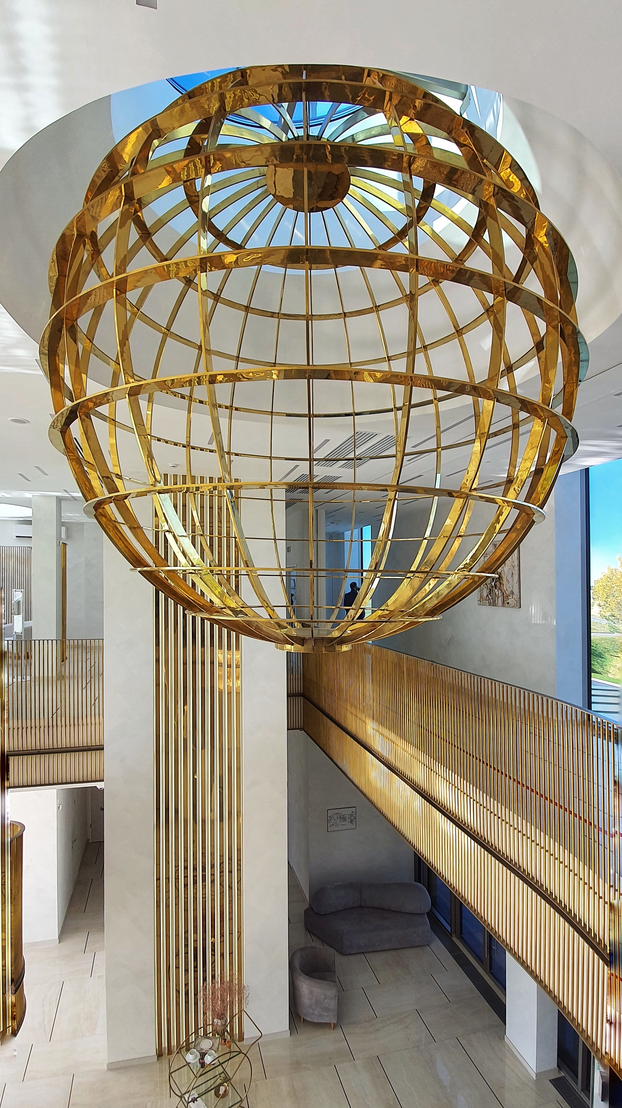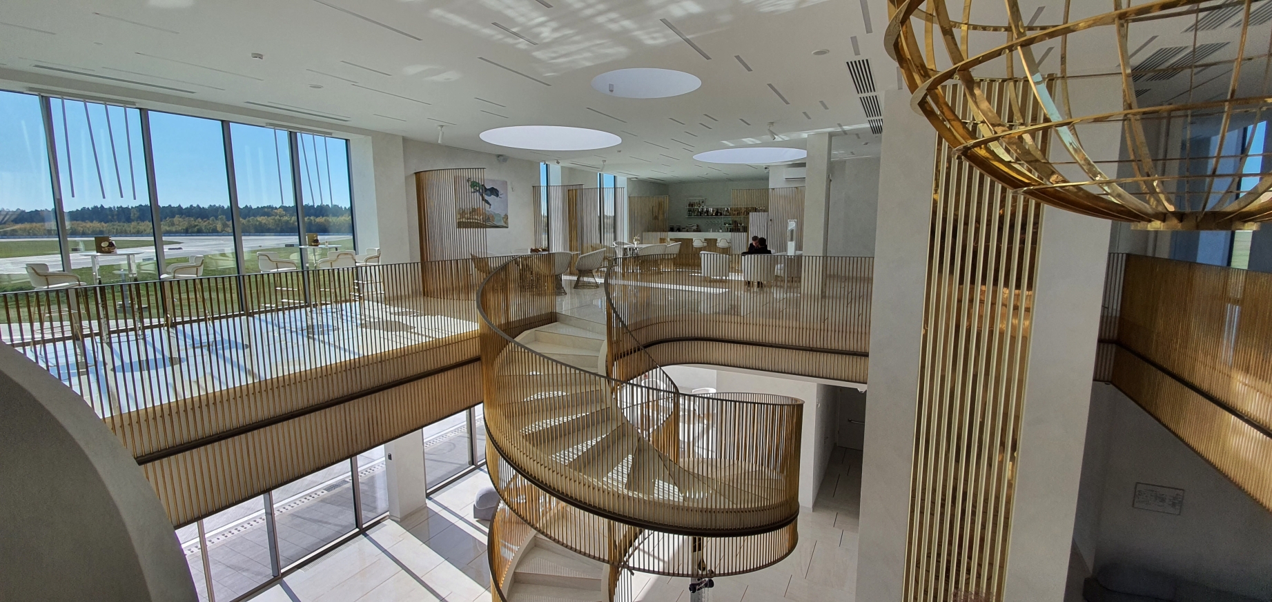 From the big staircase in the middle of the lobby, the brass balustrades extend to the division circle inside the lounge of above floor, bringing a unified character to the whole space and a hint of the metallic atmosphere of the aeronautical machine.