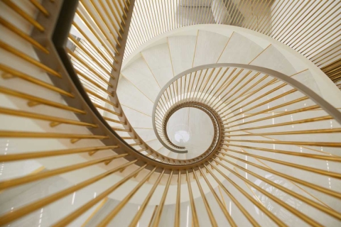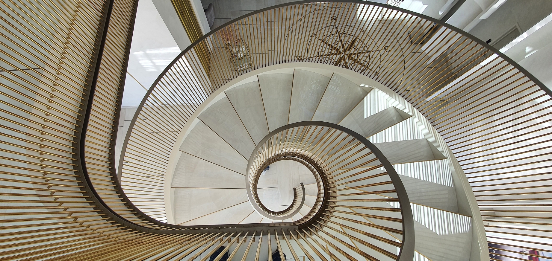 The large main hall is lit from above by a large globe built with brass profiles like the large spiral staircase in the center of the hall. Exactly perpendicular to the globe, the wind rose is drawn with