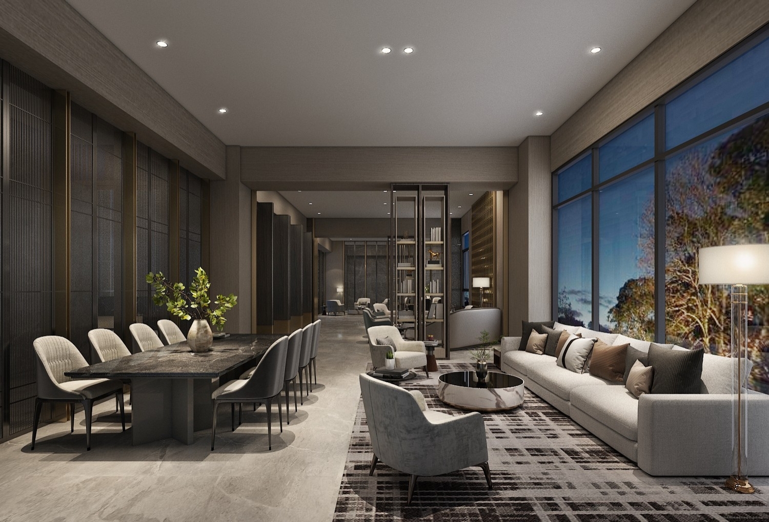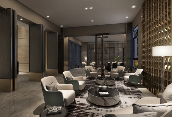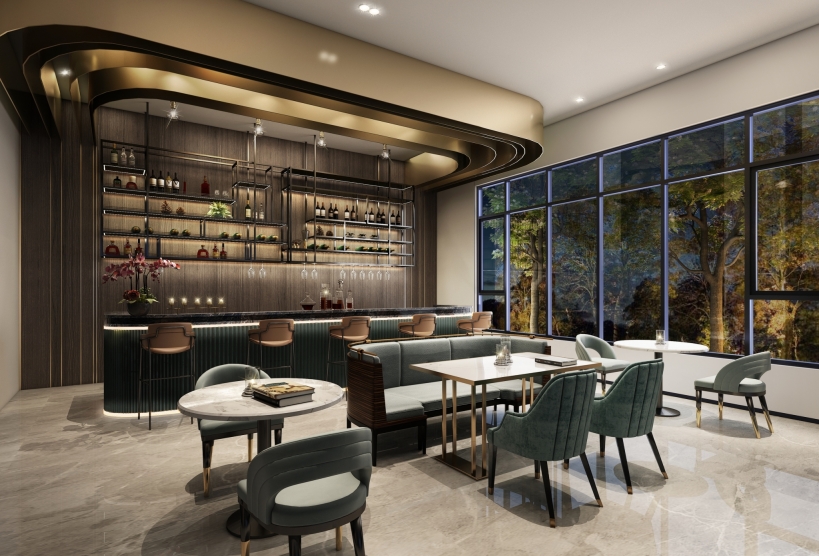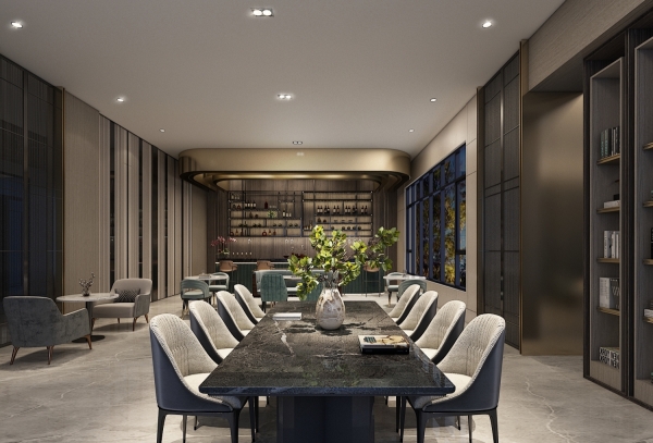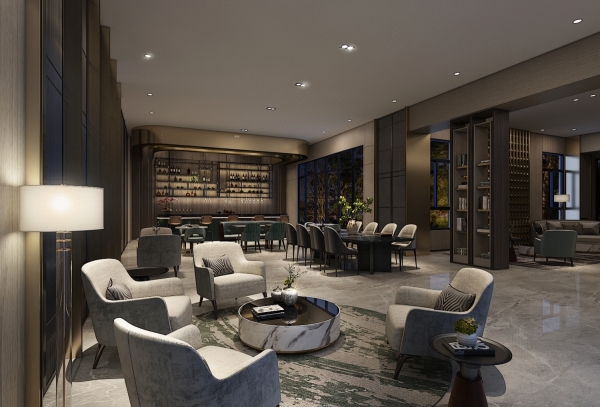 Delving into the building, the lounge has two main area: the sofa area on the right, and the bar area on the left. The open-plan lounge is designed for residents to relax, and different areas are defined by the textures and the layout of the furniture. With wood cabinet and hardware shelf for the liquor, the designer successfully turns the corner into a cellar of classic good old times. The champaign gold curve on the ceiling adds in a flare of luxe. On the other hand, the sofa area shows another mood: the old gold and gray seats along with the black and white marble desks shows consistence with variations in colors.