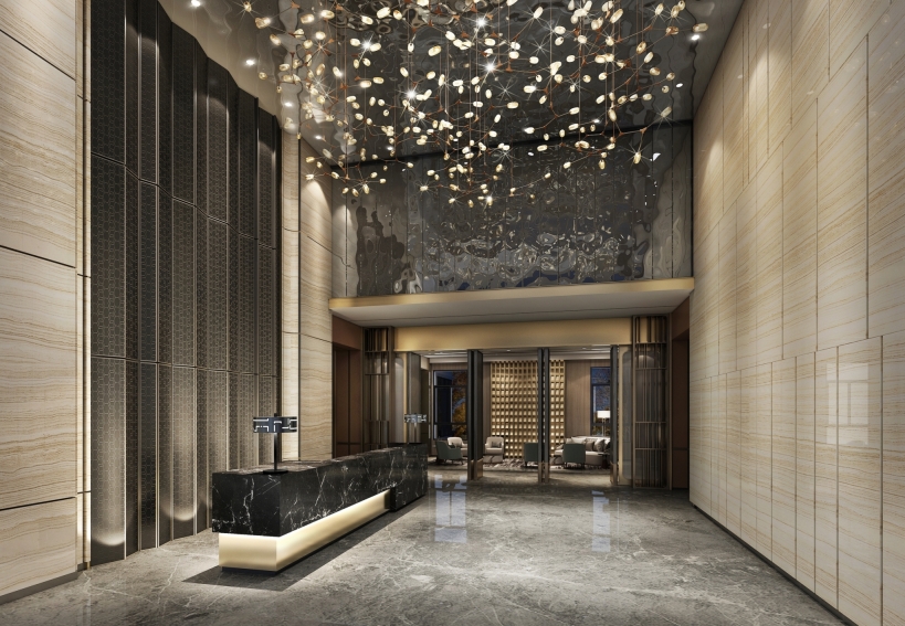 Upon entering the lobby, the matt black wall with embedded details behind the counter, and in between lies the gray marble flooring, building on the luxurious ambience in the room. The amber-like light radiates yellow warm rays, and the lights reflect on the uneven mirror ceiling. This not only softens the light but illuminates the whole room.