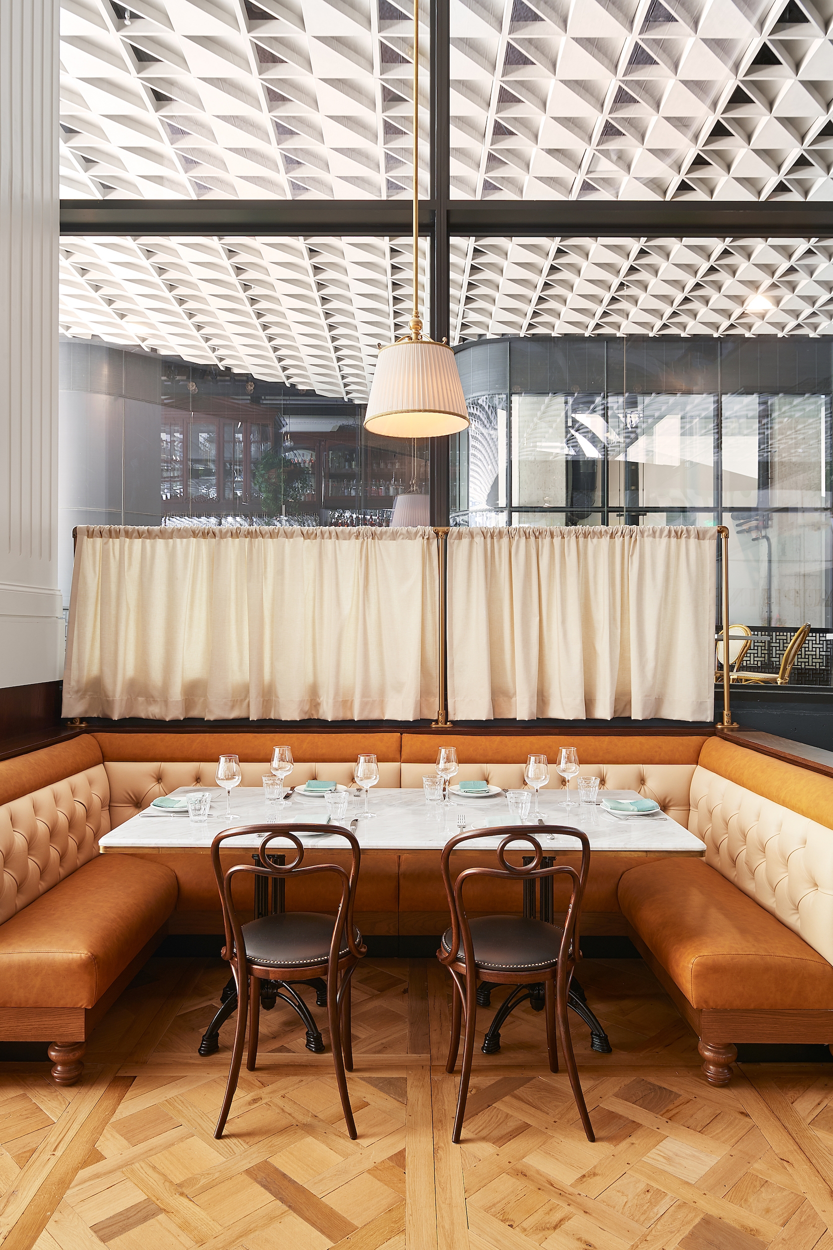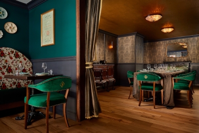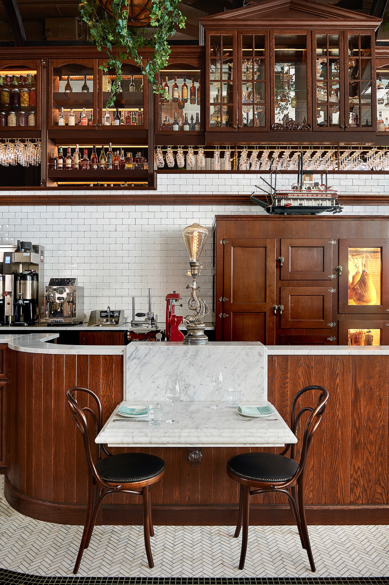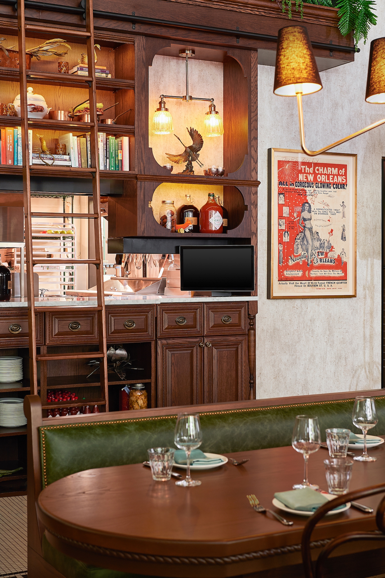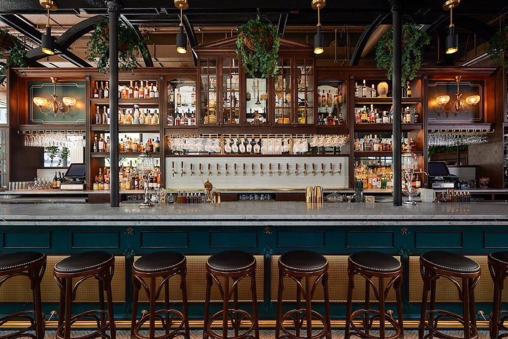 Inside, several pendant-lit tables and banquettes fill the opening dining room, where the eatery’s custom raw bar and wood charcuterie case are on full display. Warm wood tones and soft whites, expertly blended with metal, leather, and biophilic elements, define the color palette. The highly-detailed back bar features warm glow lighting, a detailed metal screen, and a marble bartop. Wood cabinetry houses the vintage glassware. Past the kitchen, a staircase leads to the private dining room on the mezzanine level decorated in moody black and gold paint, and embossed crocodile skin.