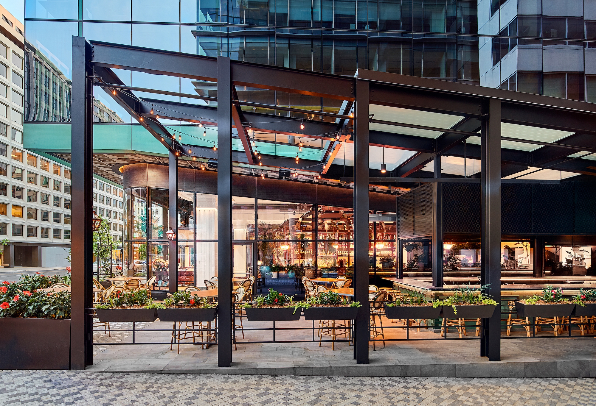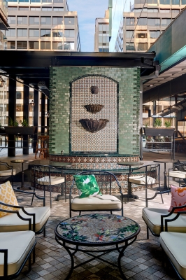The outdoor space features its own bar built using wrought iron, laser-cut metal panels. A tile-clad fountain creates a peaceful moment at the end of the bar. The French-style pavilion envelops the centered, two-level bar, extending a tribute to New Orlean’s famed courtyards.