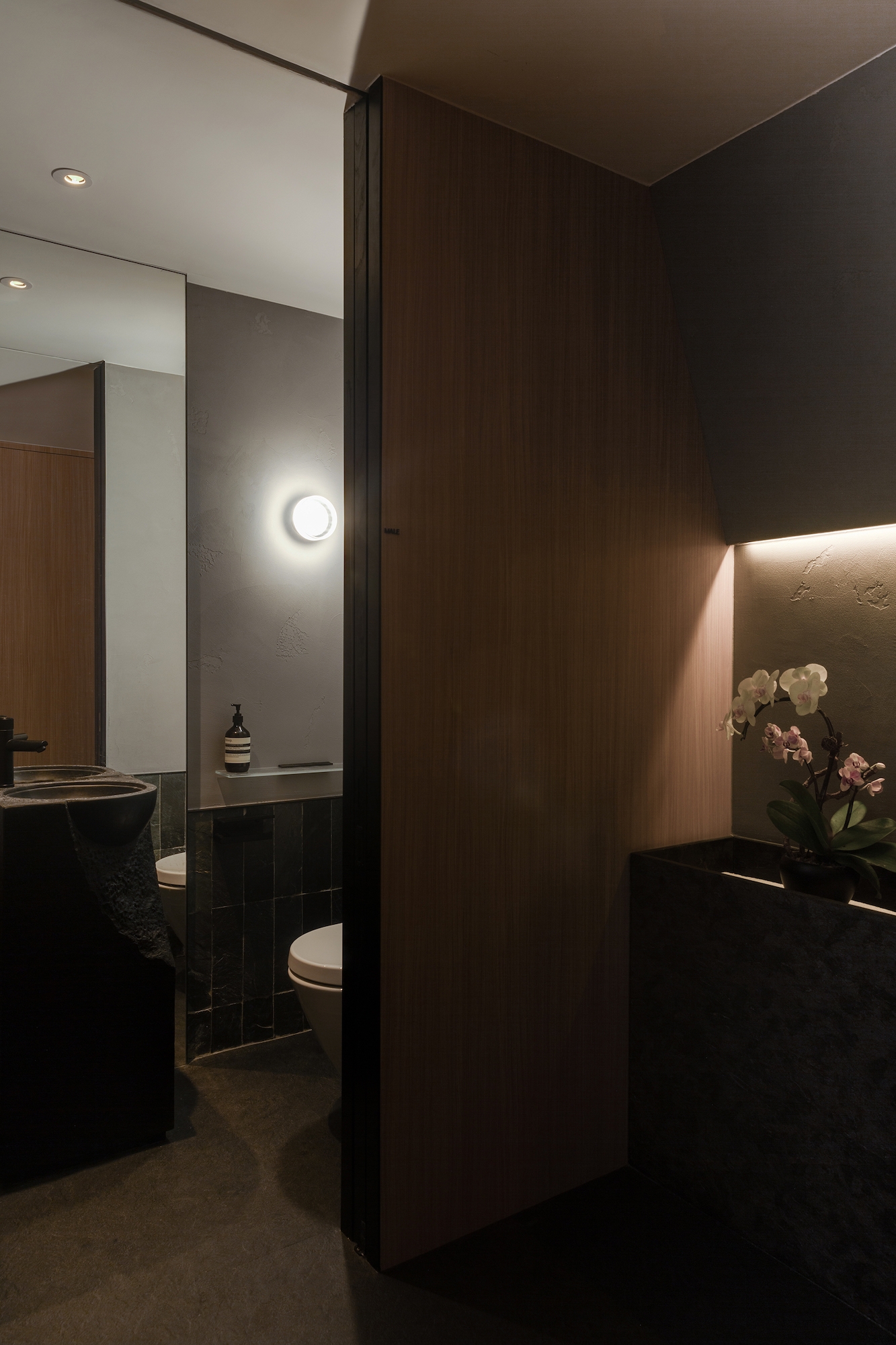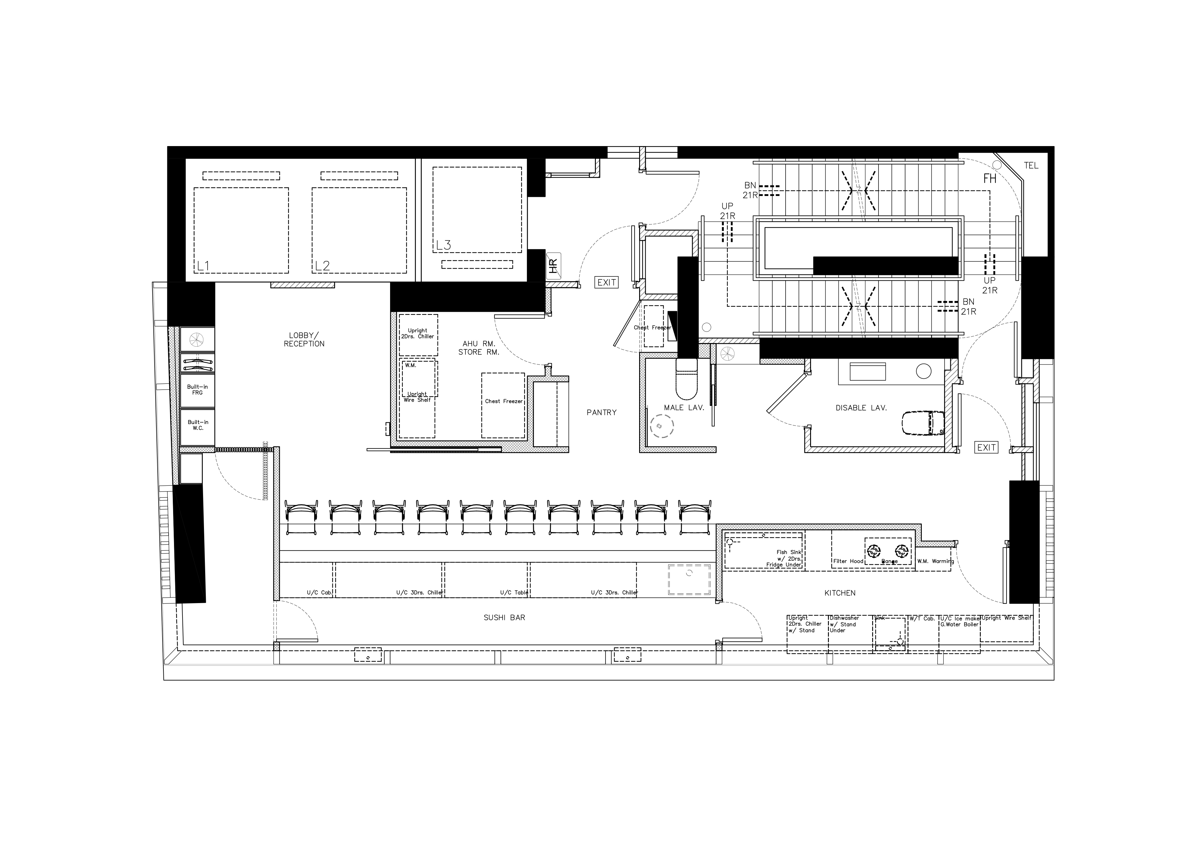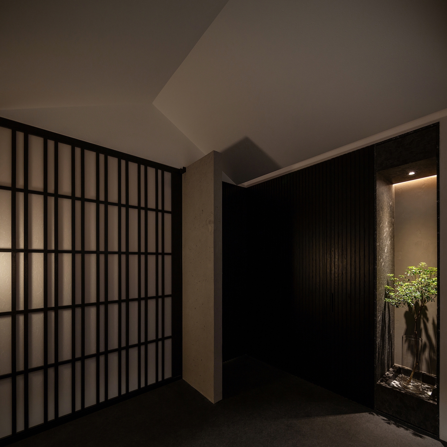 Pitched roof and Plaid sliding door being used in lobby, the first sight while steps out from the elevator, giving the Japanese traditional house-like vision, customers feel entering a different world and start to preparing on coming food experience. Monochrome is the main colour, with strong Japanese feature that adding modern feeling but aligning with whole theme of design. After passing the main door, typical Sushi-ya dinning area brings everyone to Japan locally and enjoy food there.