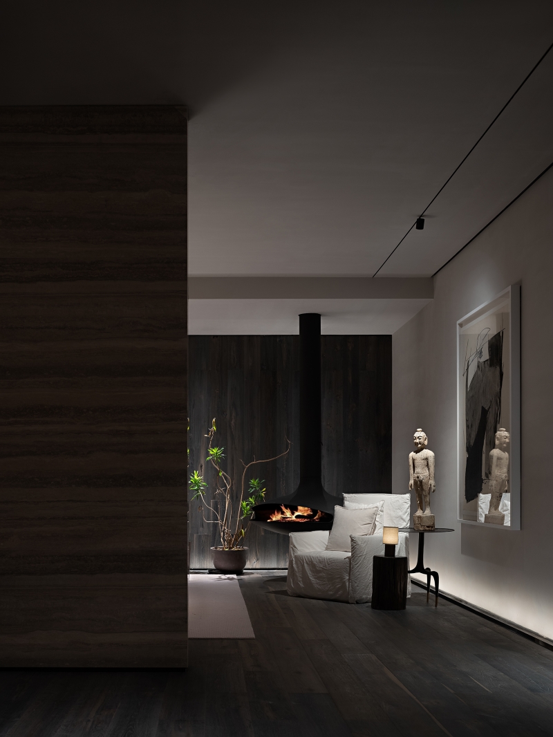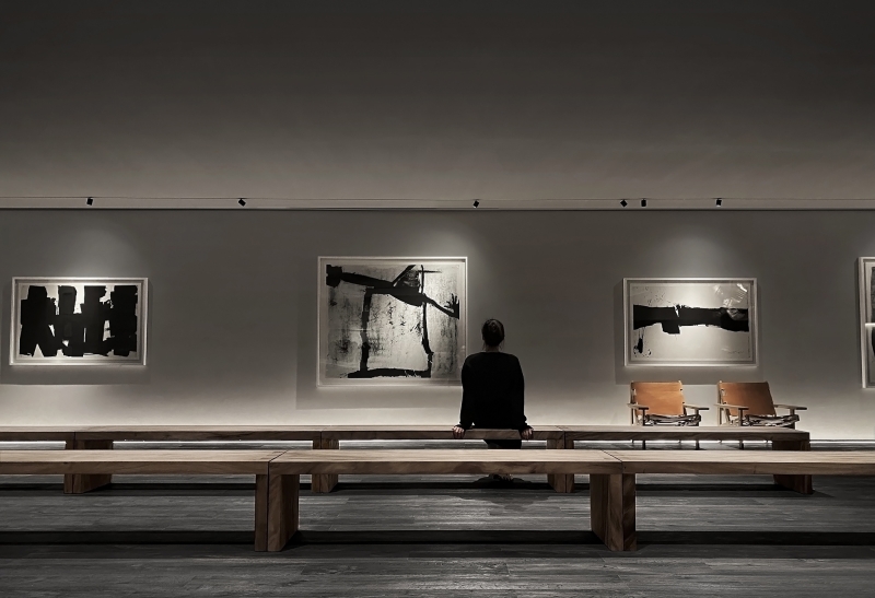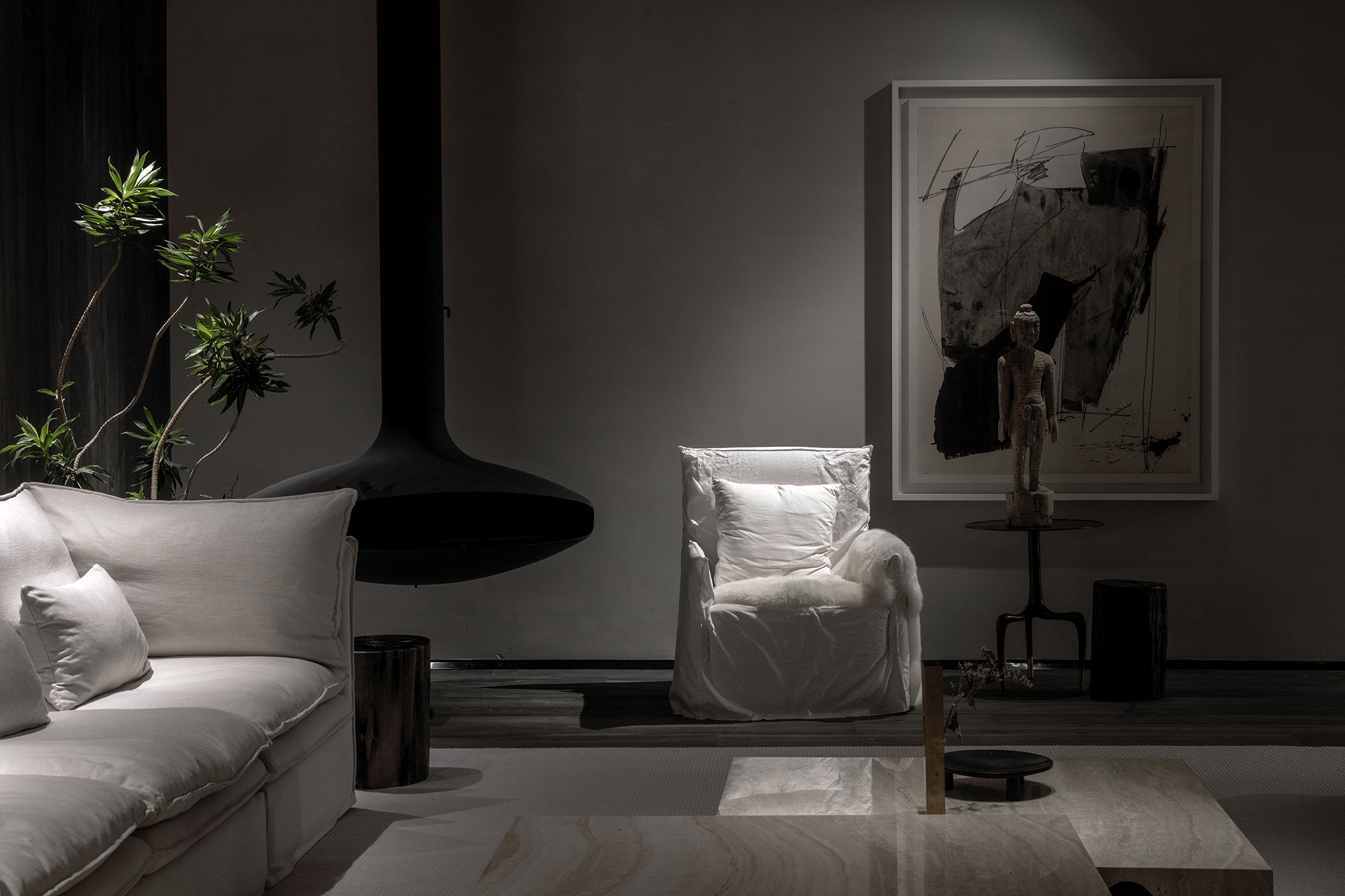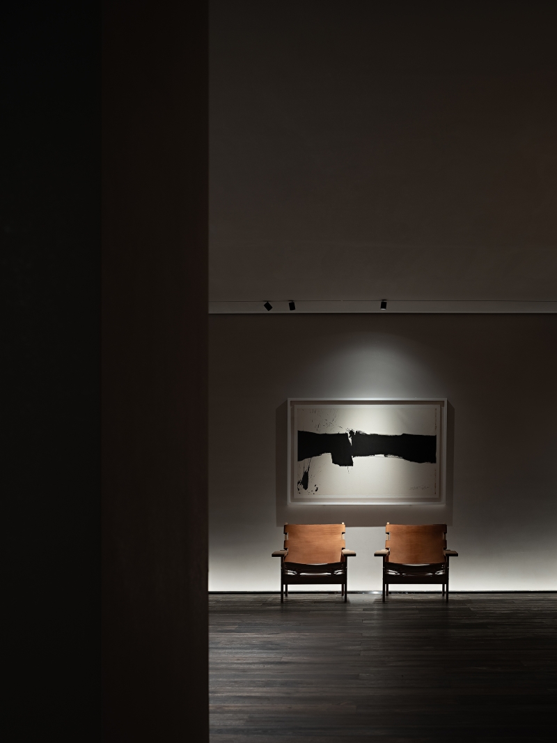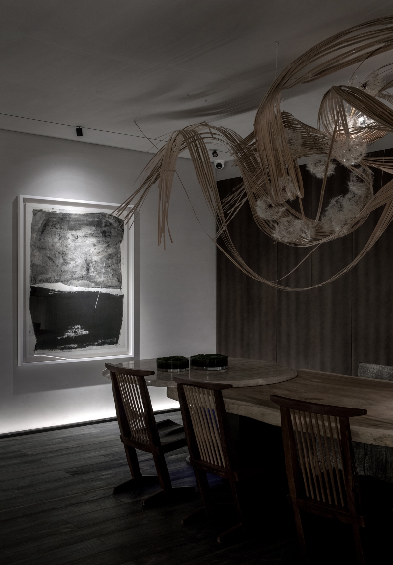 Calligrapher Yang Xiaojian is an innovator in modern Chinese calligraphy. His bold application of Western abstract expressionism gives a new life to traditional Chinese calligraphy. The ink and wash elements of his novelty echo perfectly with the minimalist interior style.