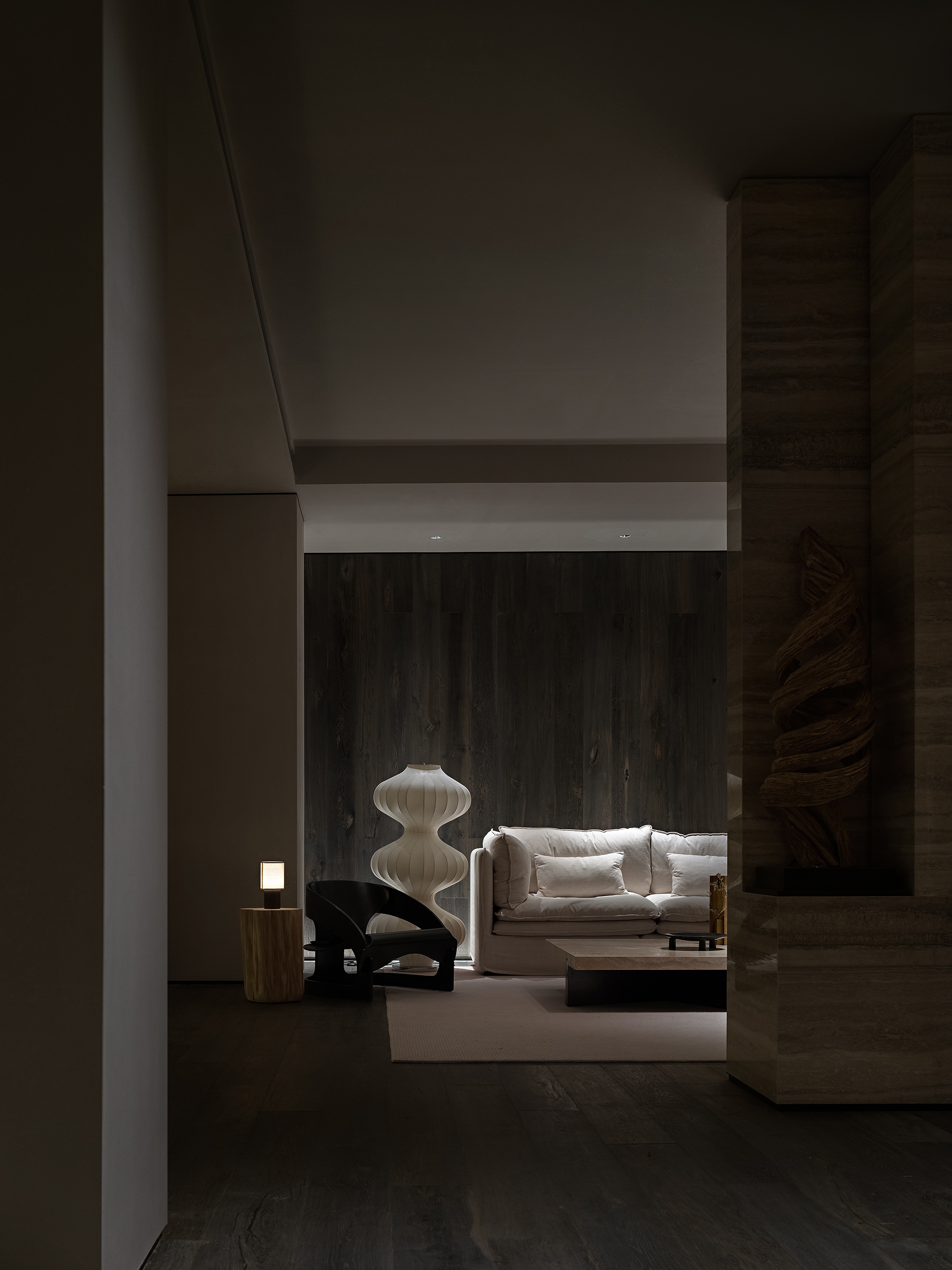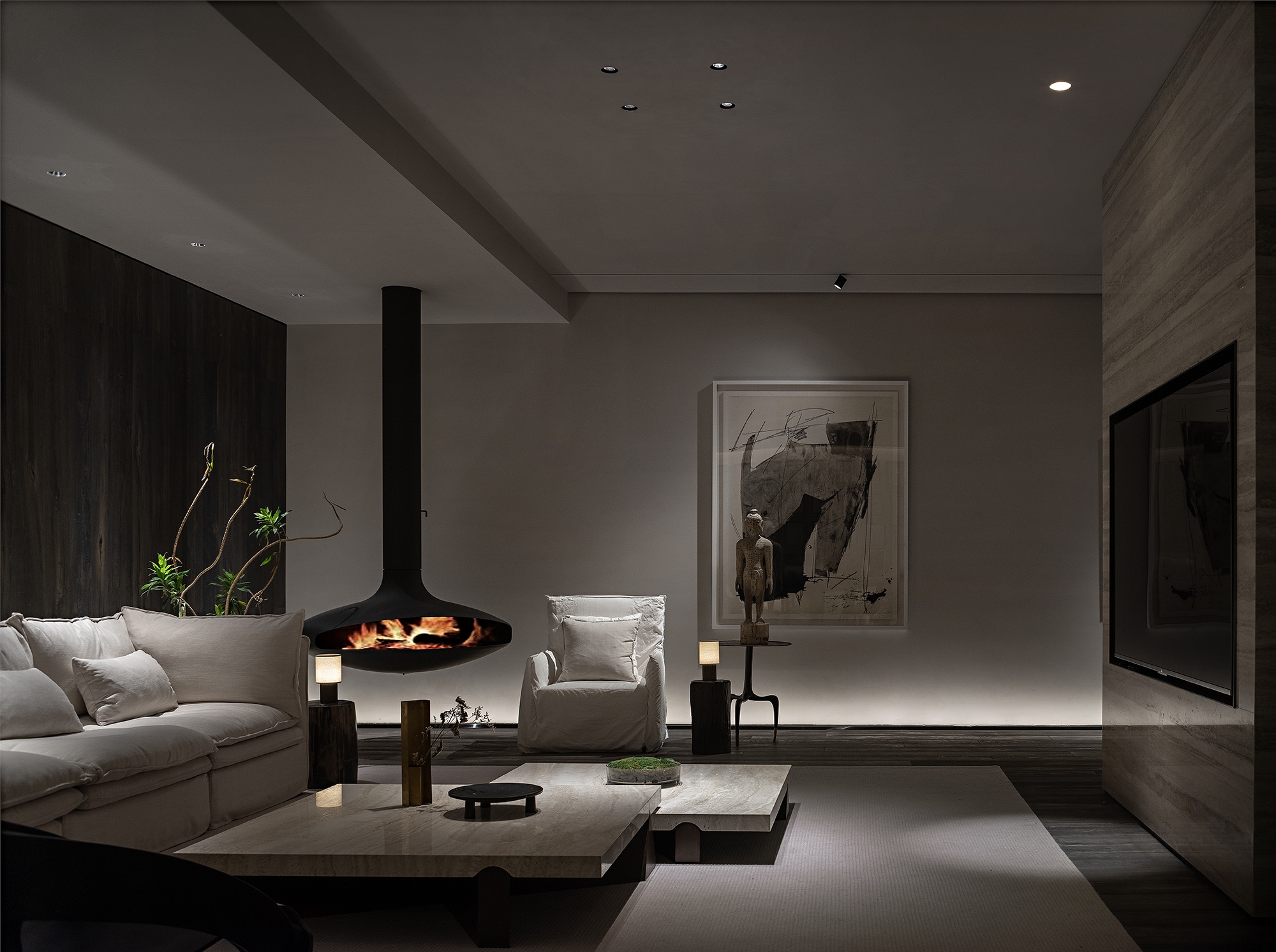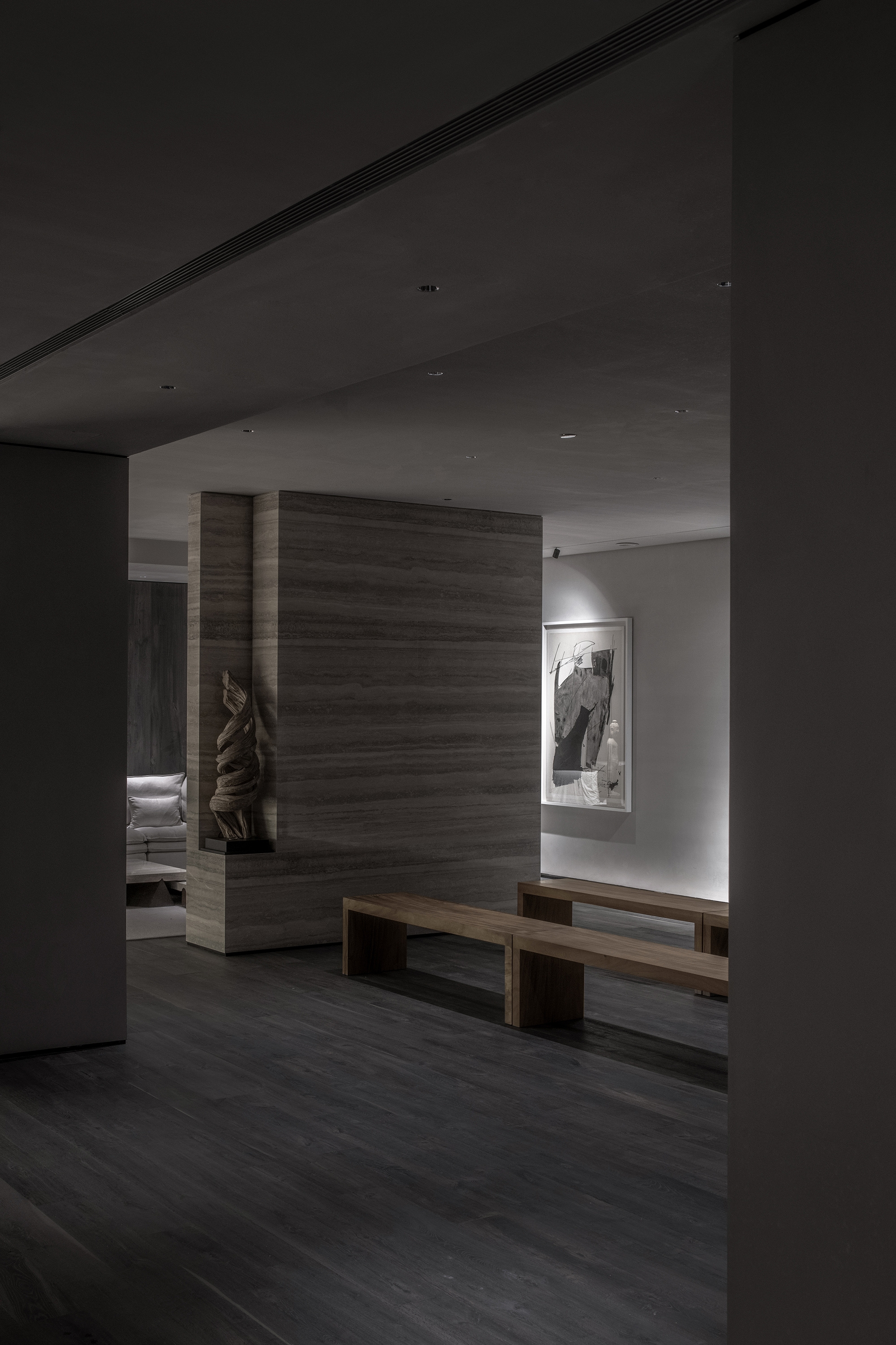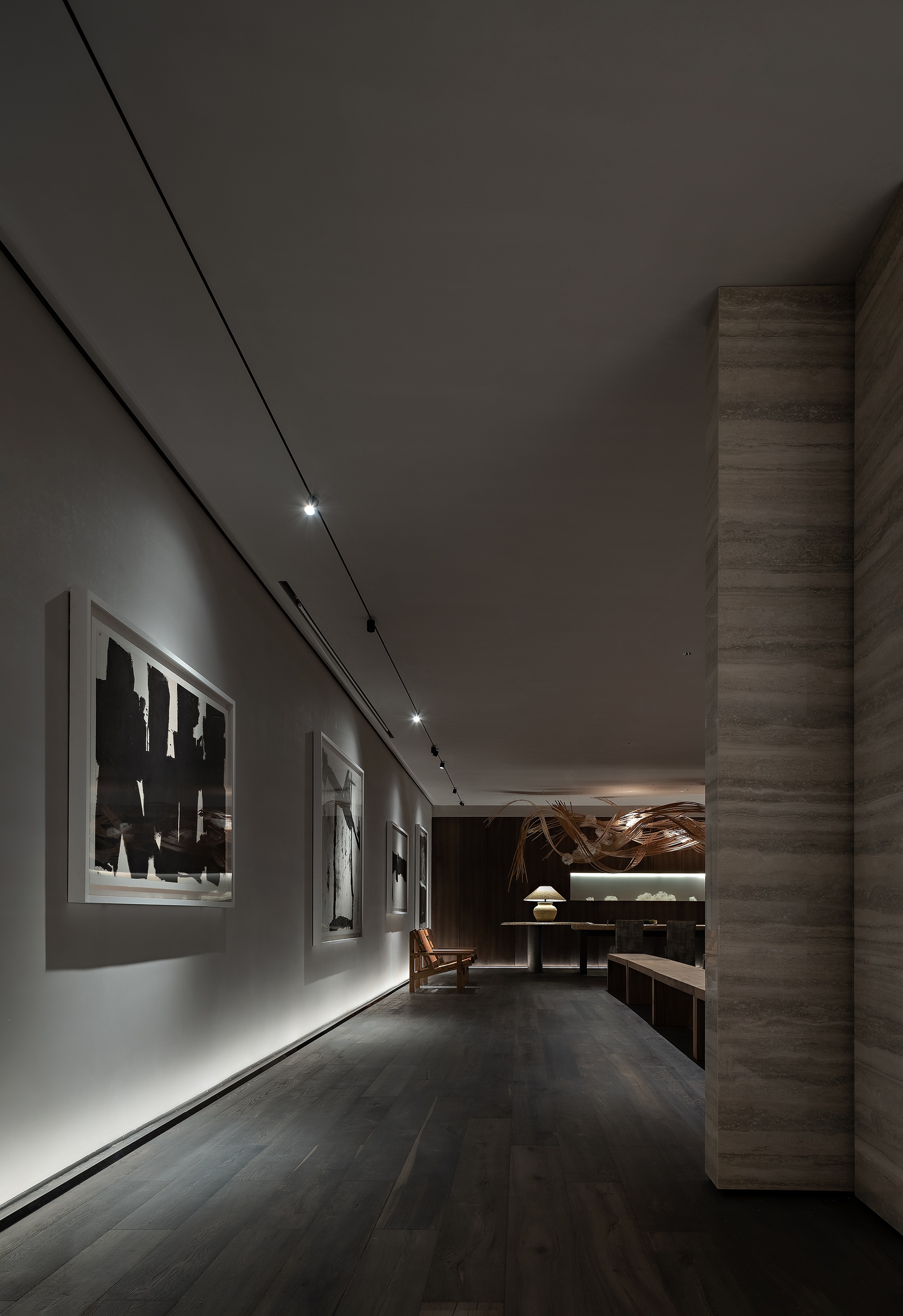 The whole space is neat and concise with selective and delicate texture, which offers mildness and gentleness in the space. Through a combination of wooden material and copper imitation stainless steel, variable multilayers are created. The introduction of Chen Qi’s work Code of Nature depicts the lively aesthetics of ripples to slow down the pace of the surroundings. The charm of Zen is expanded through integration of lighting and variable substances.