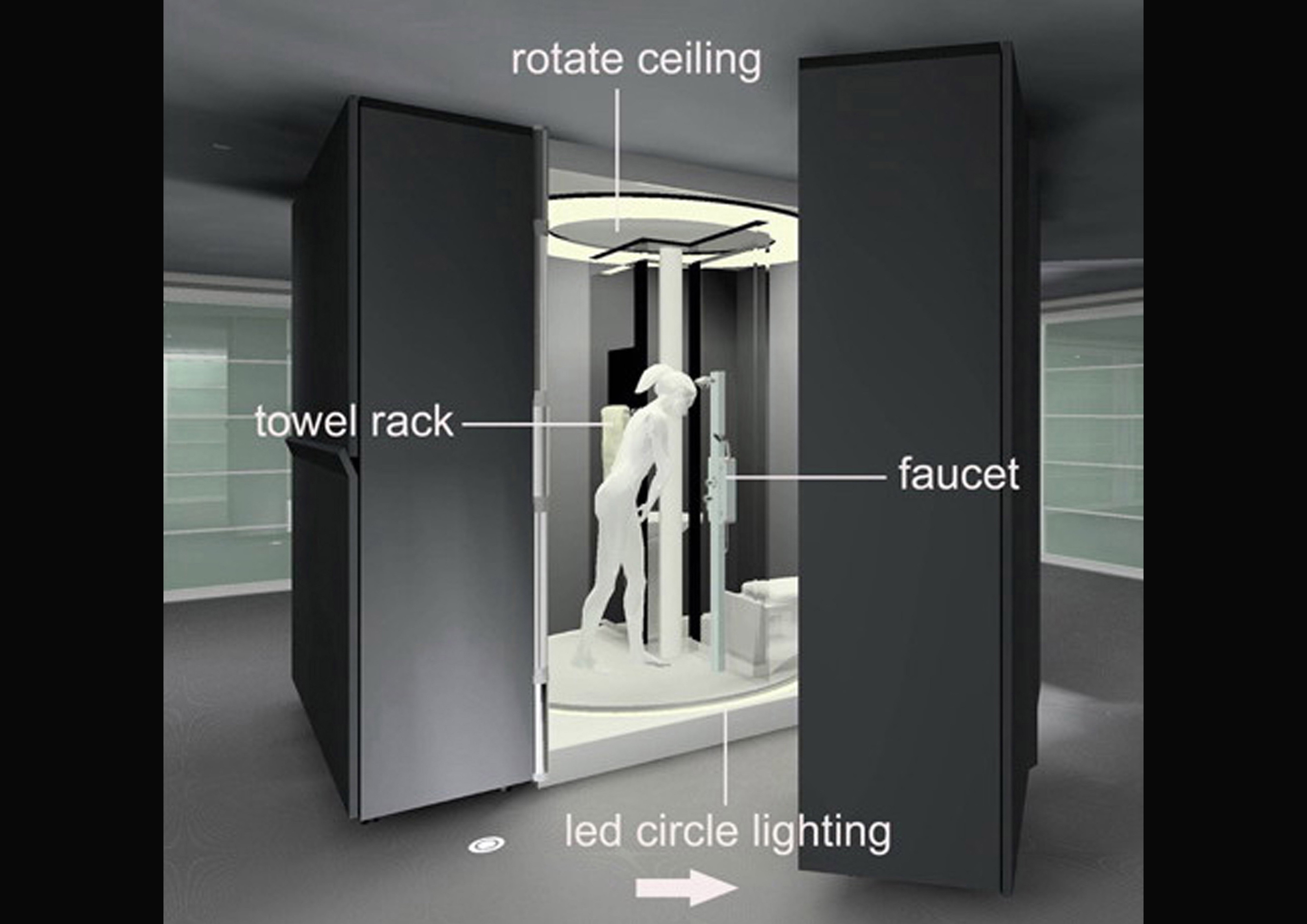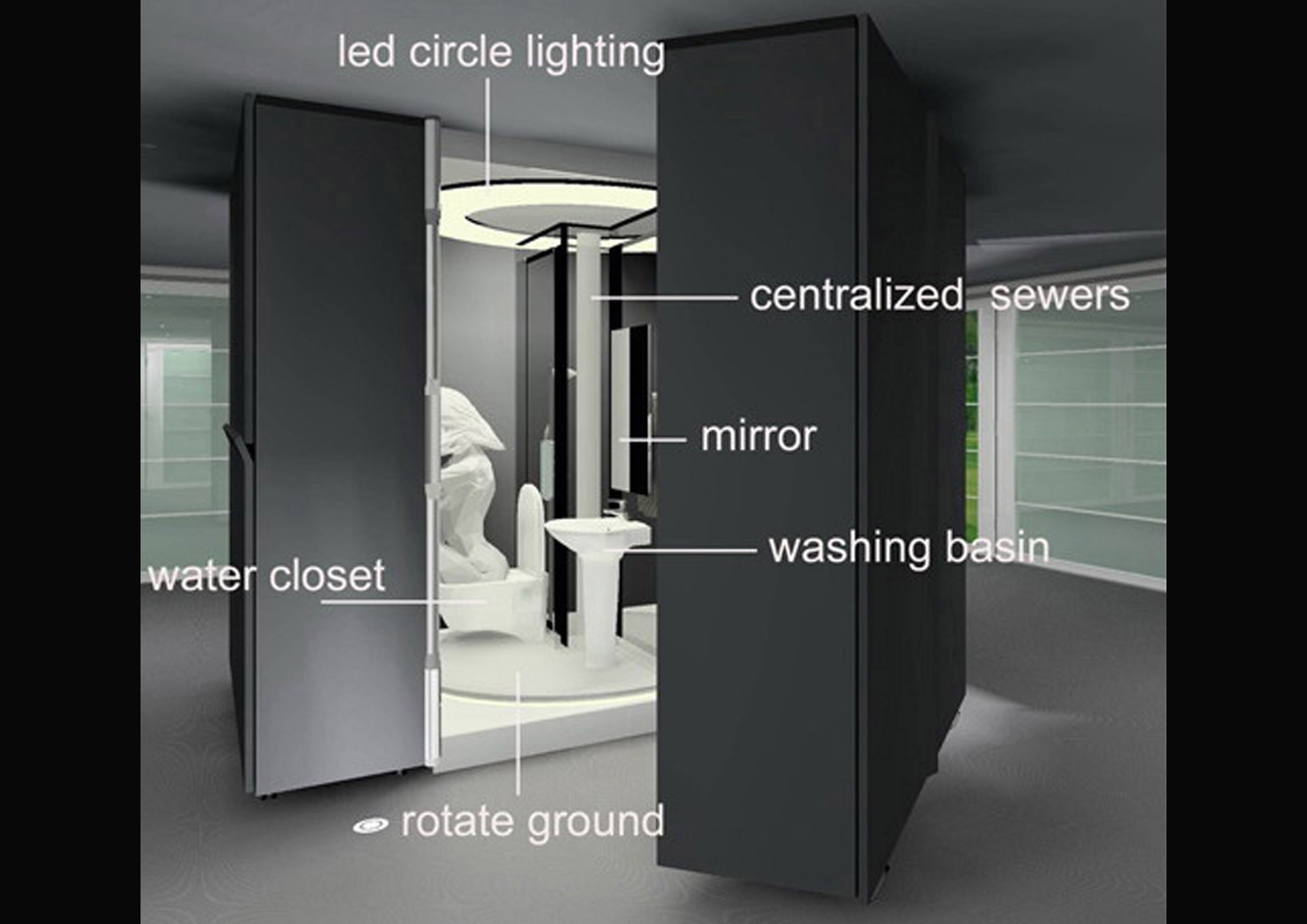 Lastly, the center area is the movable and rotatable bathroom , which is easy and convenient for the users to get in and out. The users can make use of the shower room, washing basin and toilet facilities, enjoying the modern life.