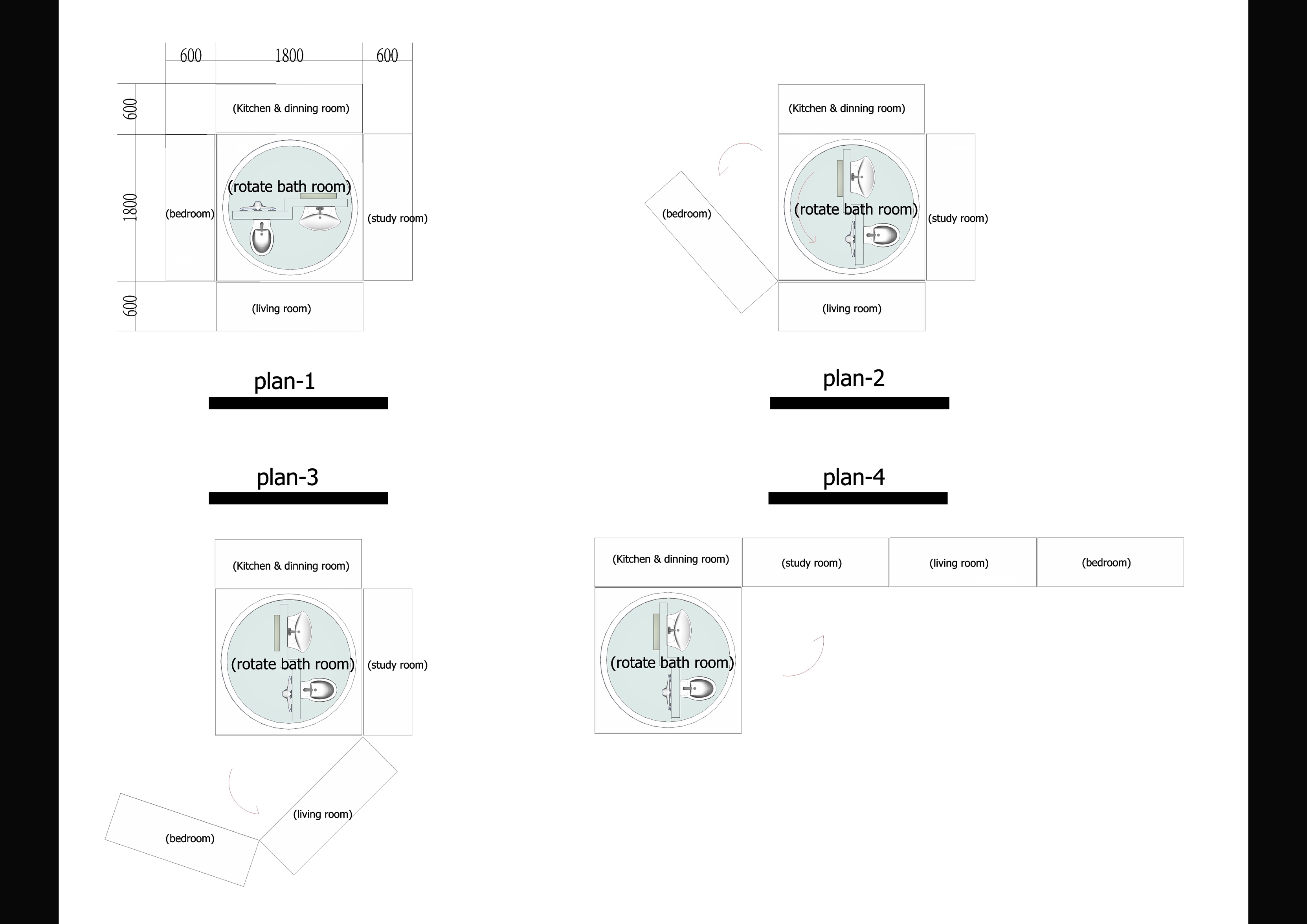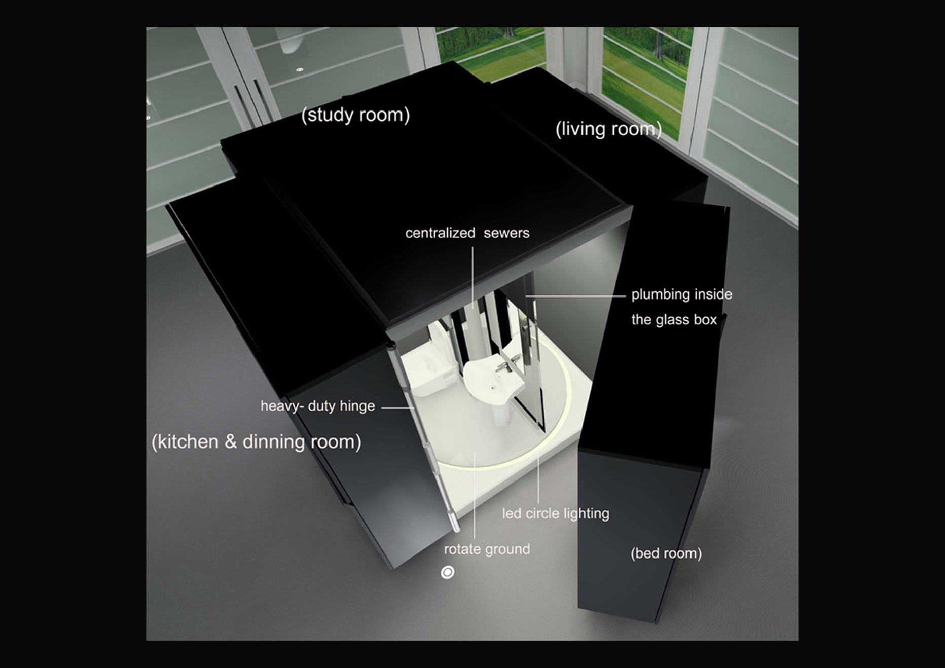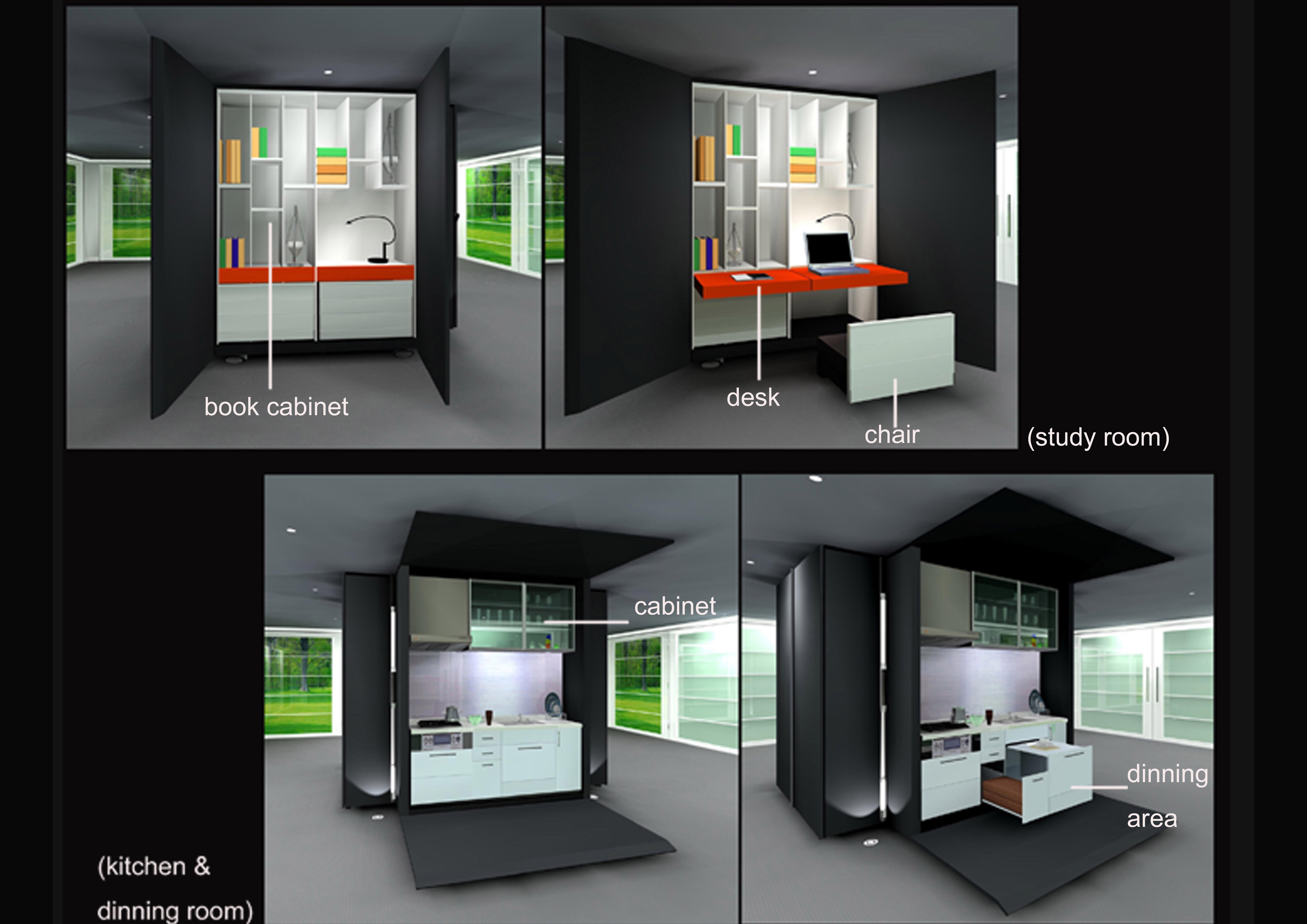 A cabinet with wheels is used for hiding the house’s four main living areas; the living room, bedroom, study room and the kitchen. The center is a rotating bathroom, connecting these four areas which make the whole combination just looks like column