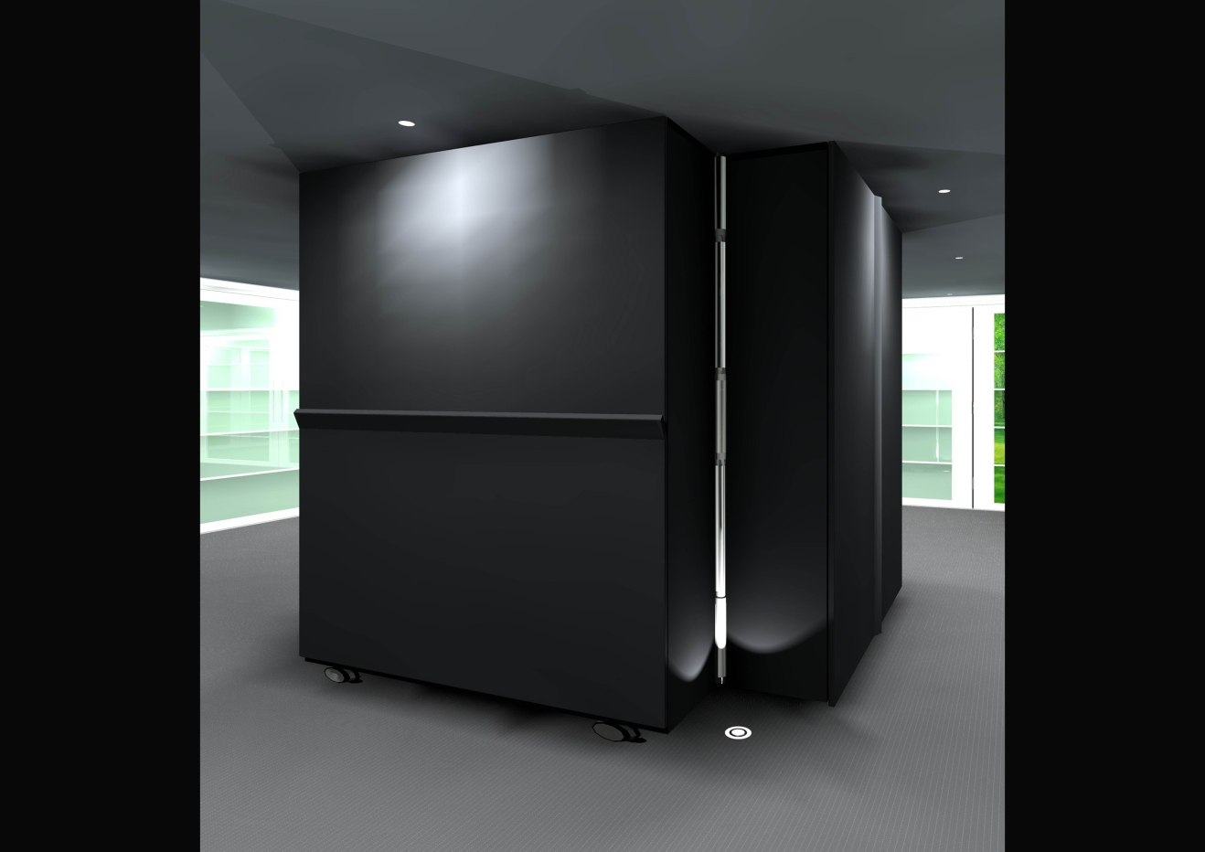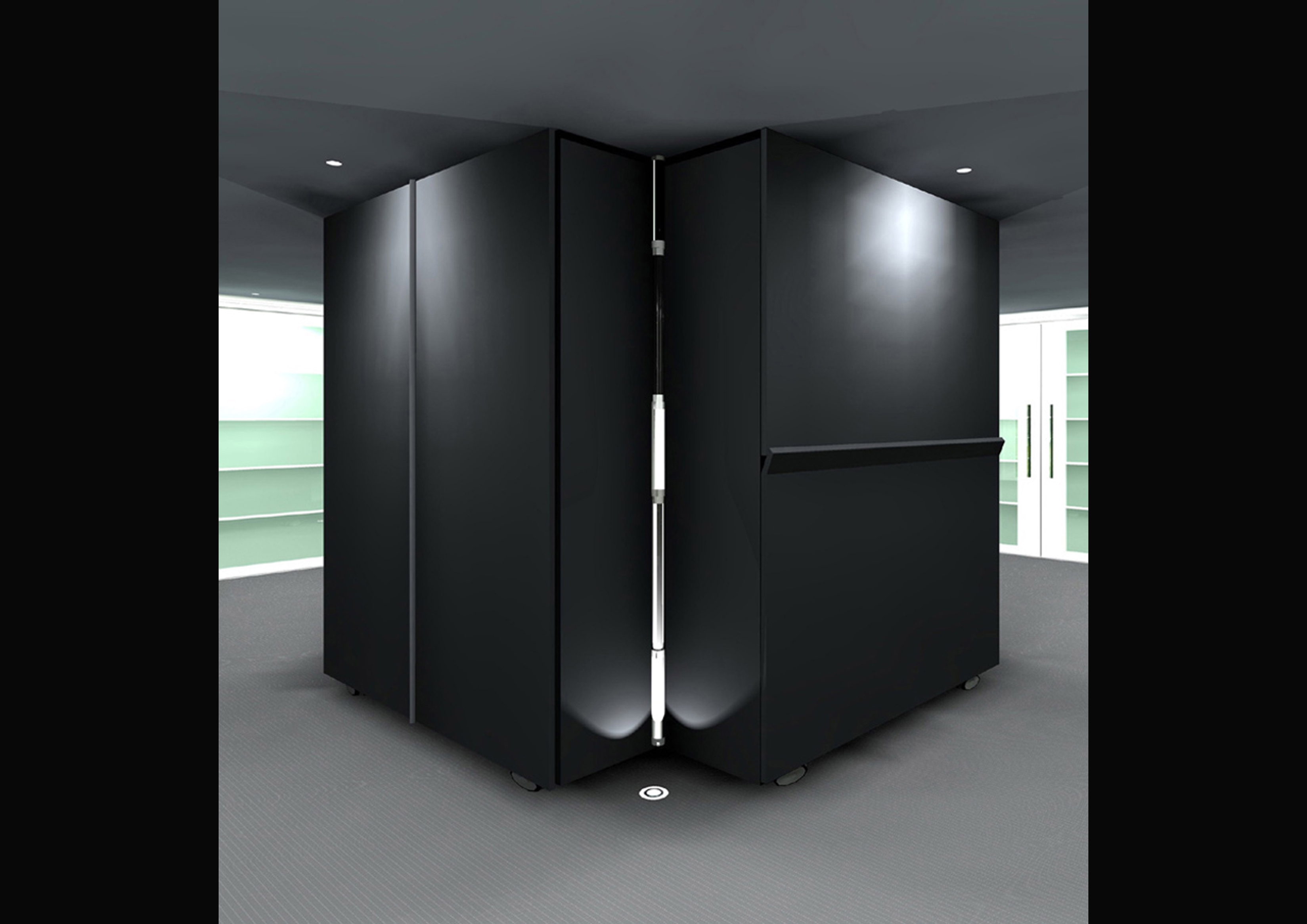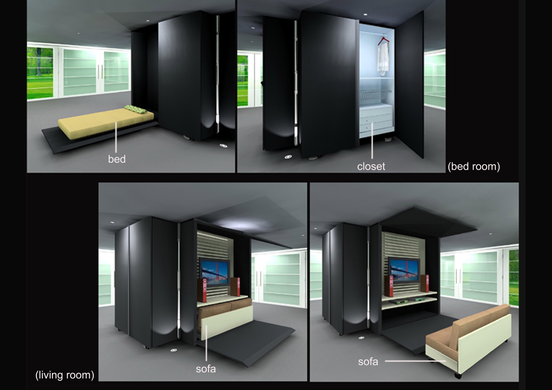 A cabinet with wheels is used for hiding the house’s four main living areas; the living room, bedroom, study room and the kitchen. The center is a rotating bathroom, connecting these four areas which make the whole combination just looks like column