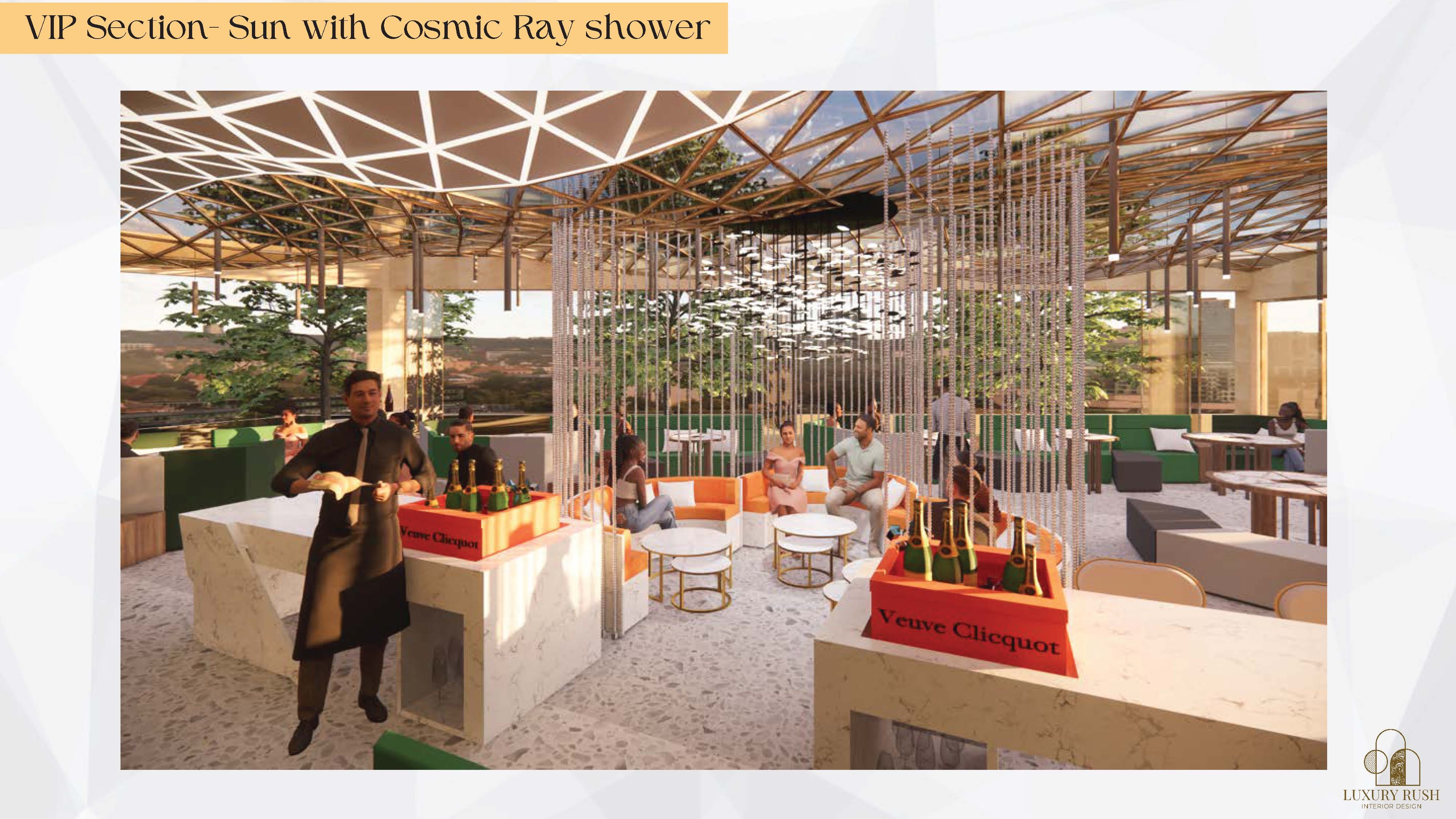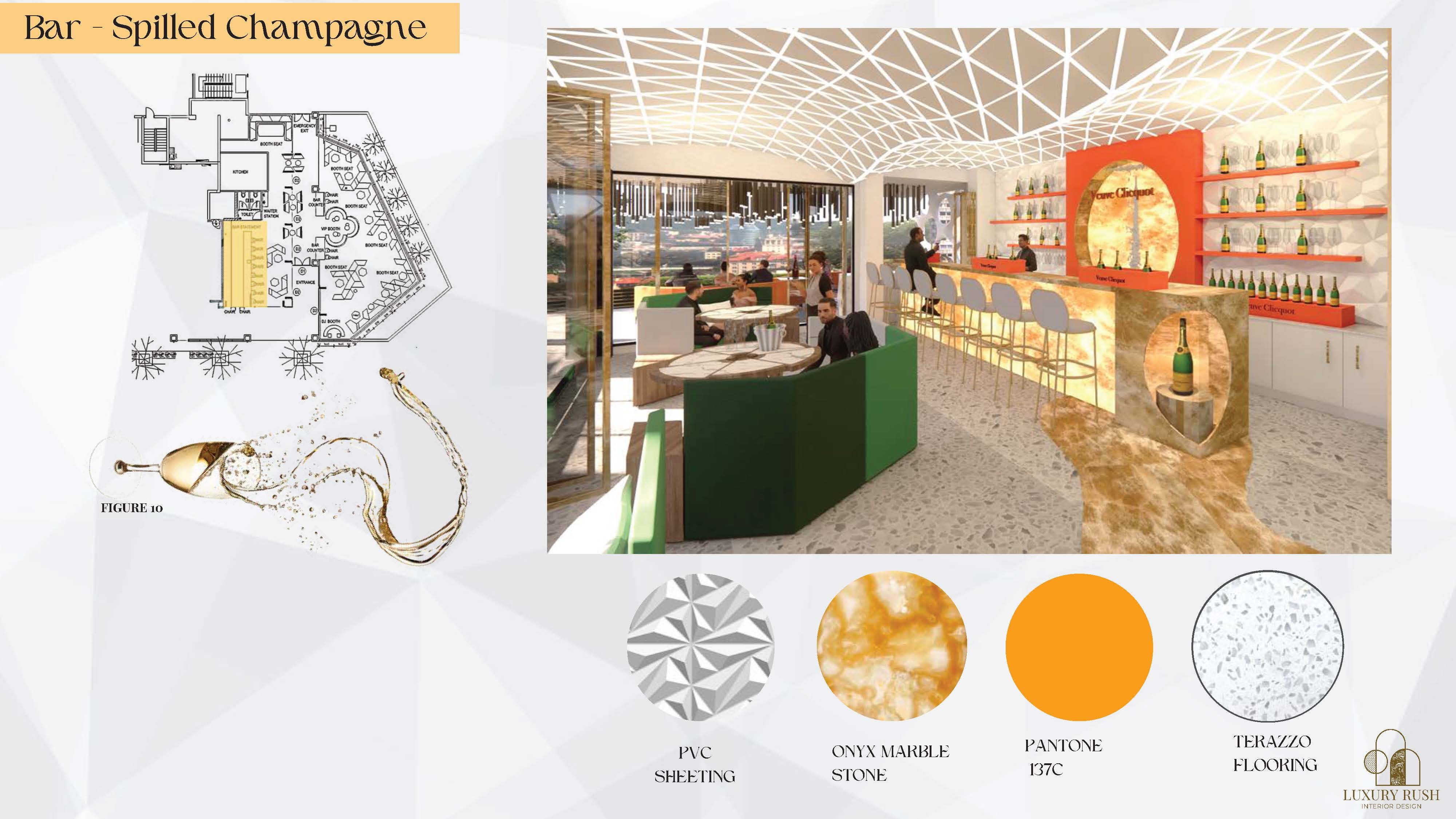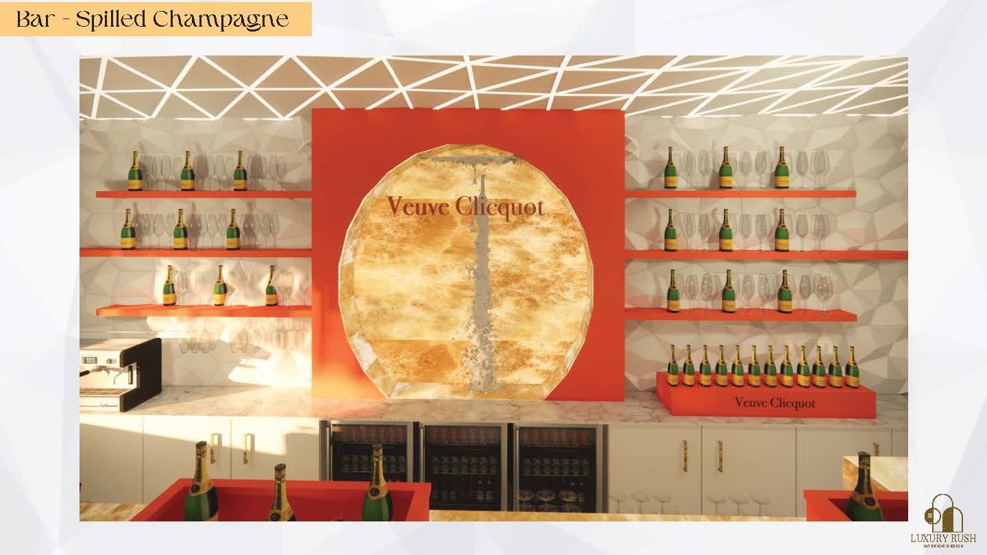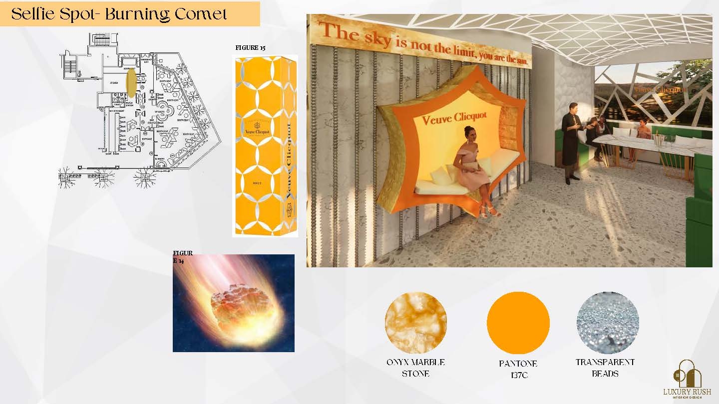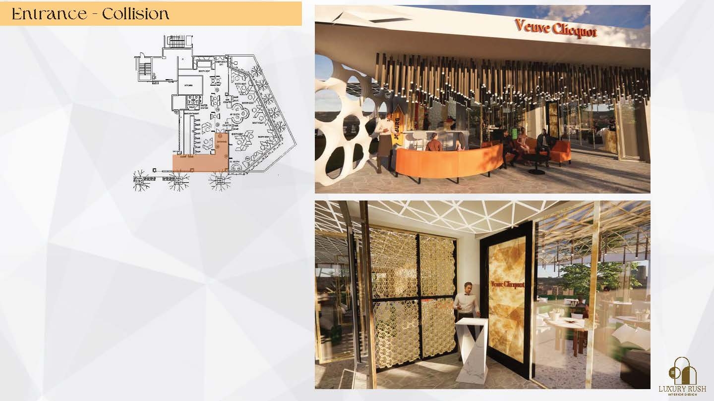 This design is for the proposed Veuve Clicquot champagne bar situated in the affluent suburb of Sandton. The brand’s objective is to attract younger consumers by creating the sense of “accessible luxury”. This is achieved by incorporating luxury materials in a contemporary design. The concept of this design is a metaphorical collision between a comet, a signature symbol for the brand, and a glass of Veuve Clicquot champagne. This is to demonstrate the glass ceiling Madame Clicquot shattered as a woman in her era. The use of “cosmic zonings” relate back to the concept with a shattered glass ceiling, etc.