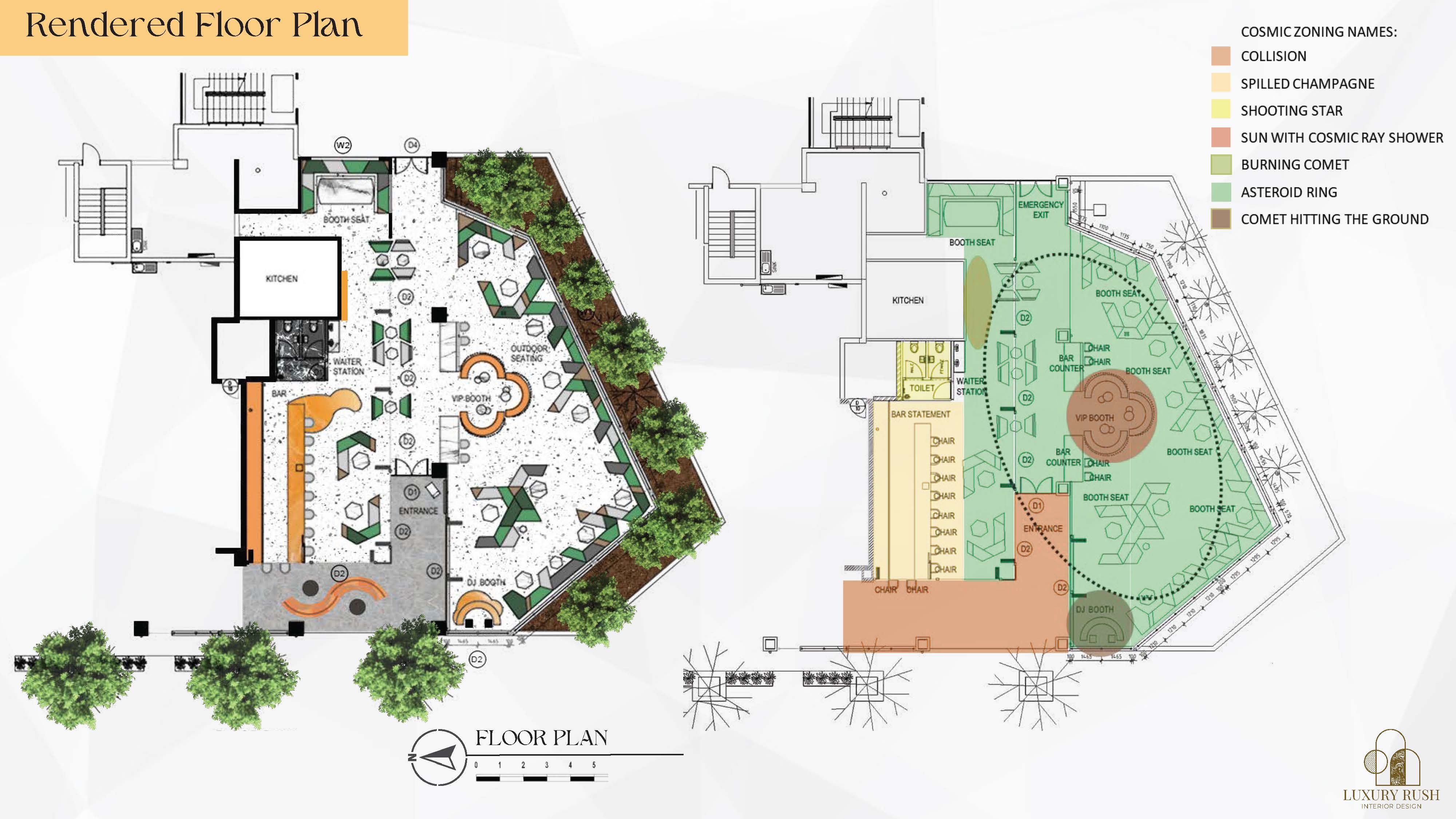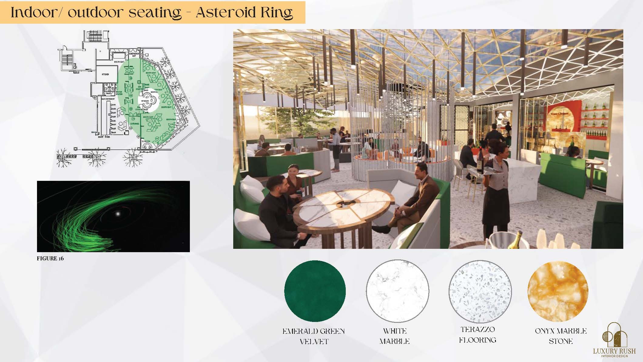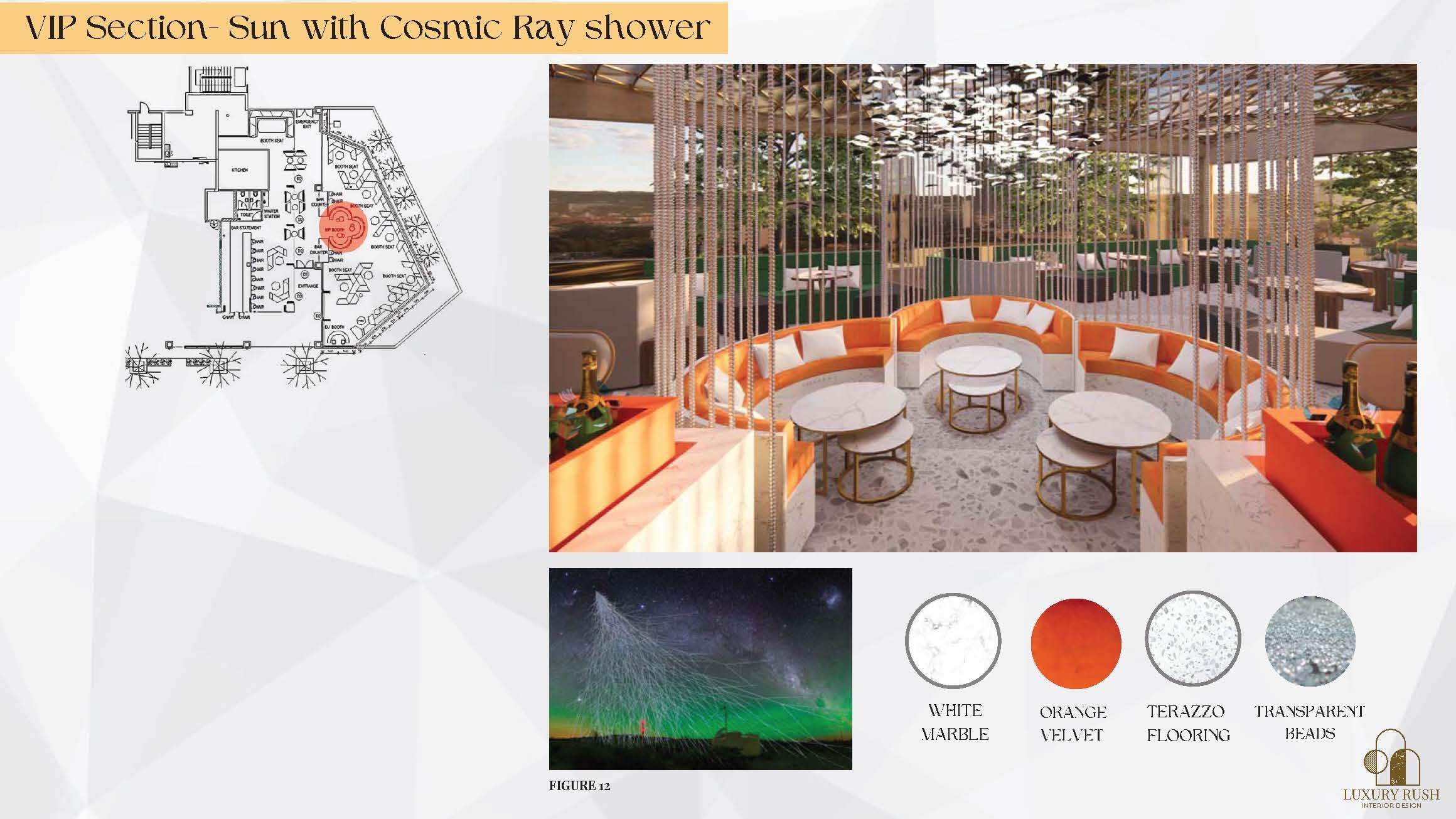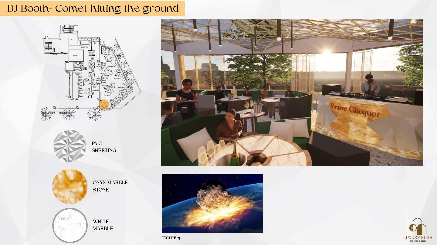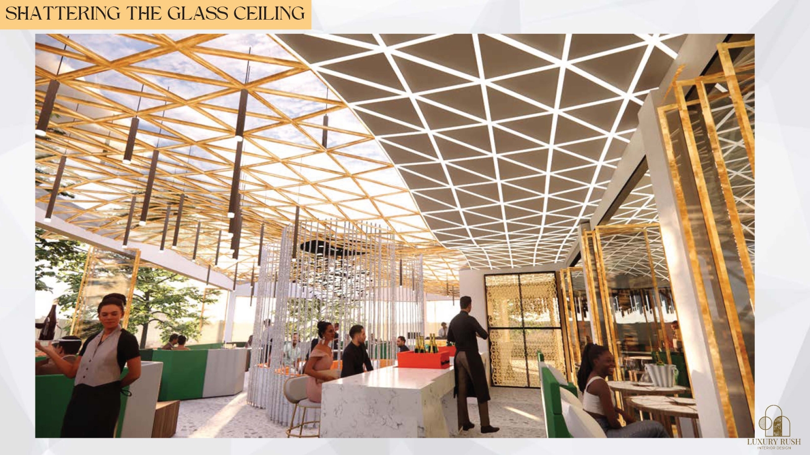 This design is for the proposed Veuve Clicquot champagne bar situated in the affluent suburb of Sandton. The brand’s objective is to attract younger consumers by creating the sense of “accessible luxury”. This is achieved by incorporating luxury materials in a contemporary design. The concept of this design is a metaphorical collision between a comet, a signature symbol for the brand, and a glass of Veuve Clicquot champagne. This is to demonstrate the glass ceiling Madame Clicquot shattered as a woman in her era. The use of “cosmic zonings” relate back to the concept with a shattered glass ceiling, etc.