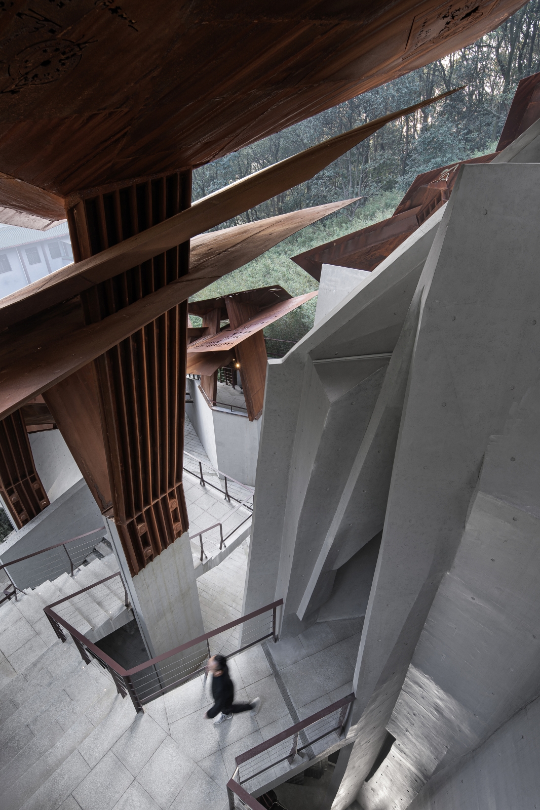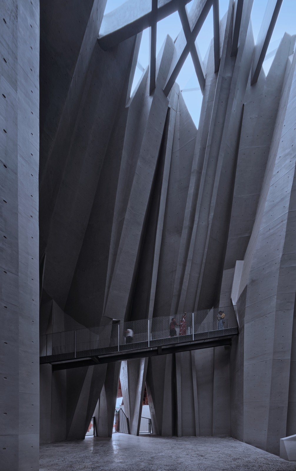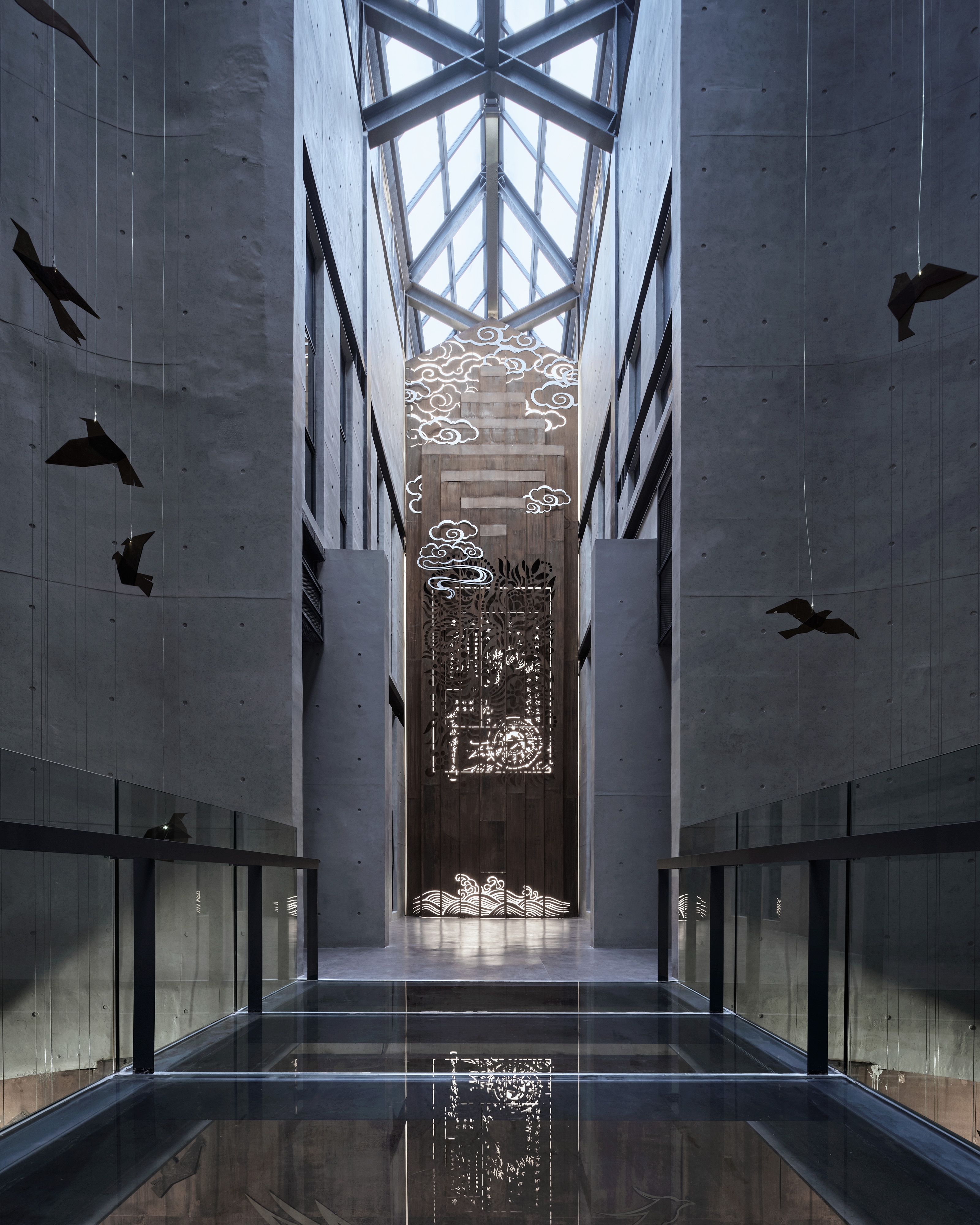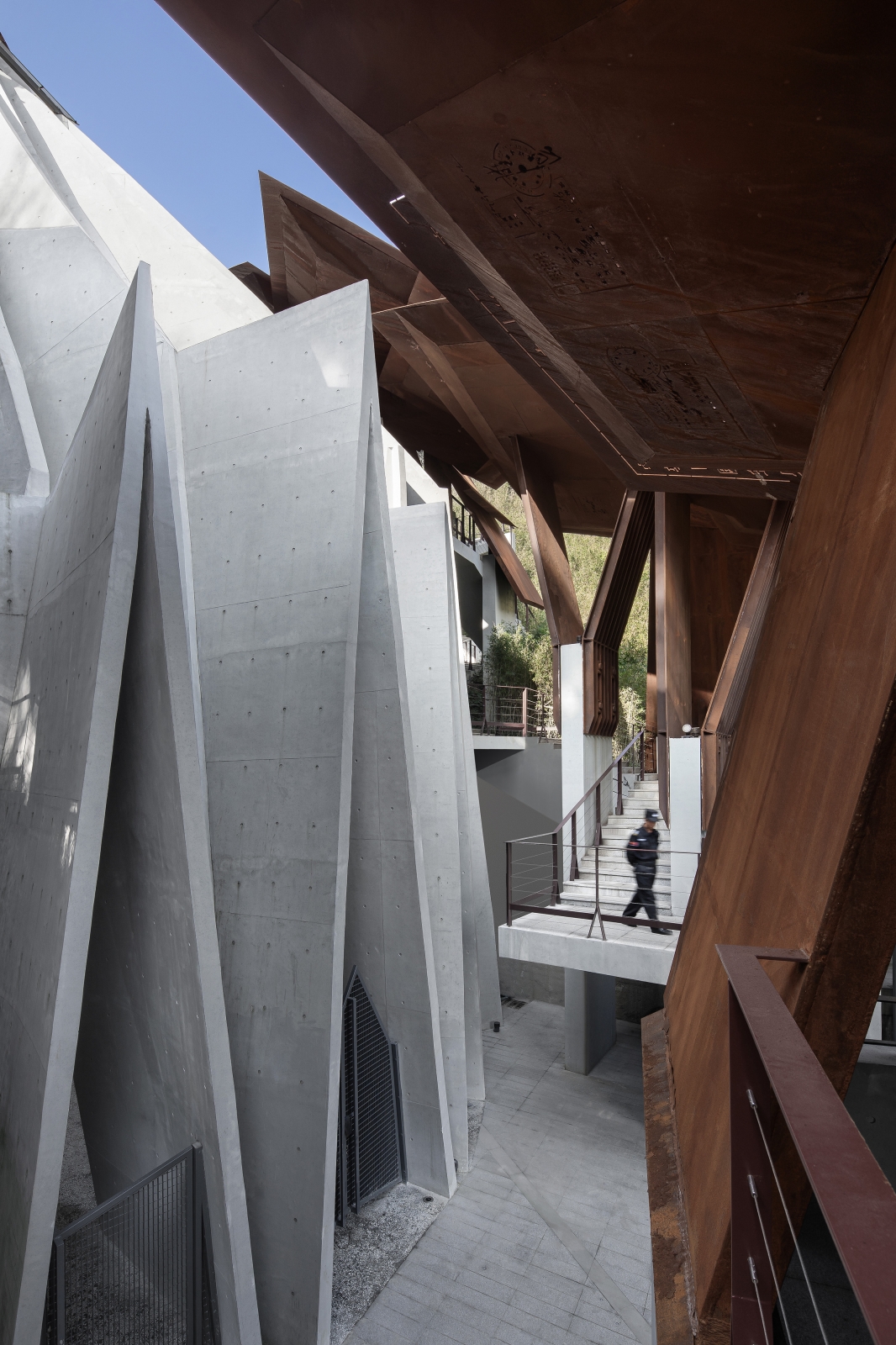 The museum is situated in the valley of two mountains. The boundary is designed to be open, with the elevation impression changing and evolving when viewed from the adjacent hiking trails. The overlapping plates allow a sunshade effect, which define an inner space of movement, symbolically forming a "channel of life " guided by the "visas".