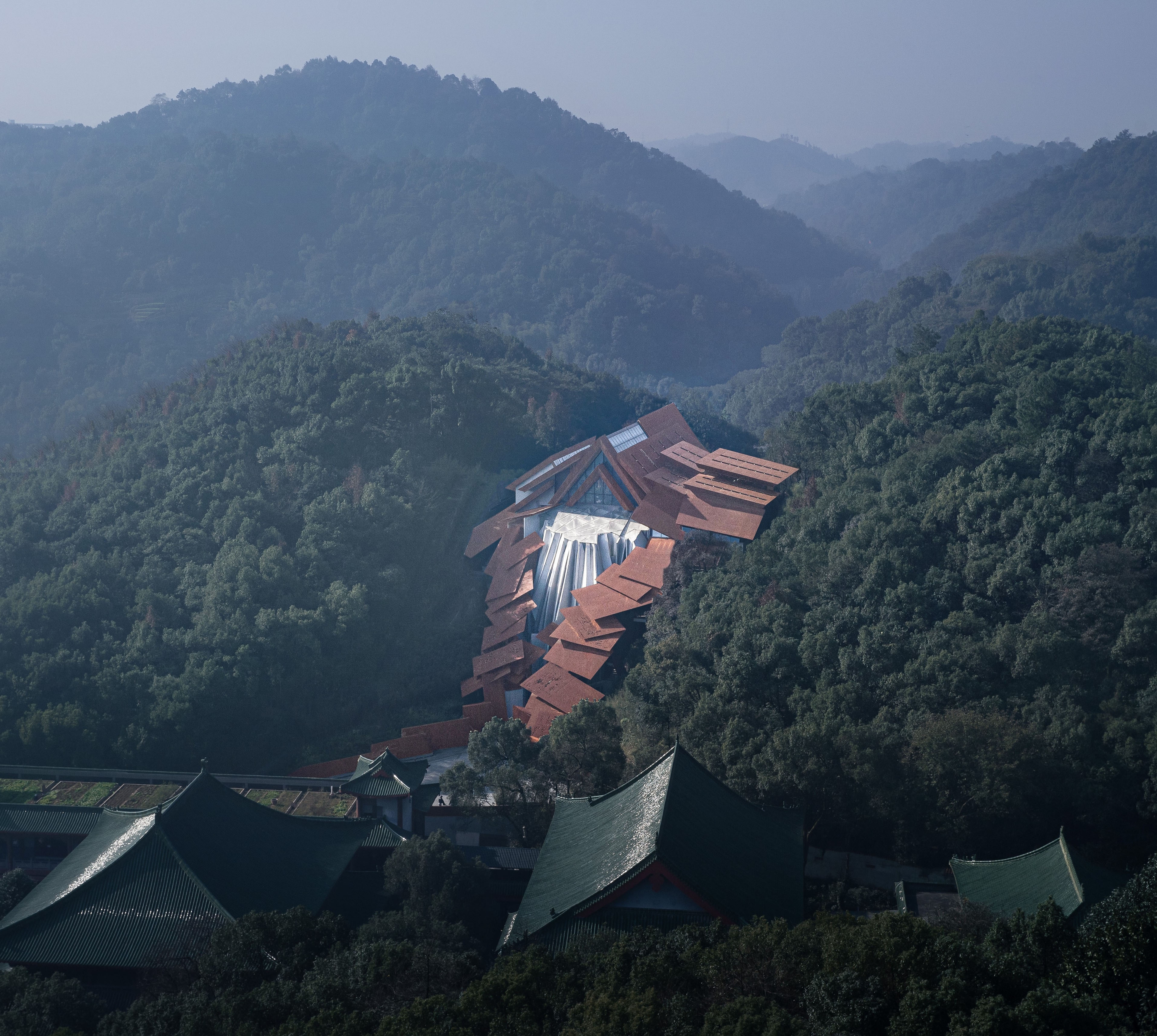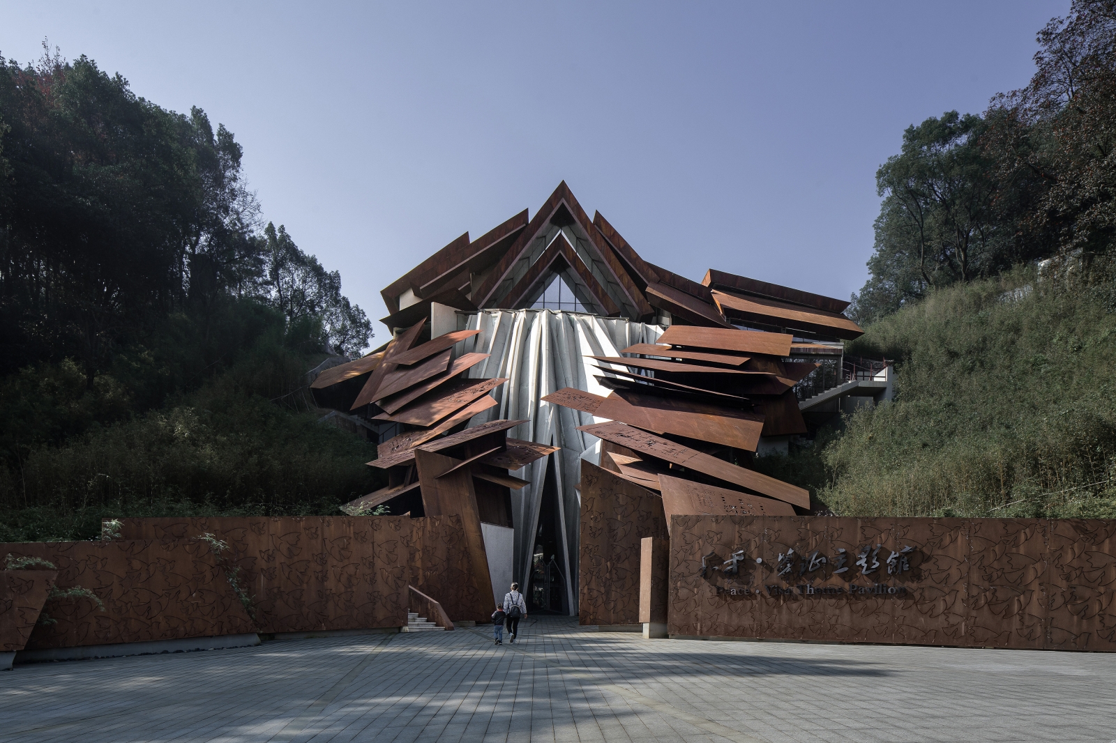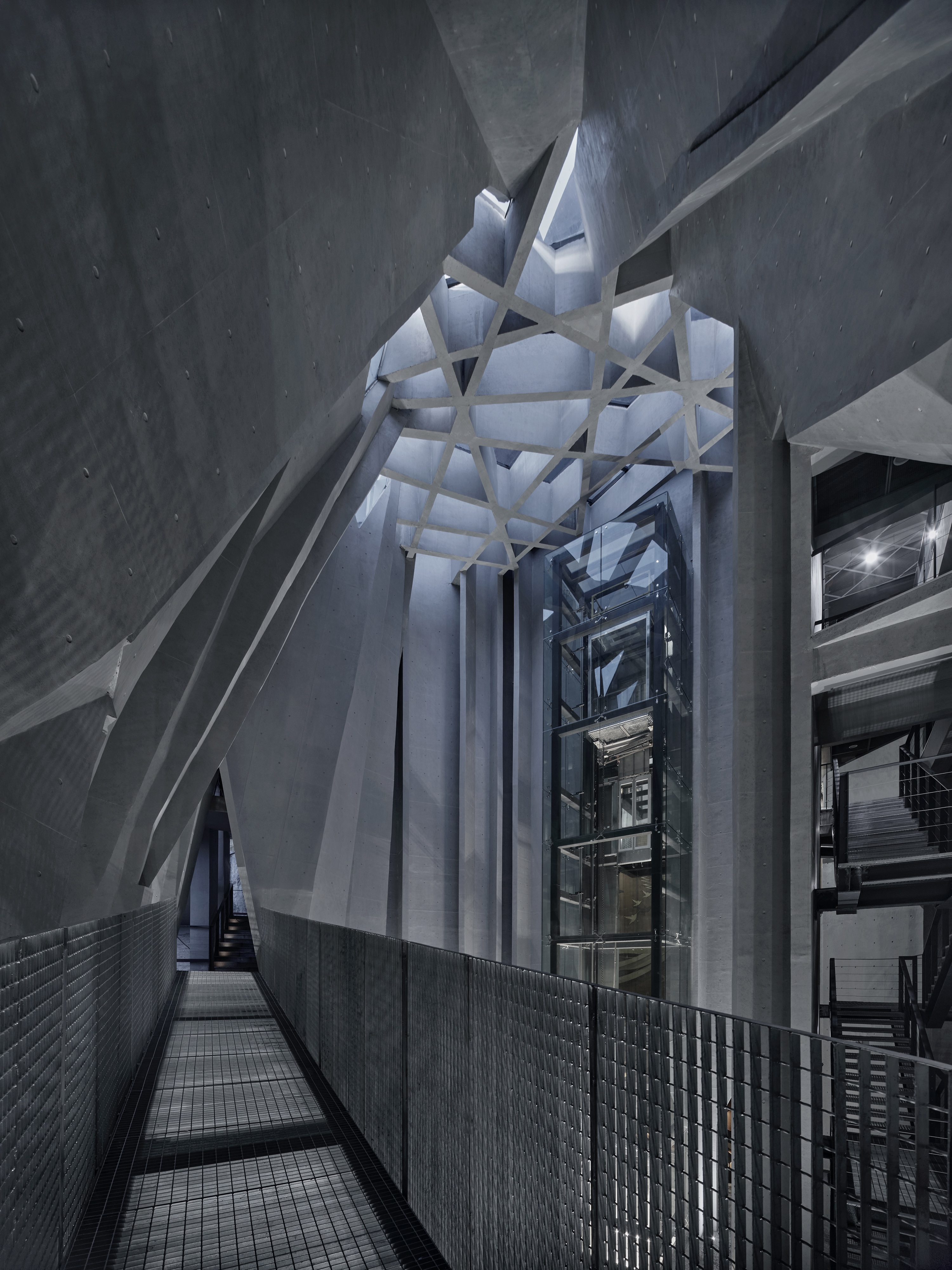 The museum is situated in the valley of two mountains. The boundary is designed to be open, with the elevation impression changing and evolving when viewed from the adjacent hiking trails. The overlapping plates allow a sunshade effect, which define an inner space of movement, symbolically forming a "channel of life " guided by the "visas".