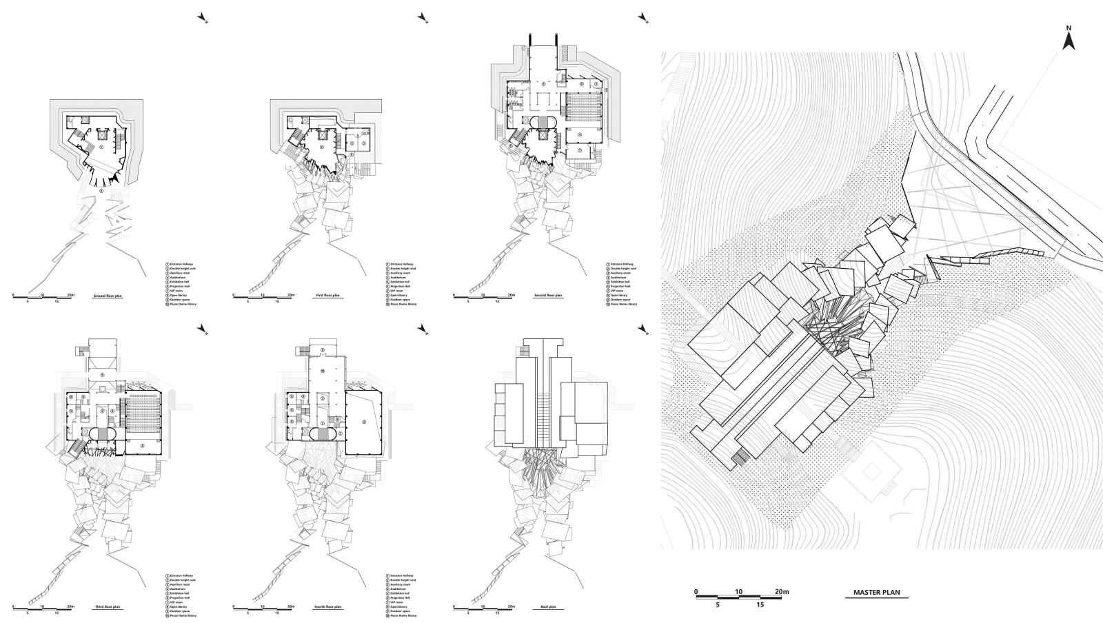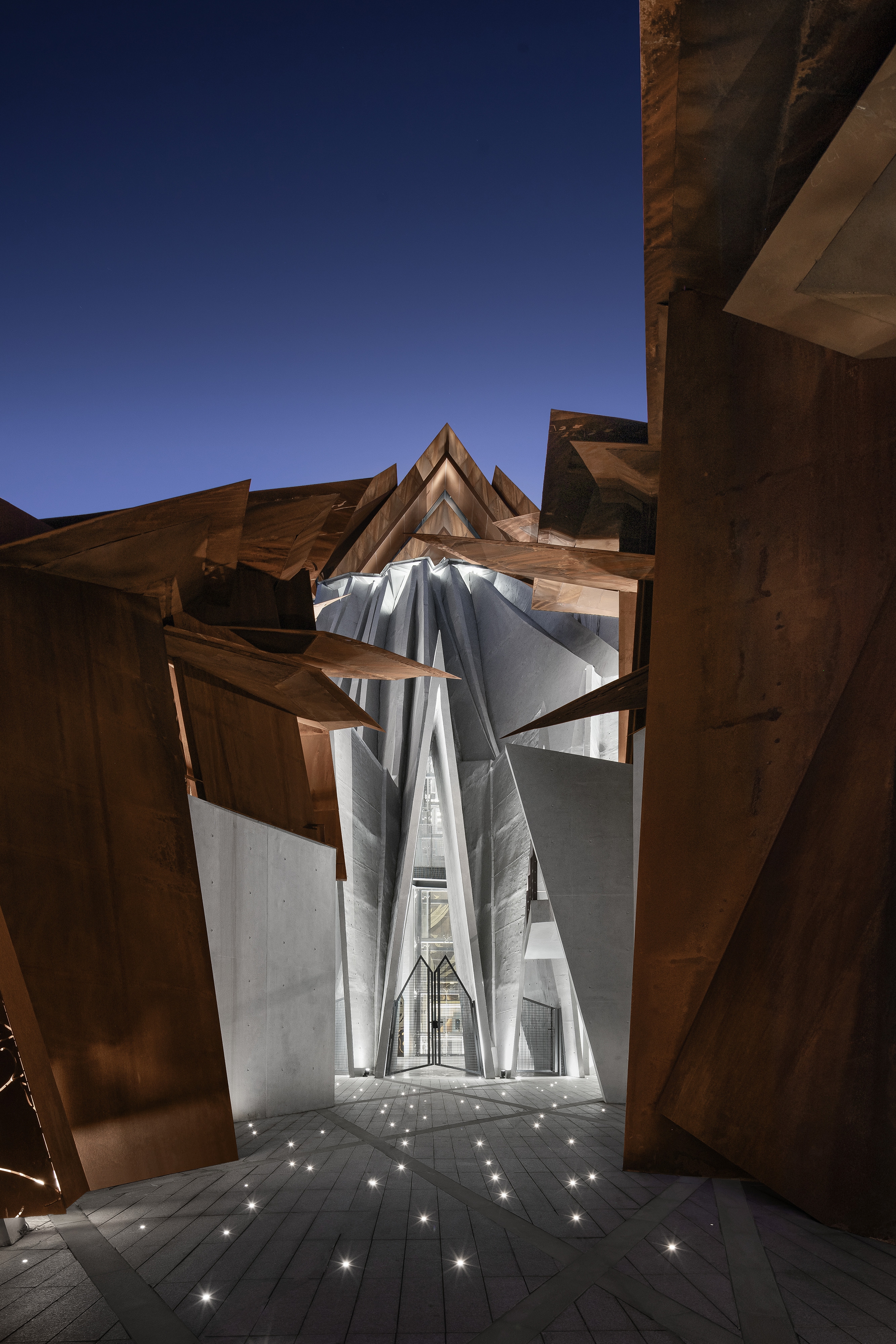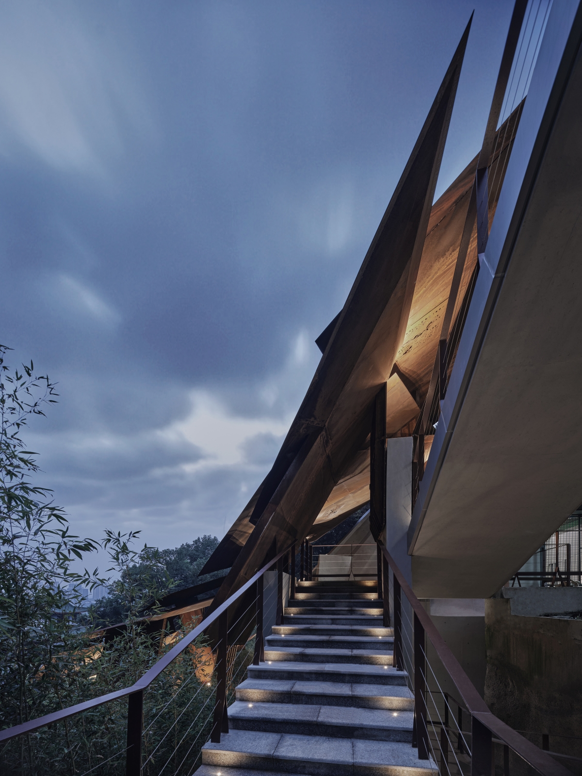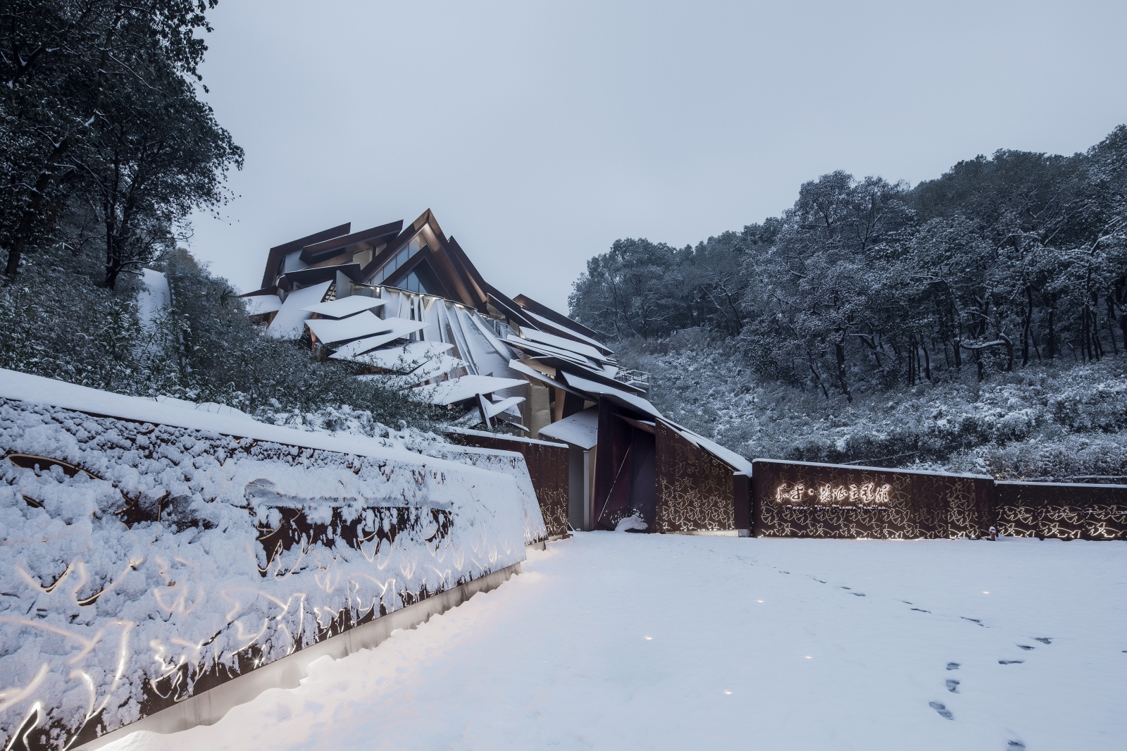 The museum is situated in the valley of two mountains. The boundary is designed to be open, with the elevation impression changing and evolving when viewed from the adjacent hiking trails. The overlapping plates allow a sunshade effect, which define an inner space of movement, symbolically forming a "channel of life " guided by the "visas".