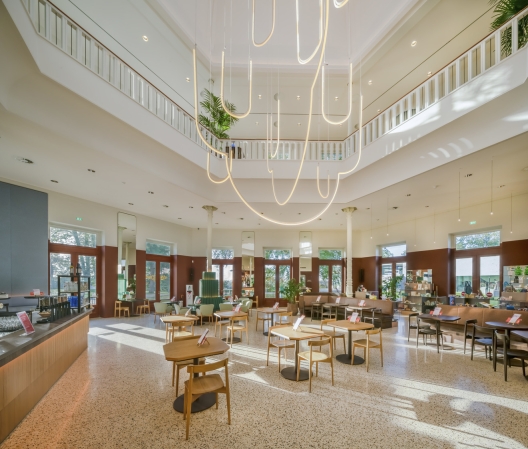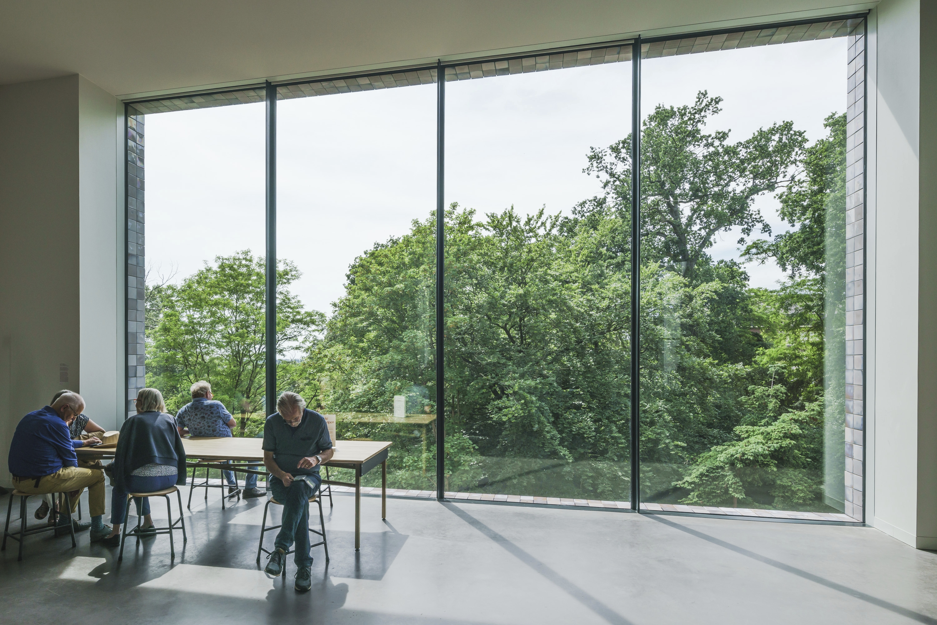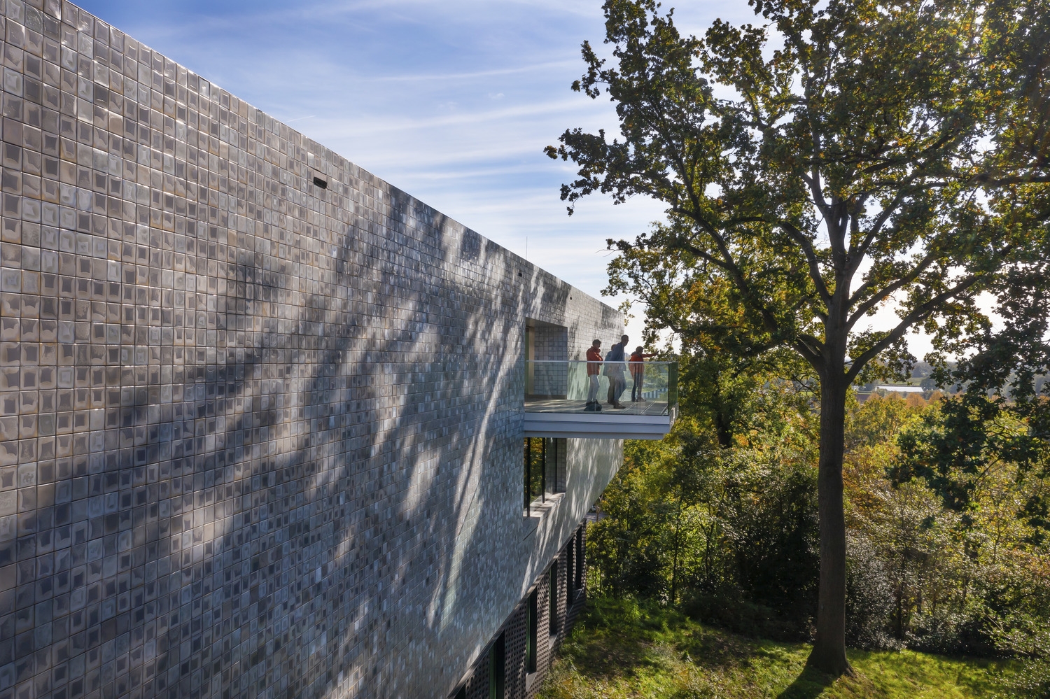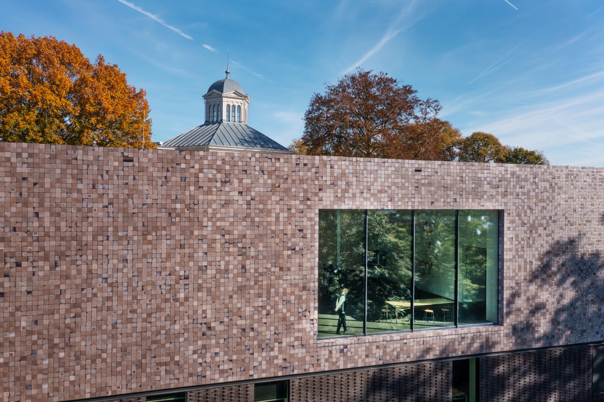 For the renovation of Museum Arnhem we designed the unique new extension and restored of the old building. Special feature is the new floating wing, balancing 15m over the moraine. The façade is tiled with 82000 unique, hand-crafted tiles with a natural color gradient. The combination of the natural colors and the contrasting shape make the building stand out but also fit in with the surroundings. The museum now has 1,935 m2 of state-of-the-art exhibition space: 5 new exhibition halls and 2 public spaces, interconnected with a natural routing. Quiet exhibition rooms are interspersed with reflection rooms with large windows offering spectacular views. The monumental dome of Cornelis Outshoorn from 1873, originally a gentlemen's society, has been restored to its former glory and regained its original, spatial character in the heart of the museum where the entrance, the shop and the café are housed. A monumental staircase piercing the new wing offers views of nature and also serves as a stage for performances in the public sculpture garden. The building has been transformed into a visible, well-organized and accessible new museum that connects the city with nature and art.
