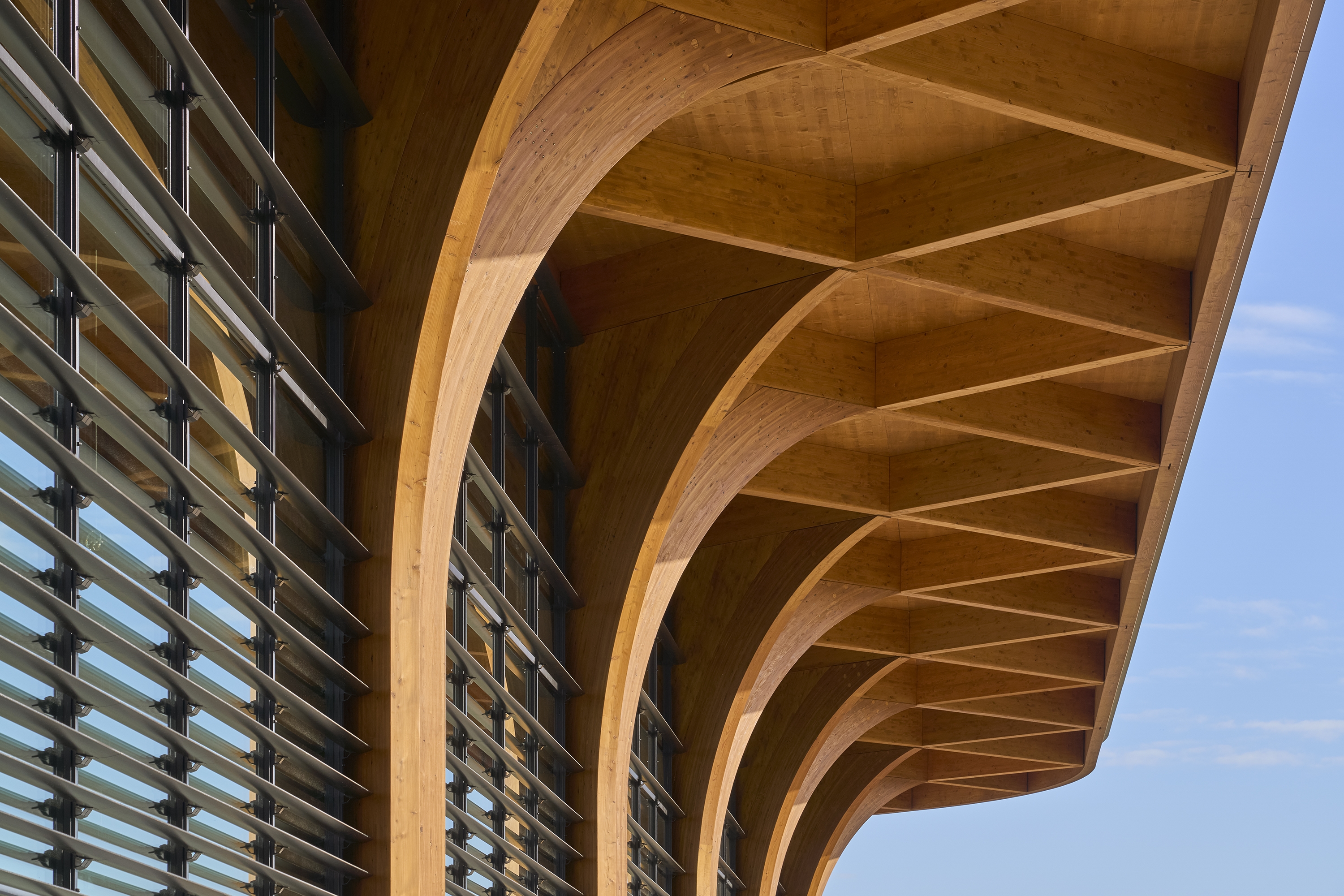 The building is expansive and transparent, with a support structure made of cross-shaped laminated wooden columns and beams. It has a large span, tall ceilings, and windowed walls, which create an open, luminous space, and pull the building into its green surroundings.