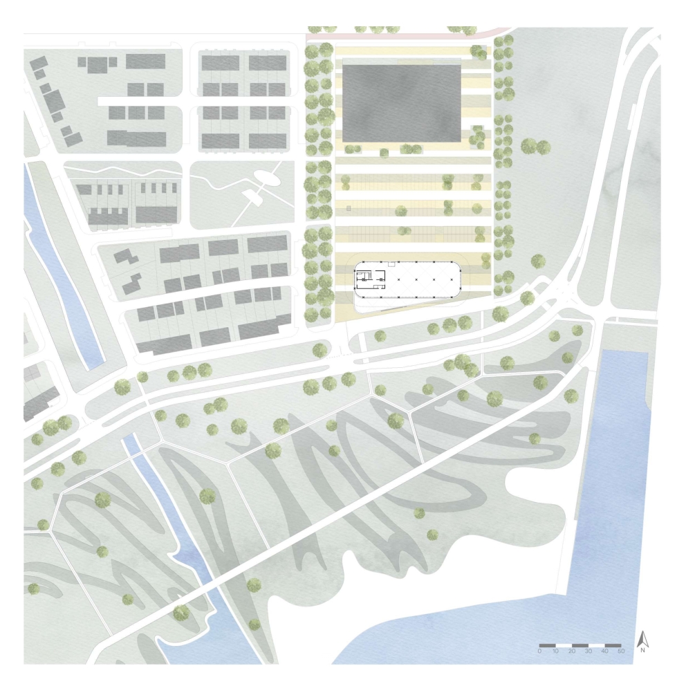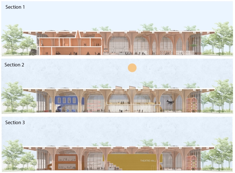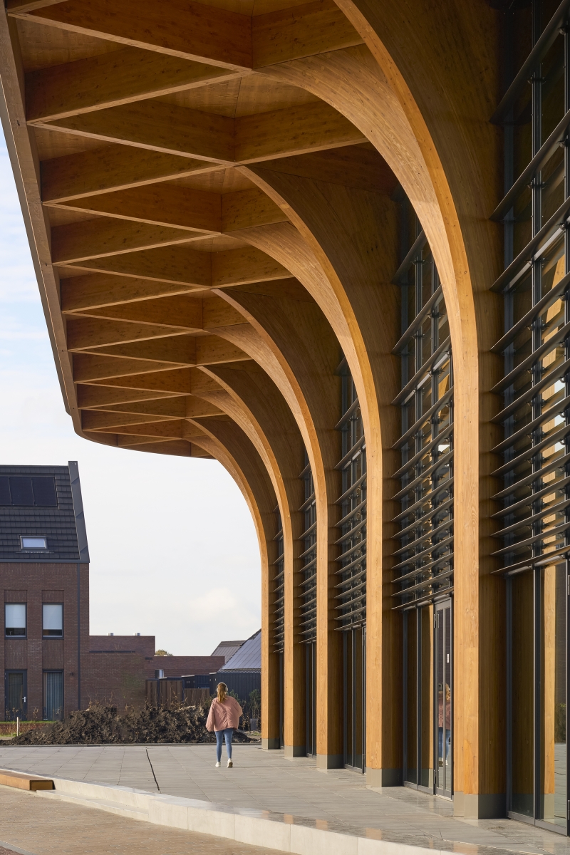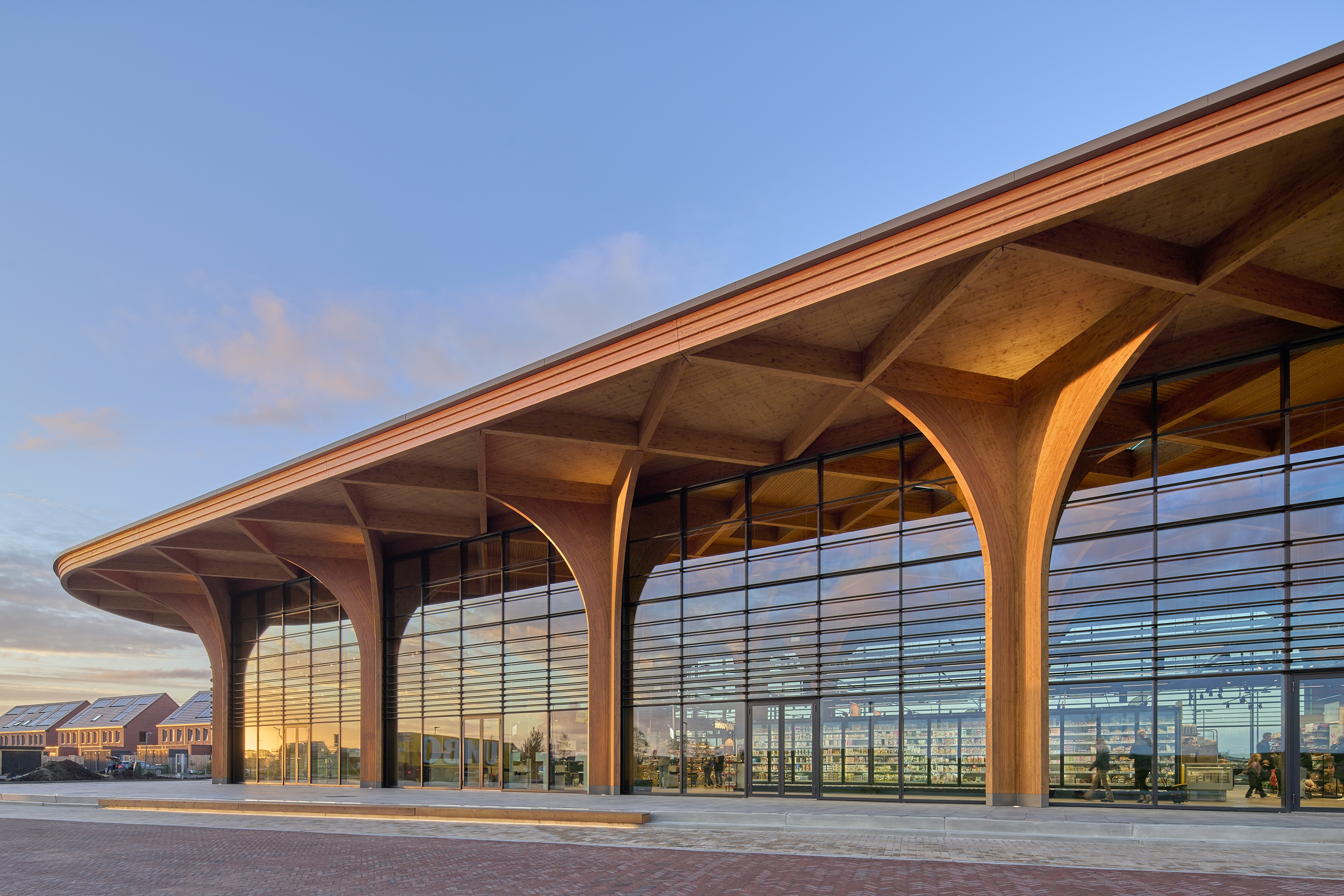 SuperHub was made sustainable through the primary use of wood, the installation of solar panels and circular air treatment and heating systems, and the placement of plants for bees and insects on its roof. The structure’s open and flexible layout allows for its functions to be reinvented along with the changing needs of the community. As such, SuperHub will never become outdated or be demolished in the future, manifesting itself as a future-proof community centre that will grow along with the development of Meerstad.