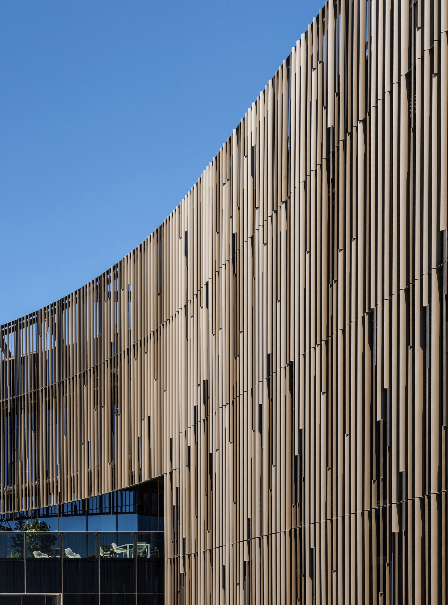 The most notable outcome is an array of fixed aluminum louvers, generated through the synthesis of multiple competing requirements [performative, aesthetic, formal, physical]. This approach re-couples the façade strategically with both the performative & the practical, indexing the needs of the building against its performative requirements while acknowledging its place in both the tradition of architecture & the urban environment.