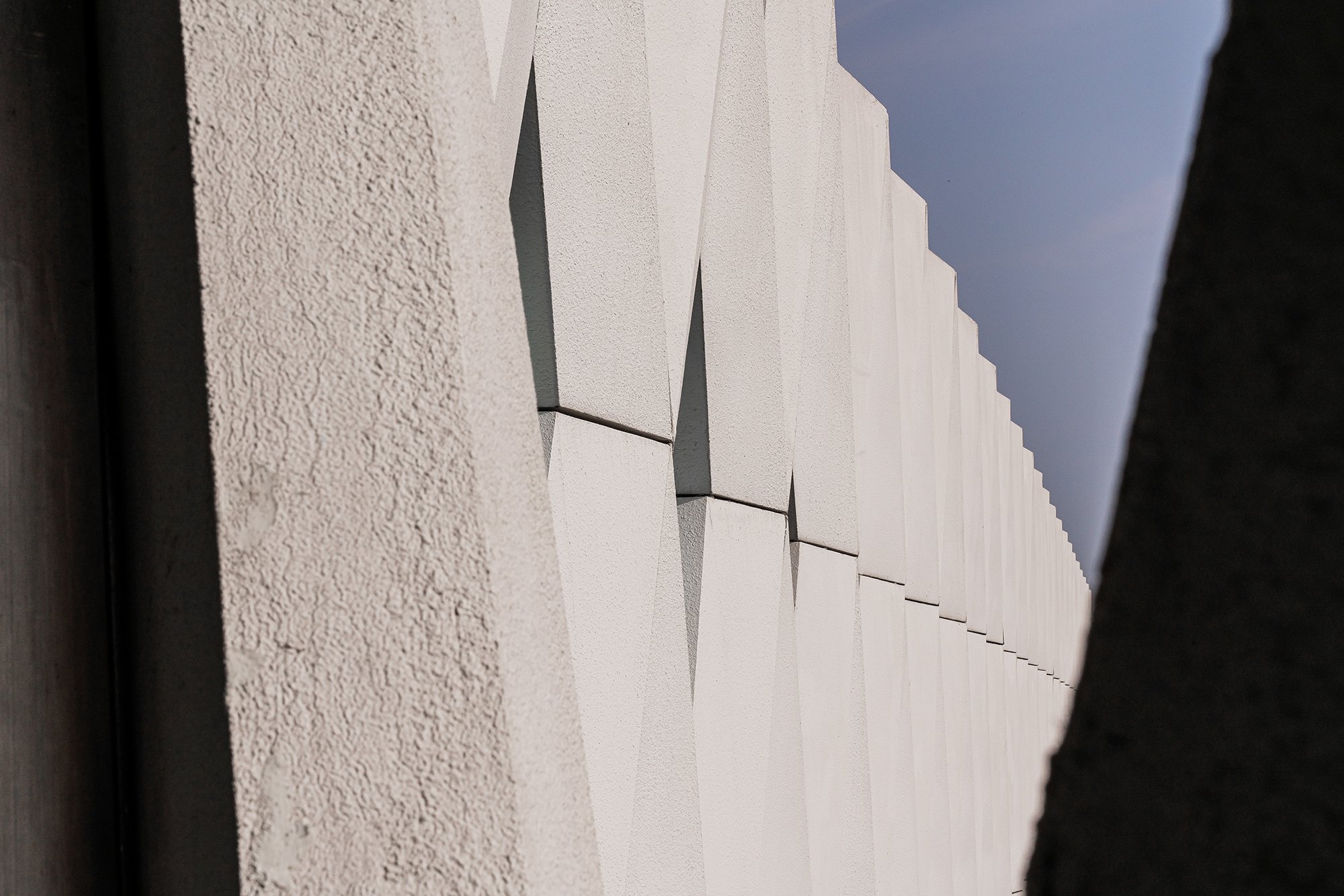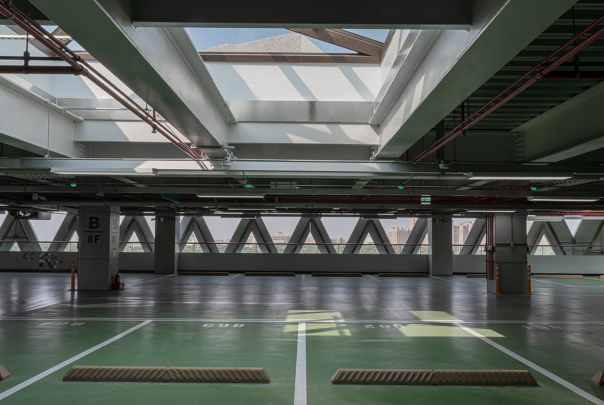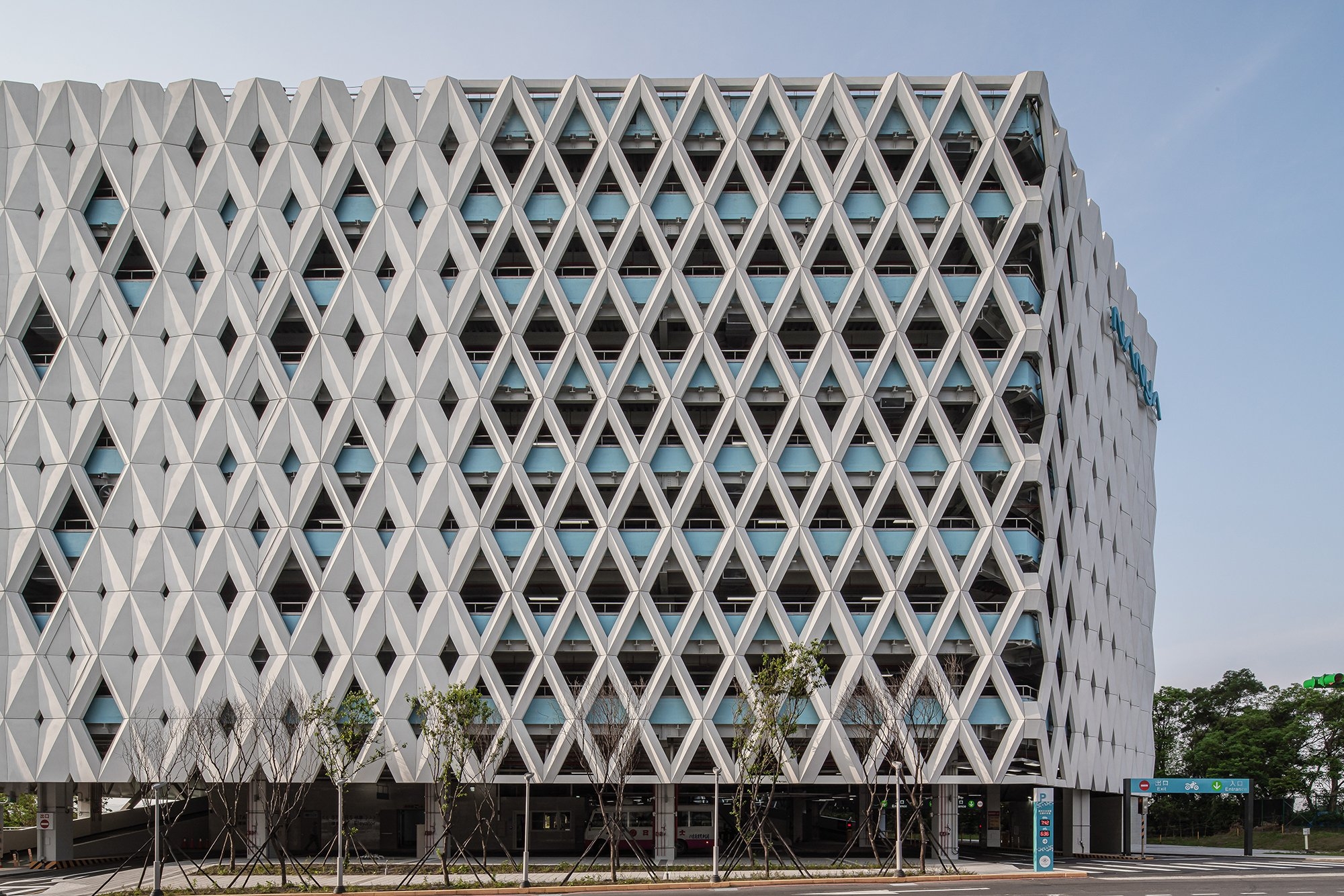 The team has designed a parking lot for a tech company building, incorporating the chain shape logo of the company into the building facade as geometric patterns. This design symbolizes the interconnectedness, cooperation, and harmonious relationship among the business partners, as well as the continuous creativity and development of the firm.