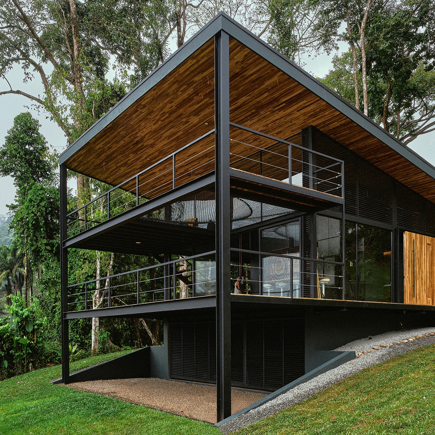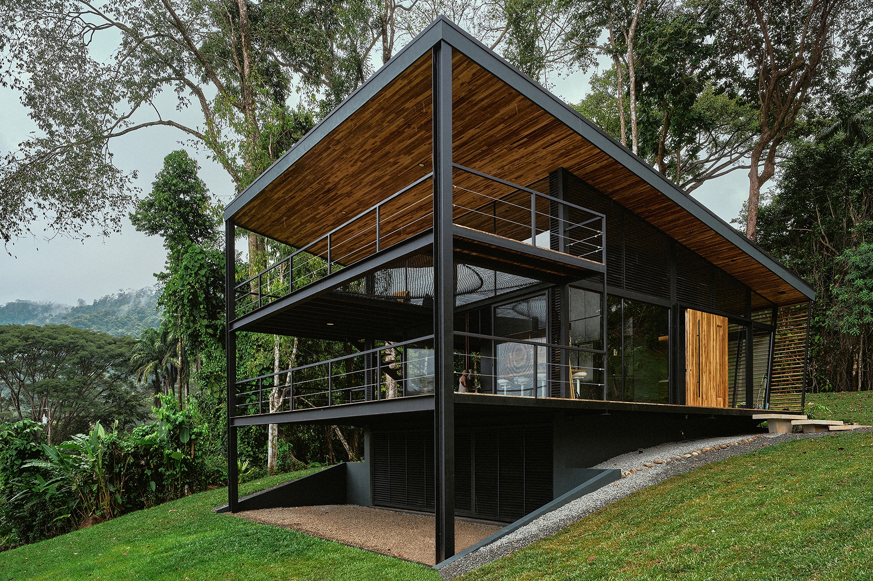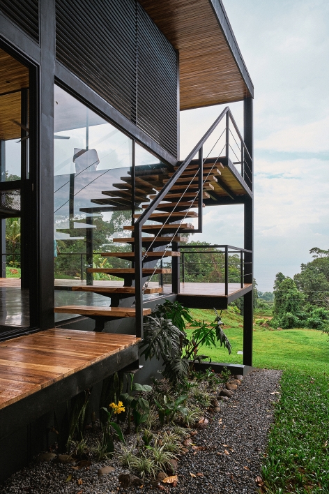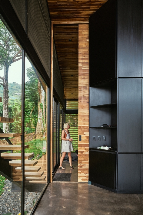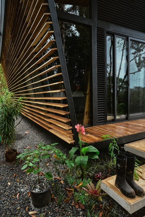 The Black House is located along the southern Pacific coast of Costa Rica. It has been developed as a new prototype for the modular No Footprint House series (NFH). The climate-responsive design of the NFH variations is based on passive strategies such as site-specific positioning and the use of natural resources for cross ventilation, solar shading and energy production, as well as rainwater harvesting and biological water filtration. Industrial building techniques and prefabricated components are used to create a high level of efficiency that can be delivered to any target location. Since the creation of the multi-award winning first prototype of the NFH, new and alternative construction materials have been developed and integrated to continuously lower the environmental impact of the overall project while stimulating local and circular economies. The Black House was designed as a three-level typology with steel structure and wooden finishes, providing the spaces for its owners to live and work in one compact unit. Operable facade elements open the building interiors towards their natural surroundings, resulting in a symbiotic relationship among nature and the built environment.