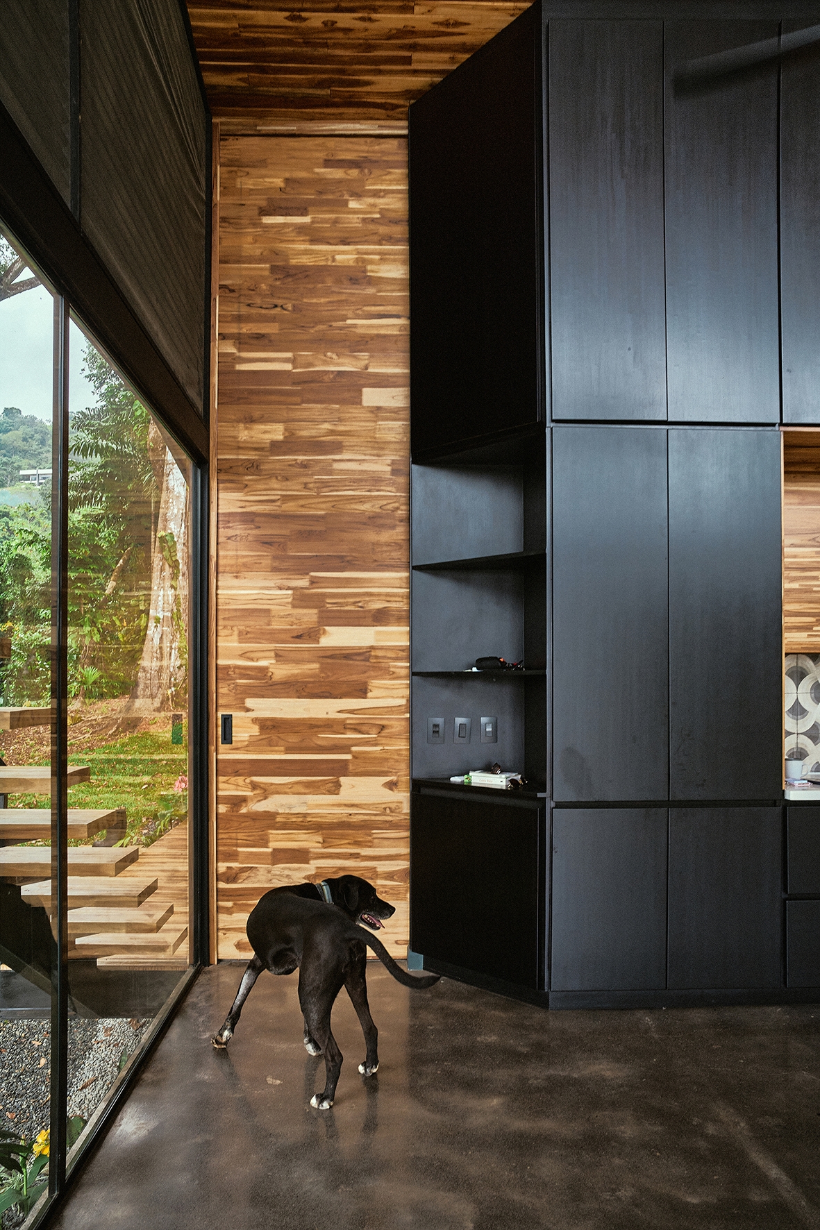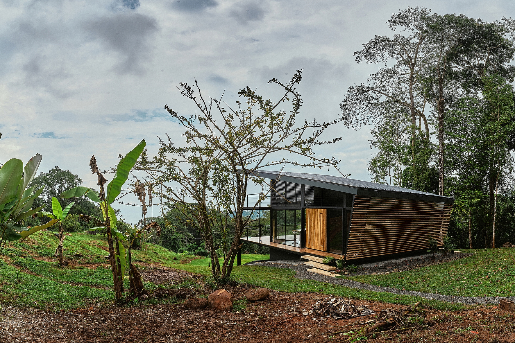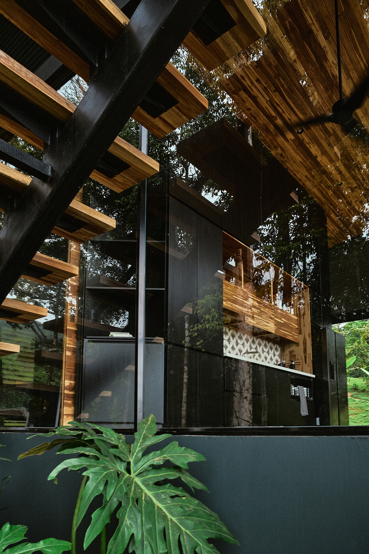 The Black House is located along the southern Pacific coast of Costa Rica. It has been developed as a new prototype for the modular No Footprint House series (NFH). The climate-responsive design of the NFH variations is based on passive strategies such as site-specific positioning and the use of natural resources for cross ventilation, solar shading and energy production, as well as rainwater harvesting and biological water filtration. Industrial building techniques and prefabricated components are used to create a high level of efficiency that can be delivered to any target location. Since the creation of the multi-award winning first prototype of the NFH, new and alternative construction materials have been developed and integrated to continuously lower the environmental impact of the overall project while stimulating local and circular economies. The Black House was designed as a three-level typology with steel structure and wooden finishes, providing the spaces for its owners to live and work in one compact unit. Operable facade elements open the building interiors towards their natural surroundings, resulting in a symbiotic relationship among nature and the built environment.