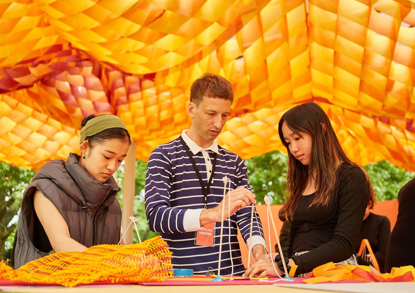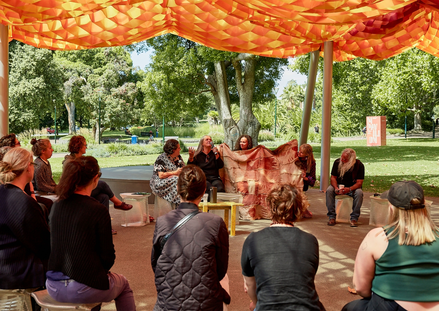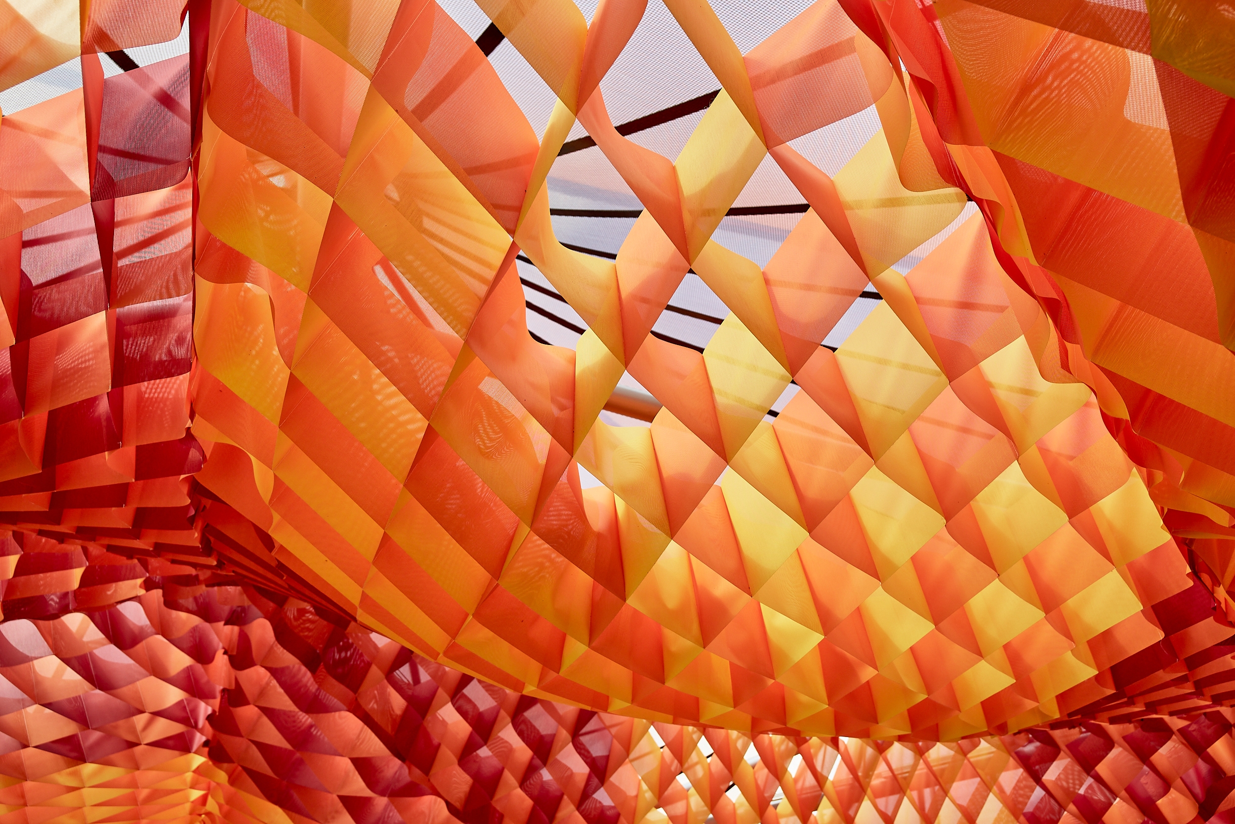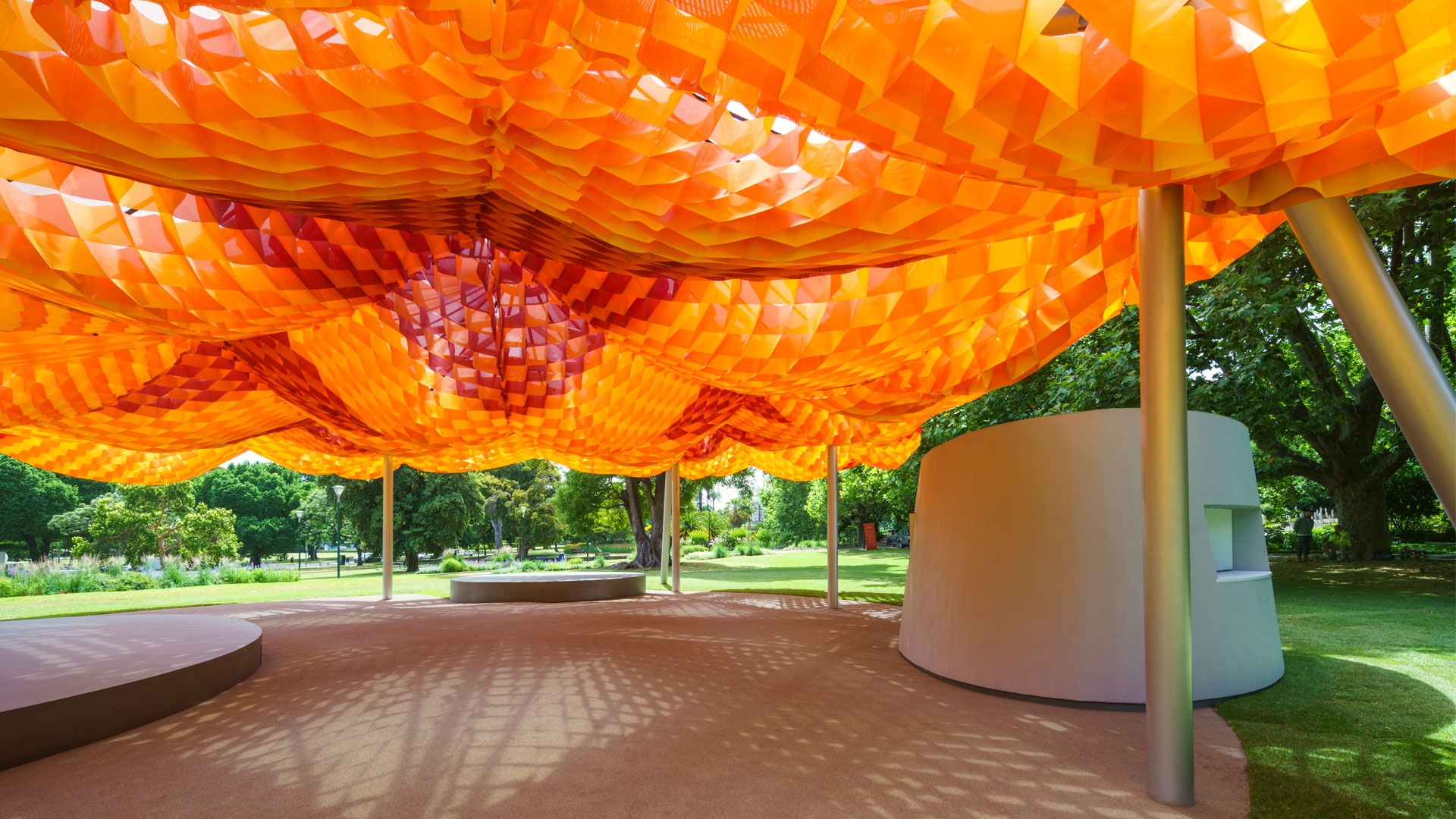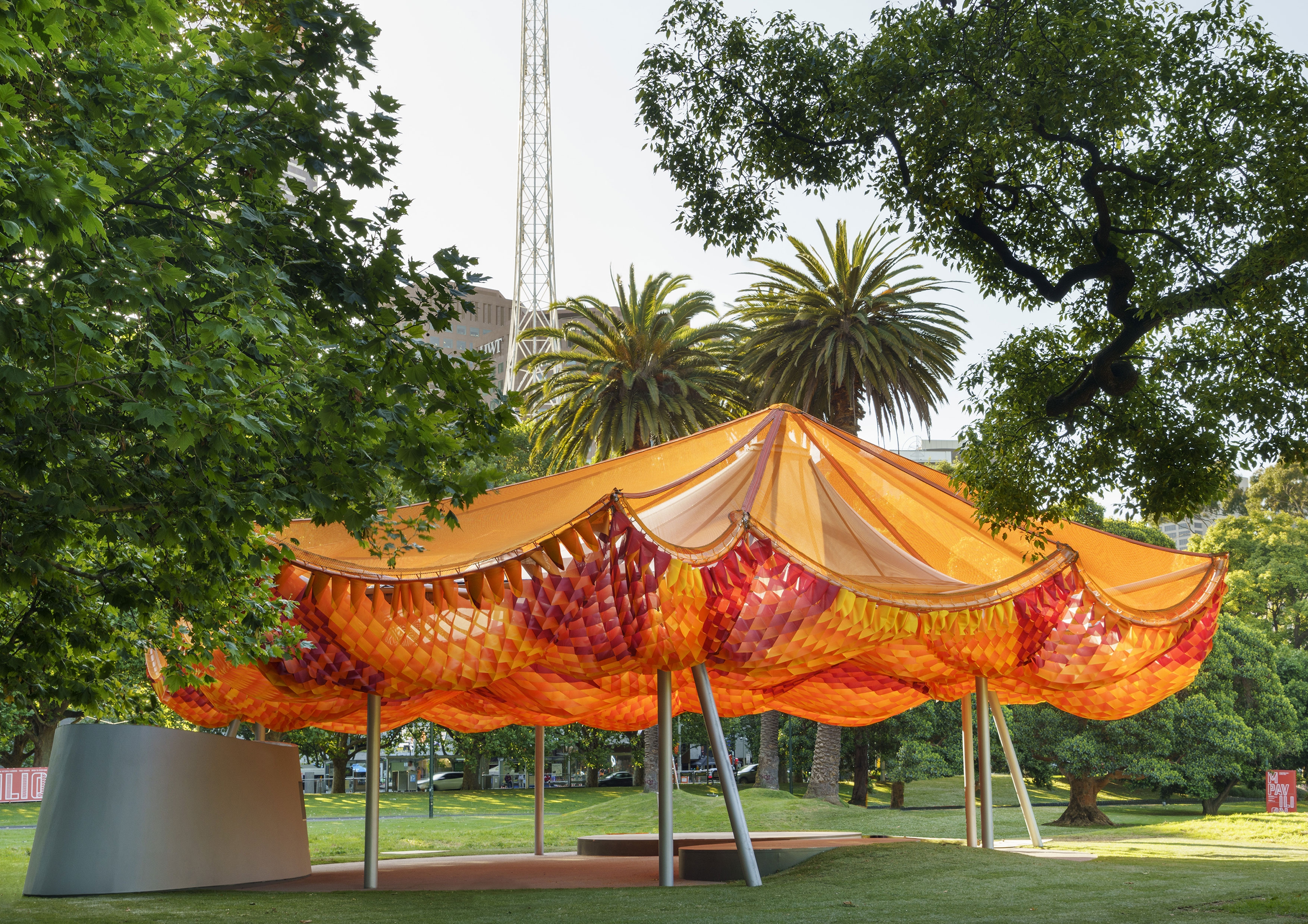 The architects envisioned MPavilion 2022 as a light, vibrant fabric-based canopy that encourages communal gathering. The sustainable, human-centred design upholds the philosophy of ‘living lightly’ through an innovative three-layered marquee that explores the potential of tensile architecture. The uppermost layer is a bright, tactile fishing net. The middle layer is crafted from a weather-proof STFE membrane never before used in Australia. The lowermost layer comprises a waffle of colourful fabric that moves with the breeze creating dappled light. This complex form is supported by a solid steel structure.