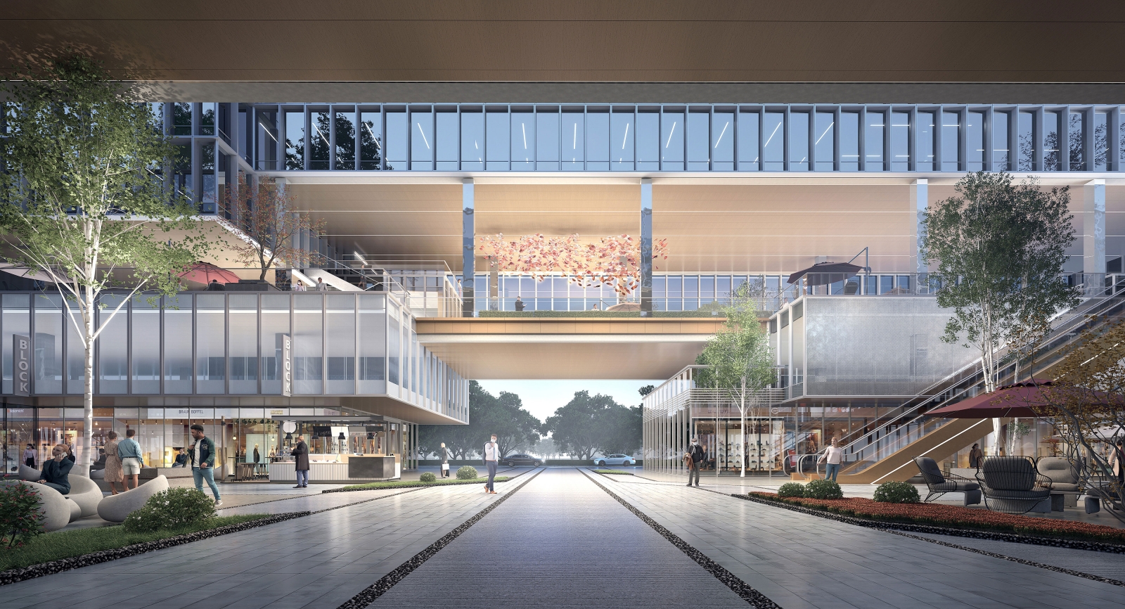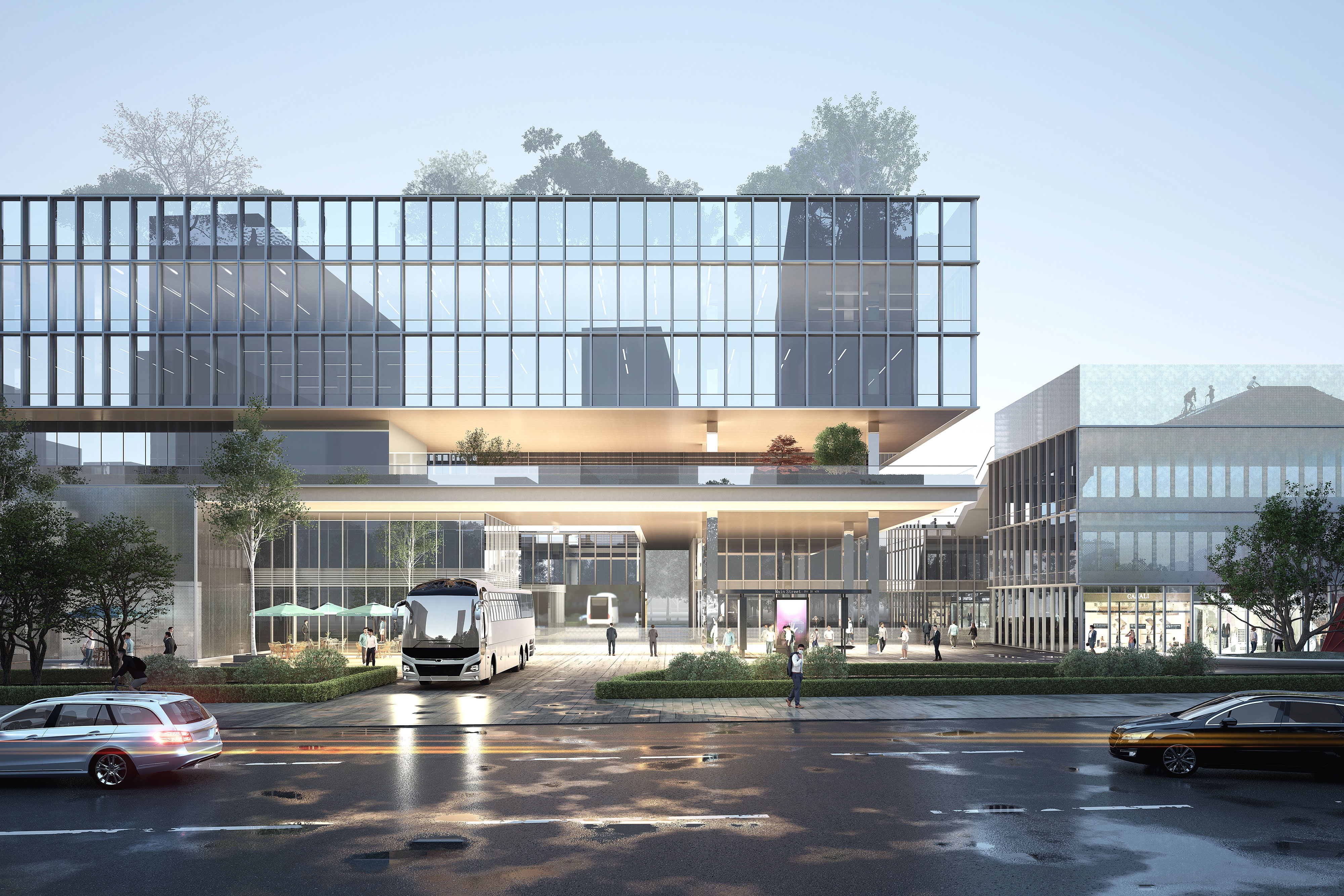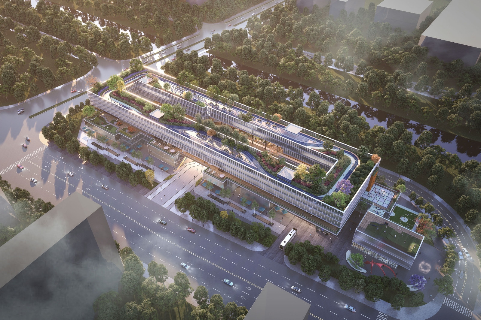 The Shuangxi Lake Neighborhood Center in Jiaxing Economic Development Zone is a complex building with commercial areas, a bus terminal, health center, community services, a business hotel,and office spaces.