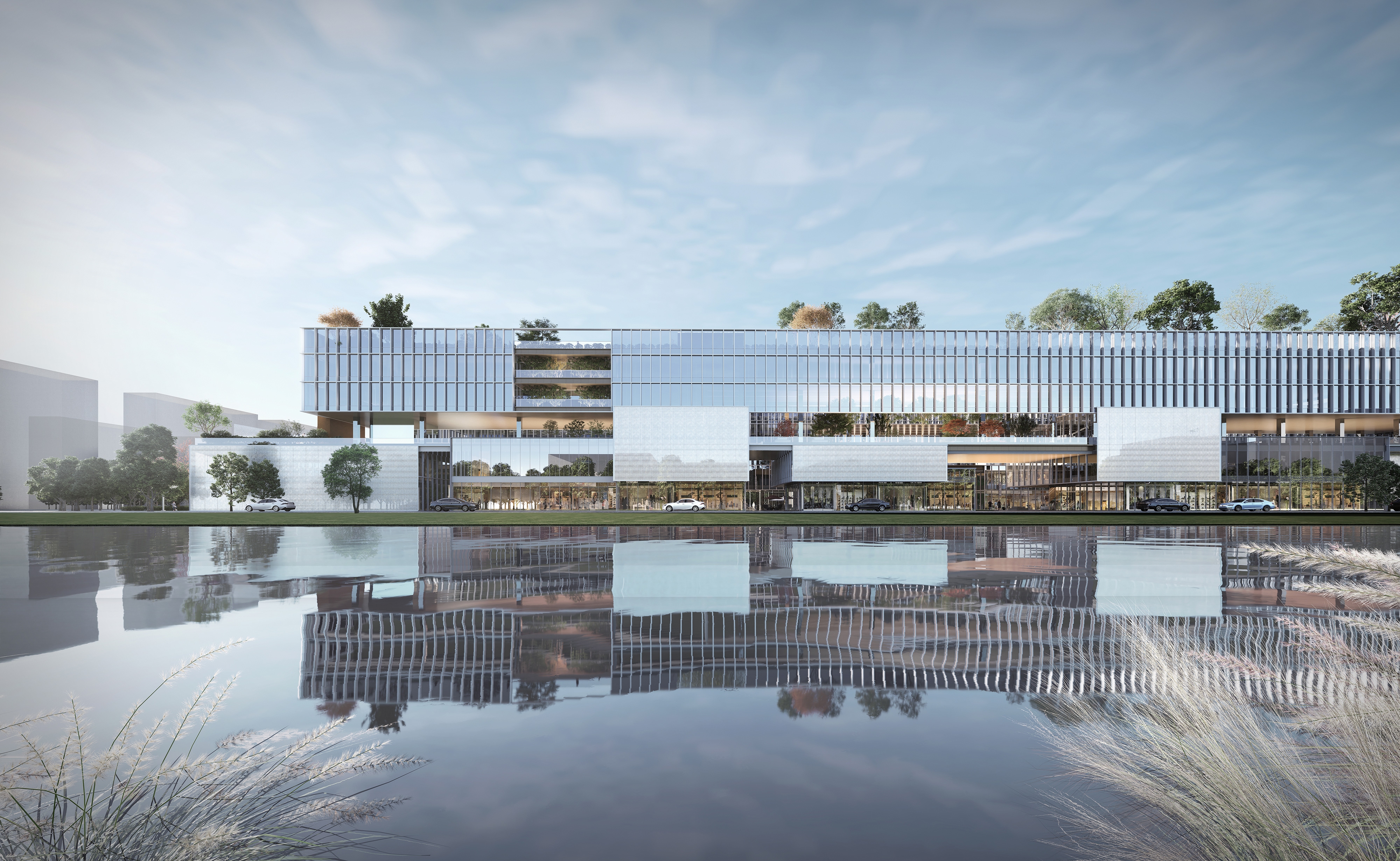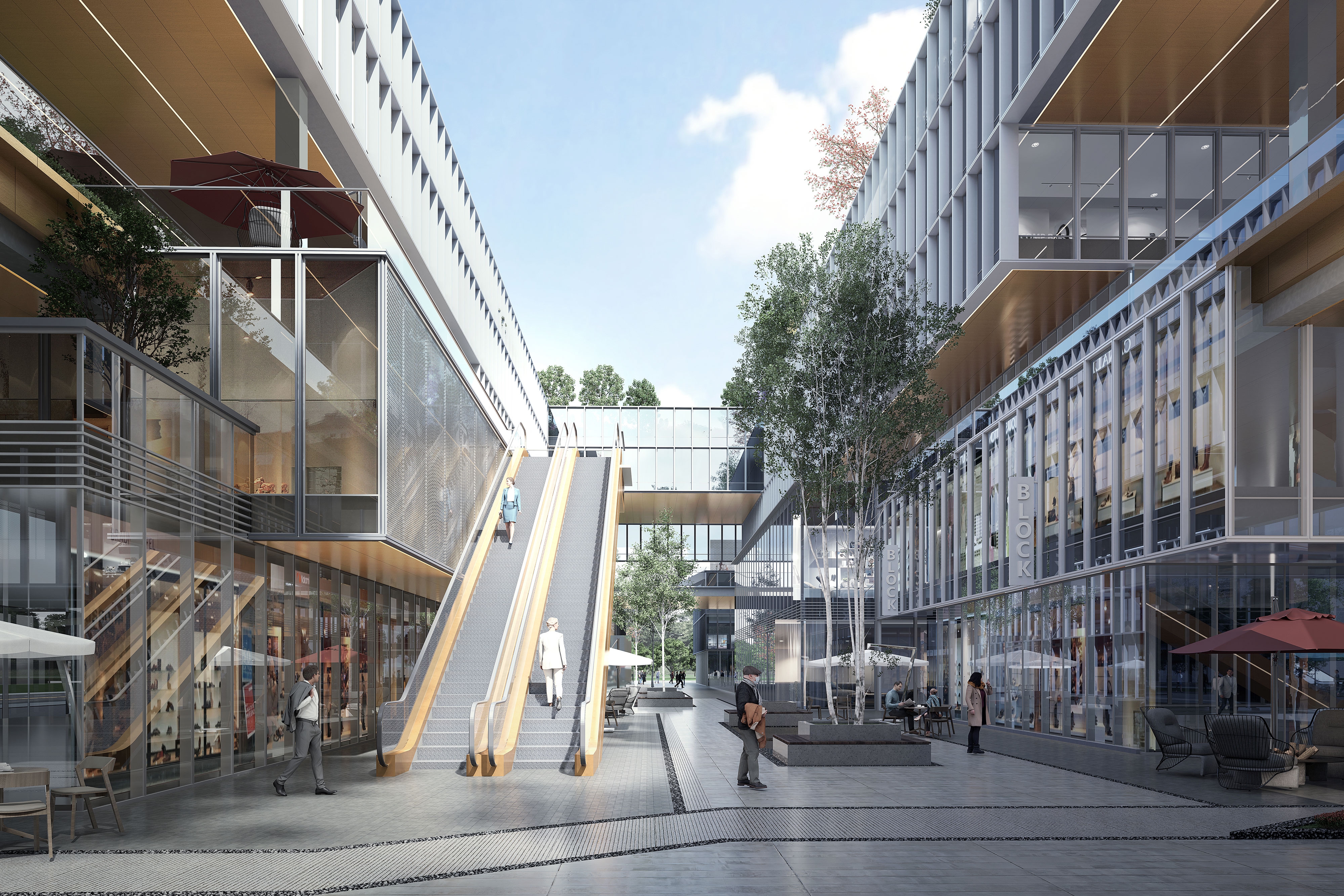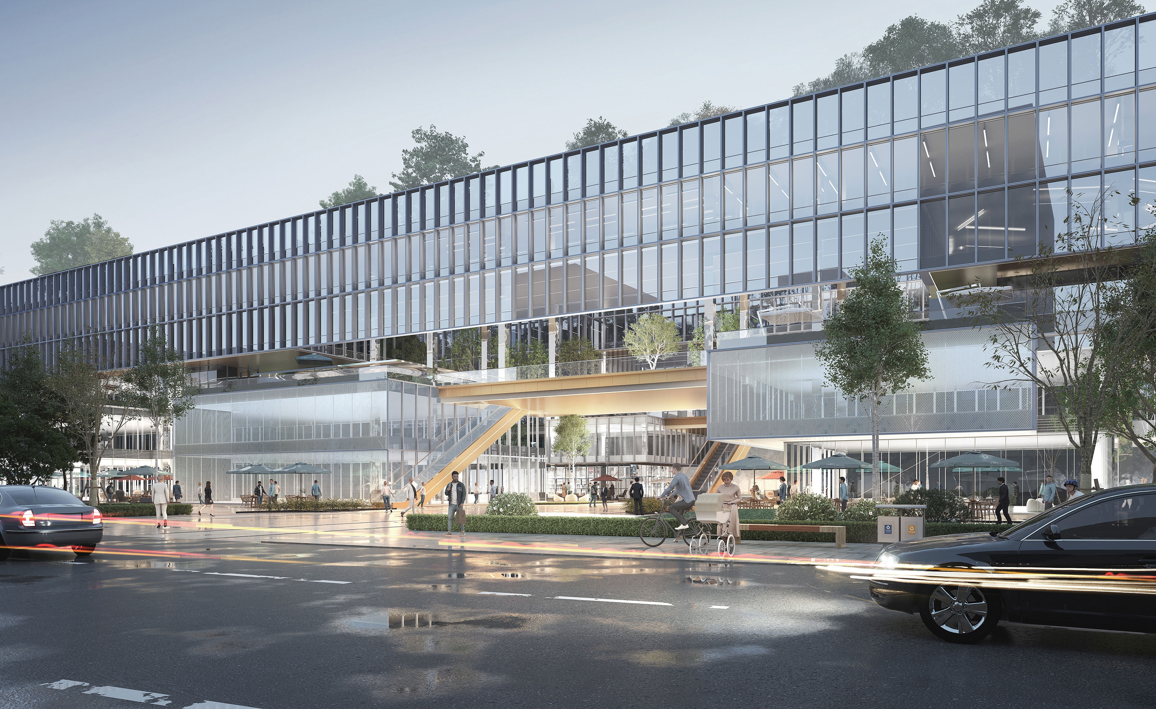 The Shuangxi Lake Neighborhood Center in Jiaxing Economic Development Zone is a complex building with commercial areas, a bus terminal, health center, community services, a business hotel,and office spaces.