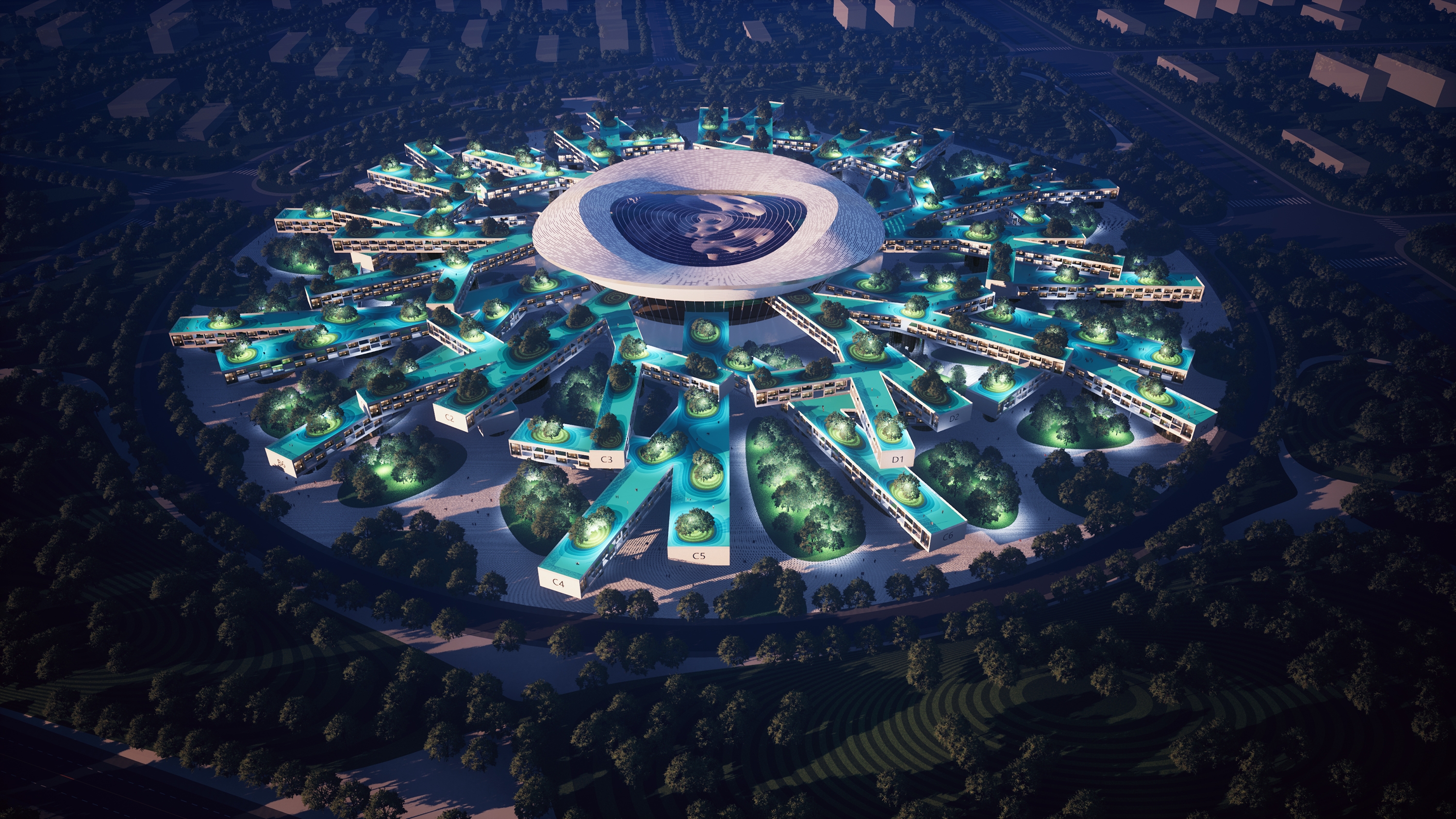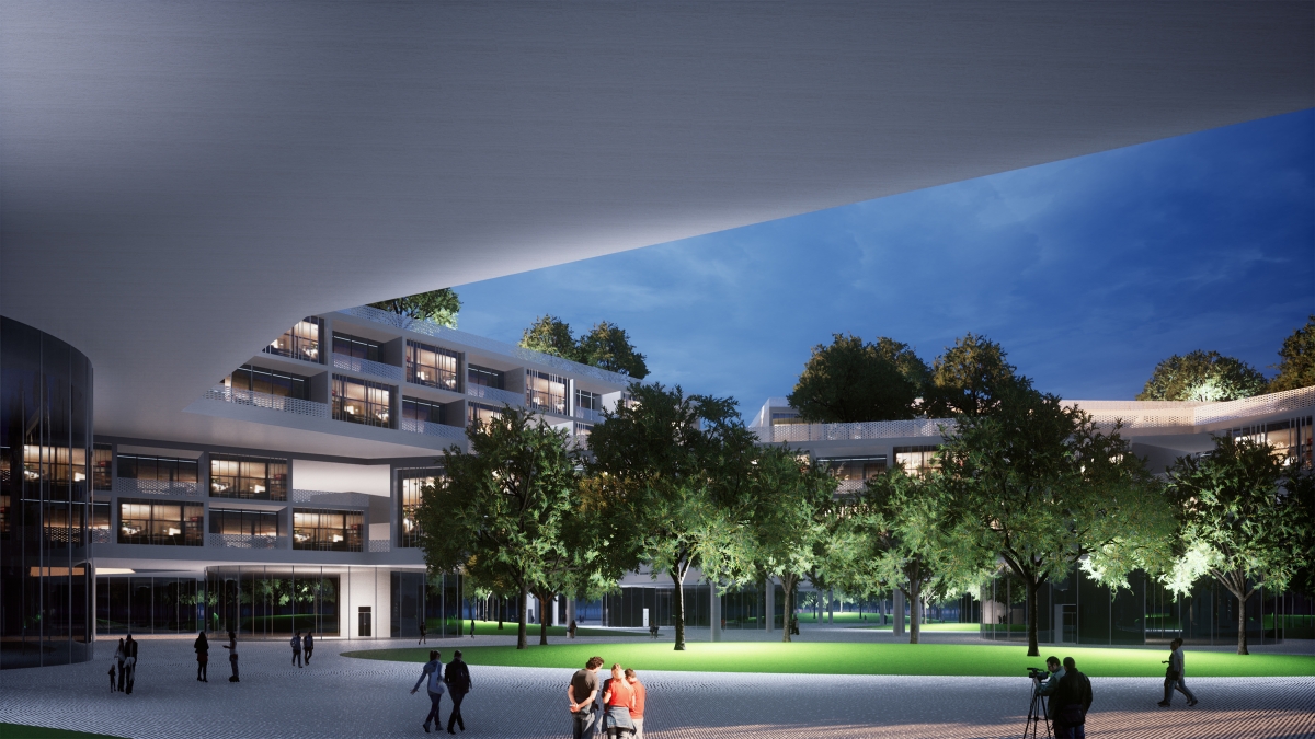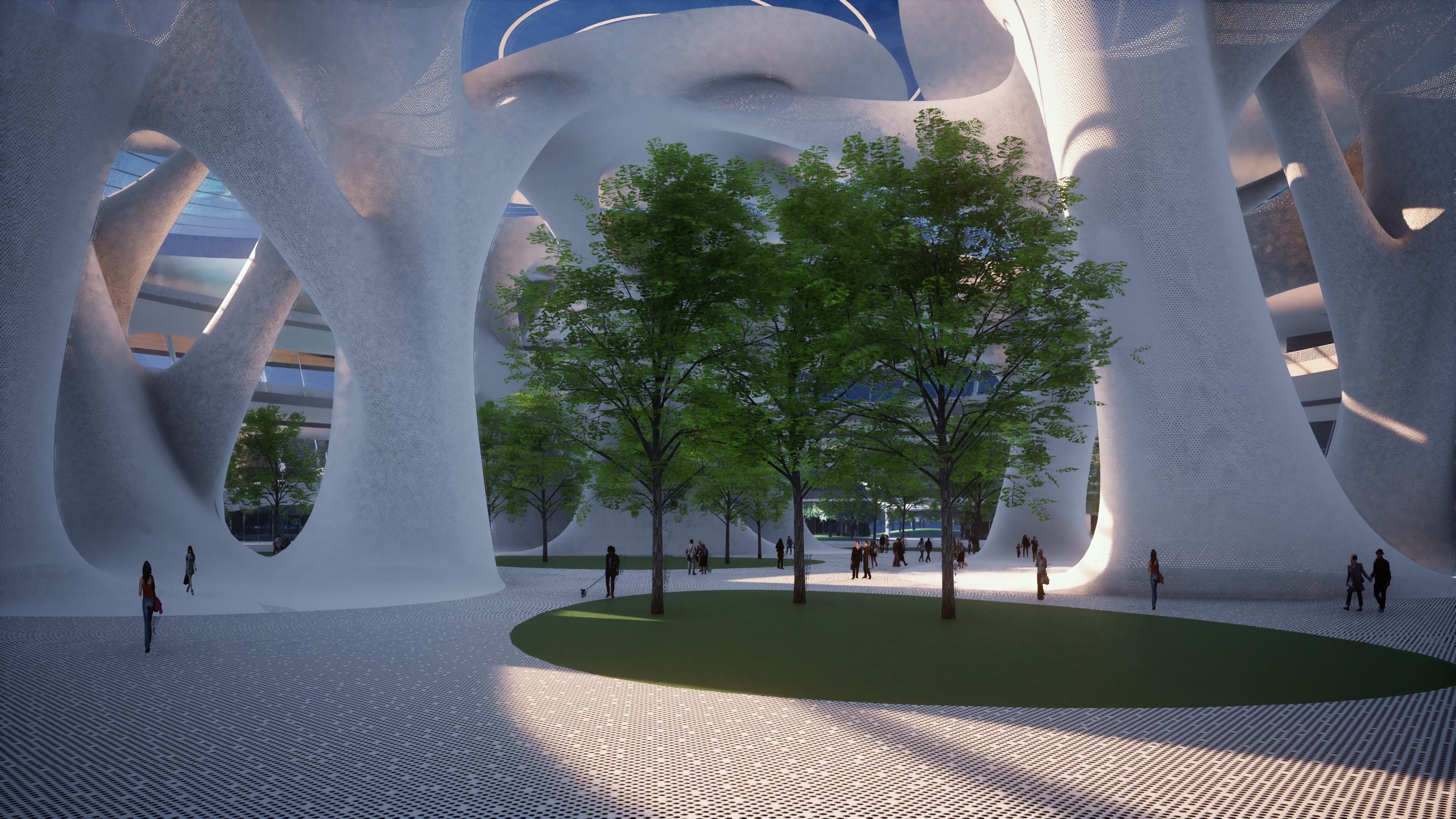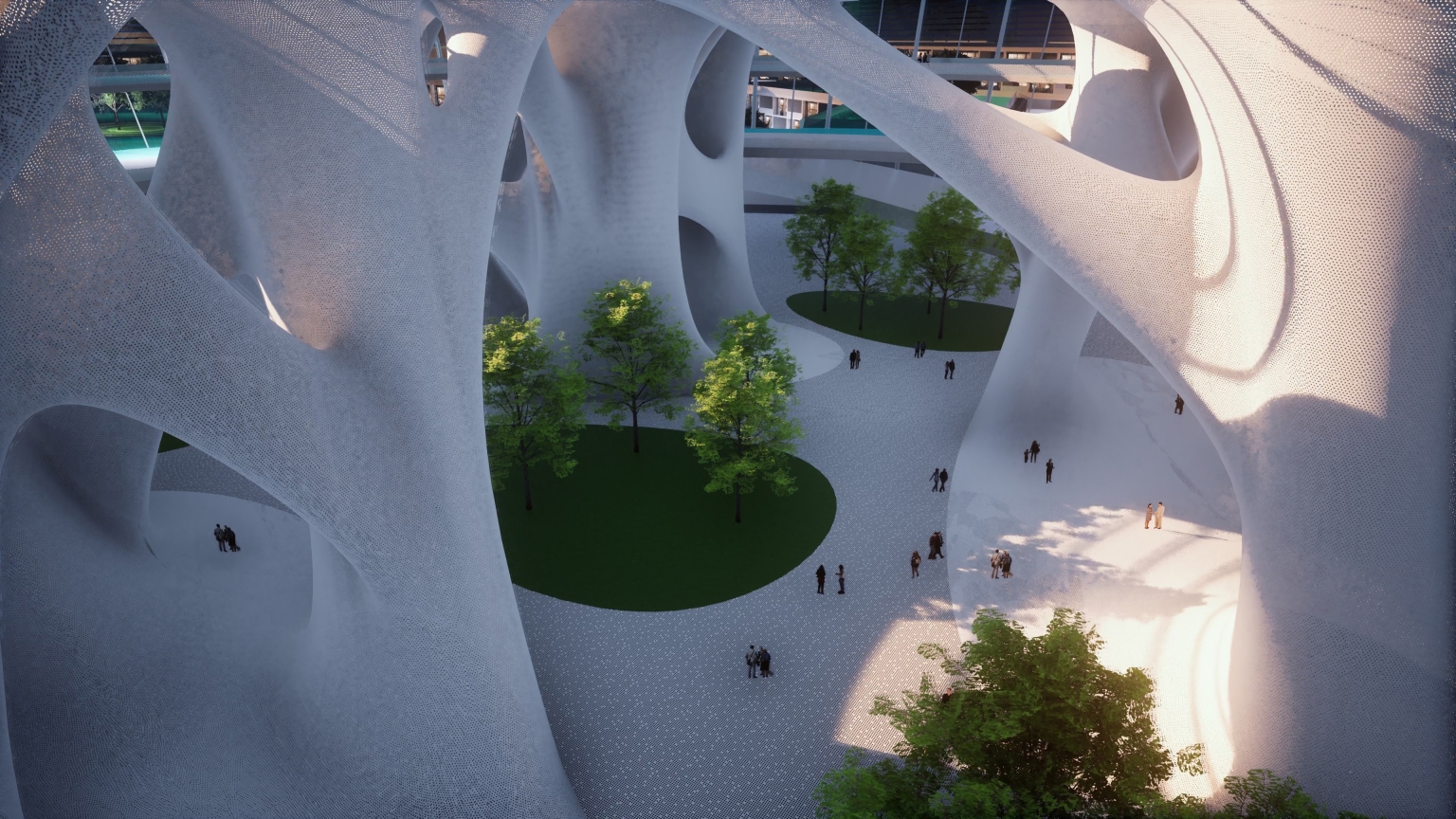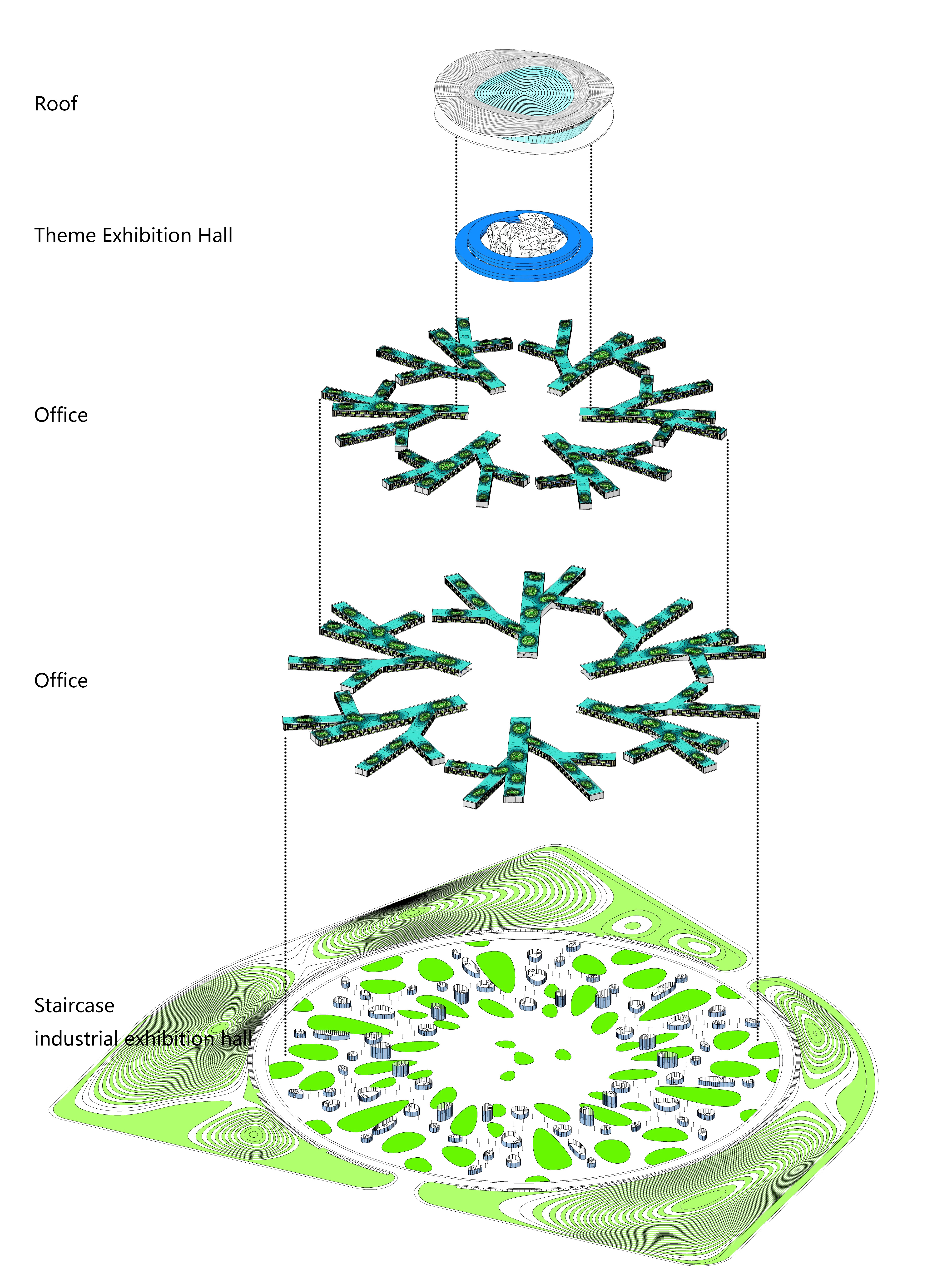 The biotechnology industrial park abandons traditional decentralized office building planning and instead adopts an overall architectural design that efficiently aggregates the same function. The public service functions are gathered at the central level to form a service core ring, and the interior of it is a camera space specifically designed for the era of social media. Taking inspiration from biological microfibers, create an open and flowing photography garden. The service ring and lens space form the core system of the park, like a huge magnet, attracting all the surrounding single module office buildings to the center, connecting them into veins, and growing into branches. The office space is staggered and stacked to form a roof garden. The ground floor is overhead, and the traffic core is separately landed to form the entrance exhibition hall of each office group, forming a display system together with the central exhibition hall. The entire park building is concentrated towards the center, and the green space is concentrated around. Green is greener, dense is denser, together forming an efficient industrial park system that maximizes the coexistence of office and garden.