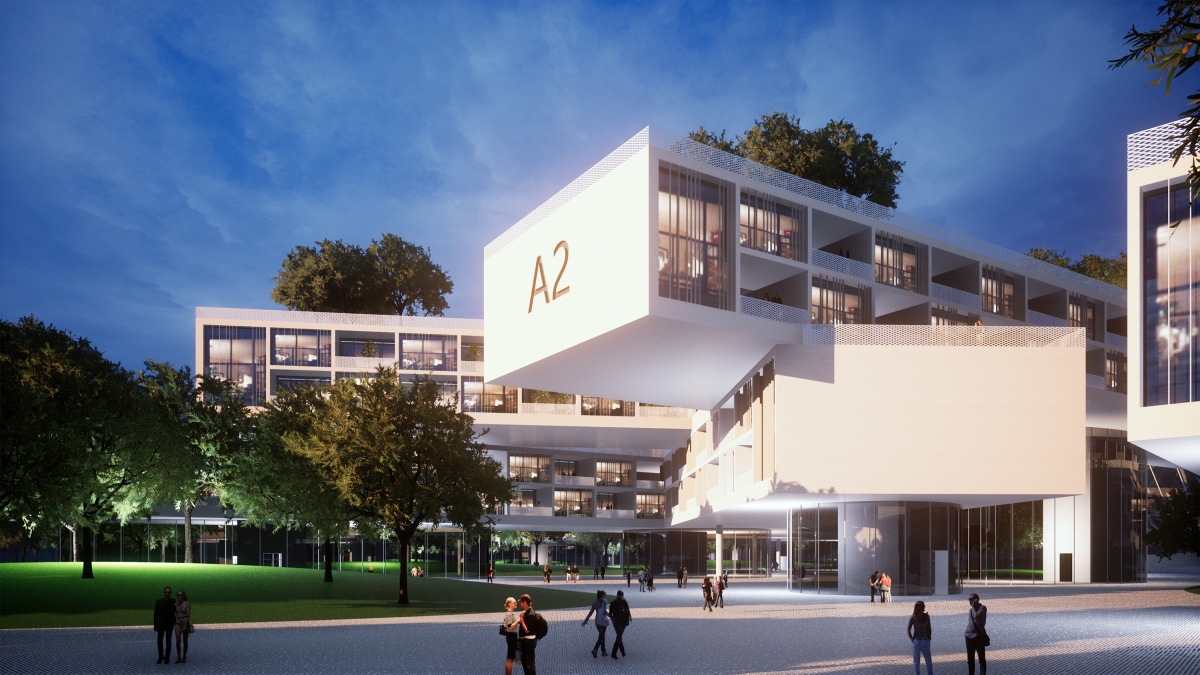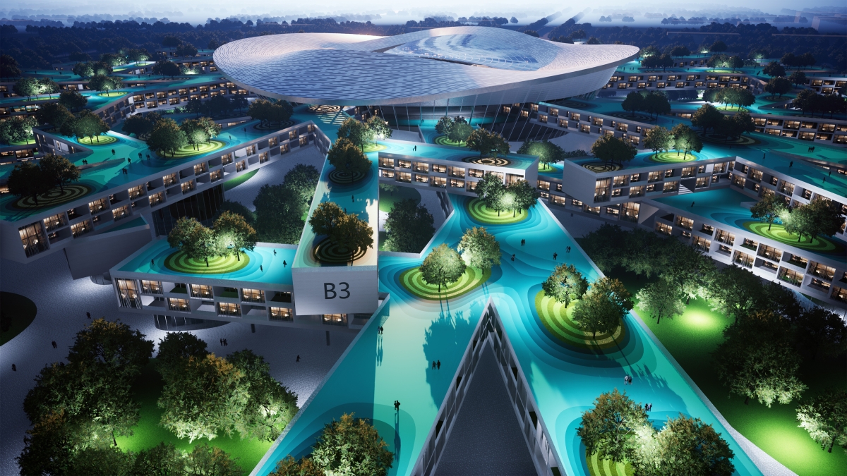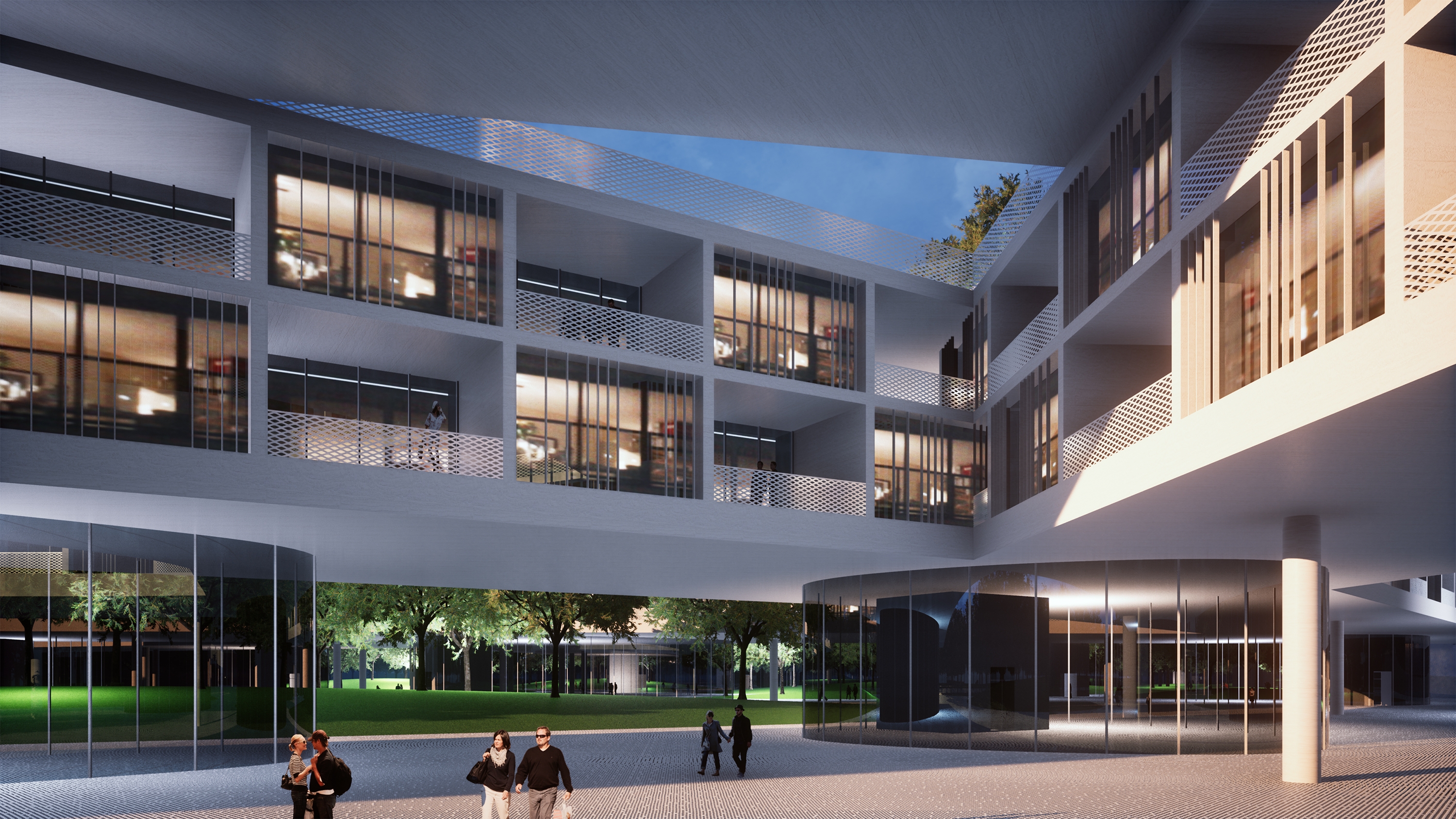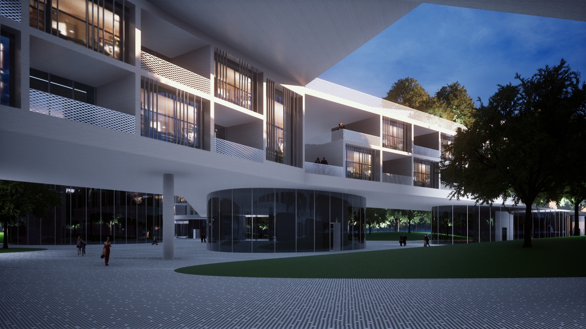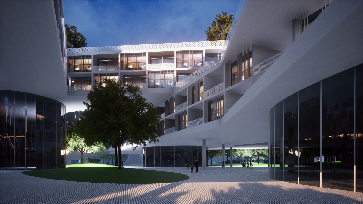 The biotechnology industrial park abandons traditional decentralized office building planning and instead adopts an overall architectural design that efficiently aggregates the same function. The public service functions are gathered at the central level to form a service core ring, and the interior of it is a camera space specifically designed for the era of social media. Taking inspiration from biological microfibers, create an open and flowing photography garden. The service ring and lens space form the core system of the park, like a huge magnet, attracting all the surrounding single module office buildings to the center, connecting them into veins, and growing into branches. The office space is staggered and stacked to form a roof garden. The ground floor is overhead, and the traffic core is separately landed to form the entrance exhibition hall of each office group, forming a display system together with the central exhibition hall. The entire park building is concentrated towards the center, and the green space is concentrated around. Green is greener, dense is denser, together forming an efficient industrial park system that maximizes the coexistence of office and garden.