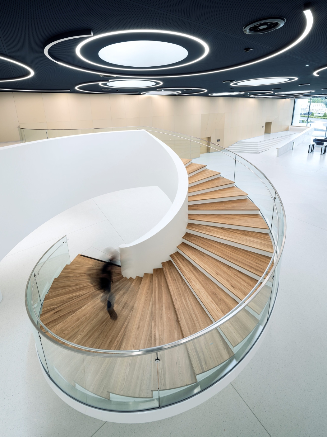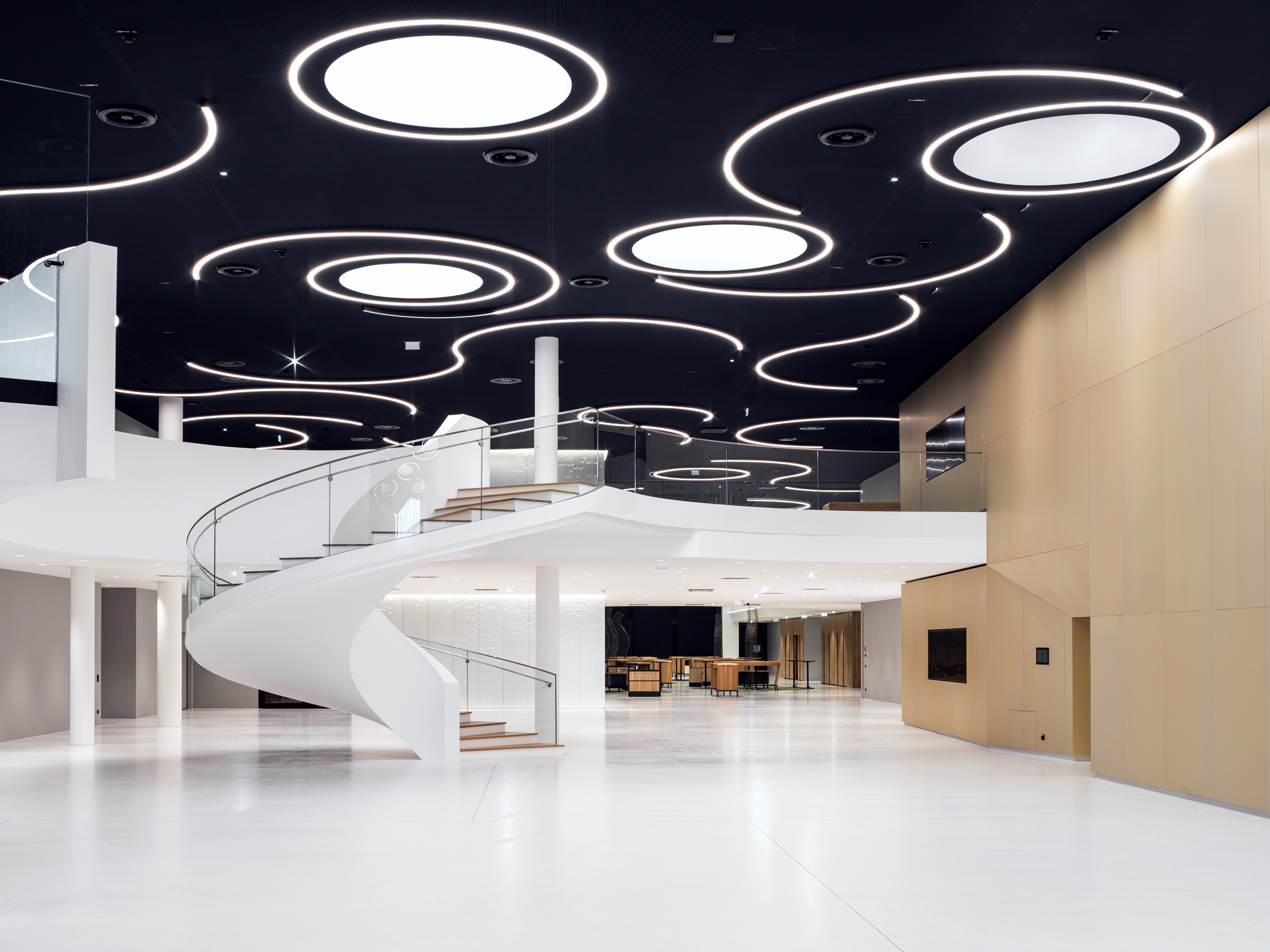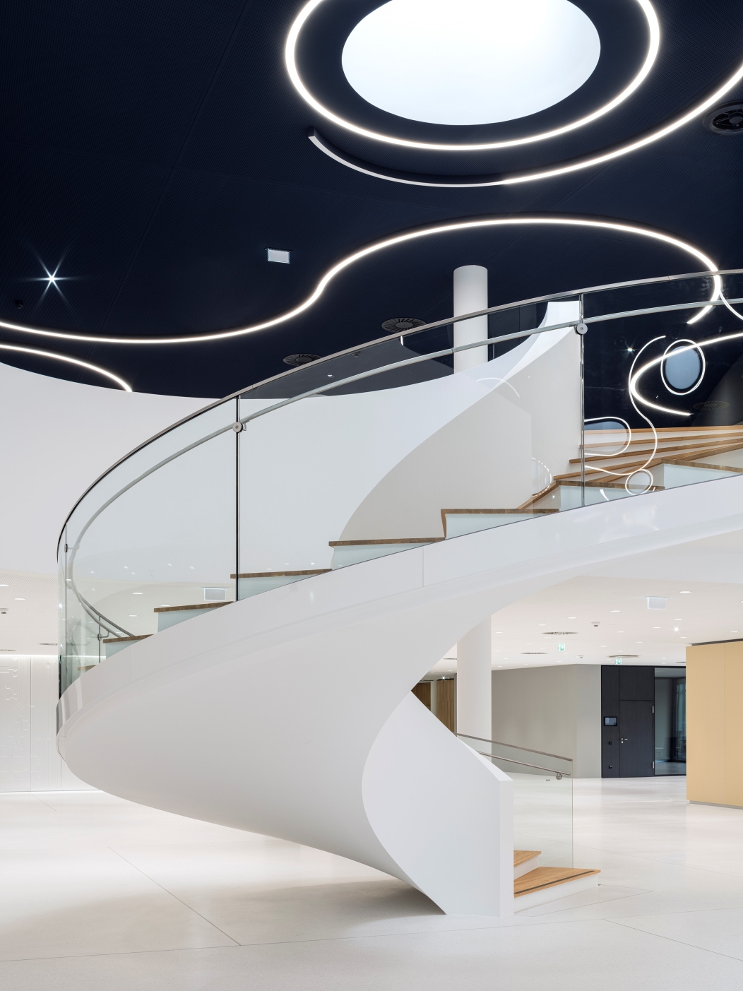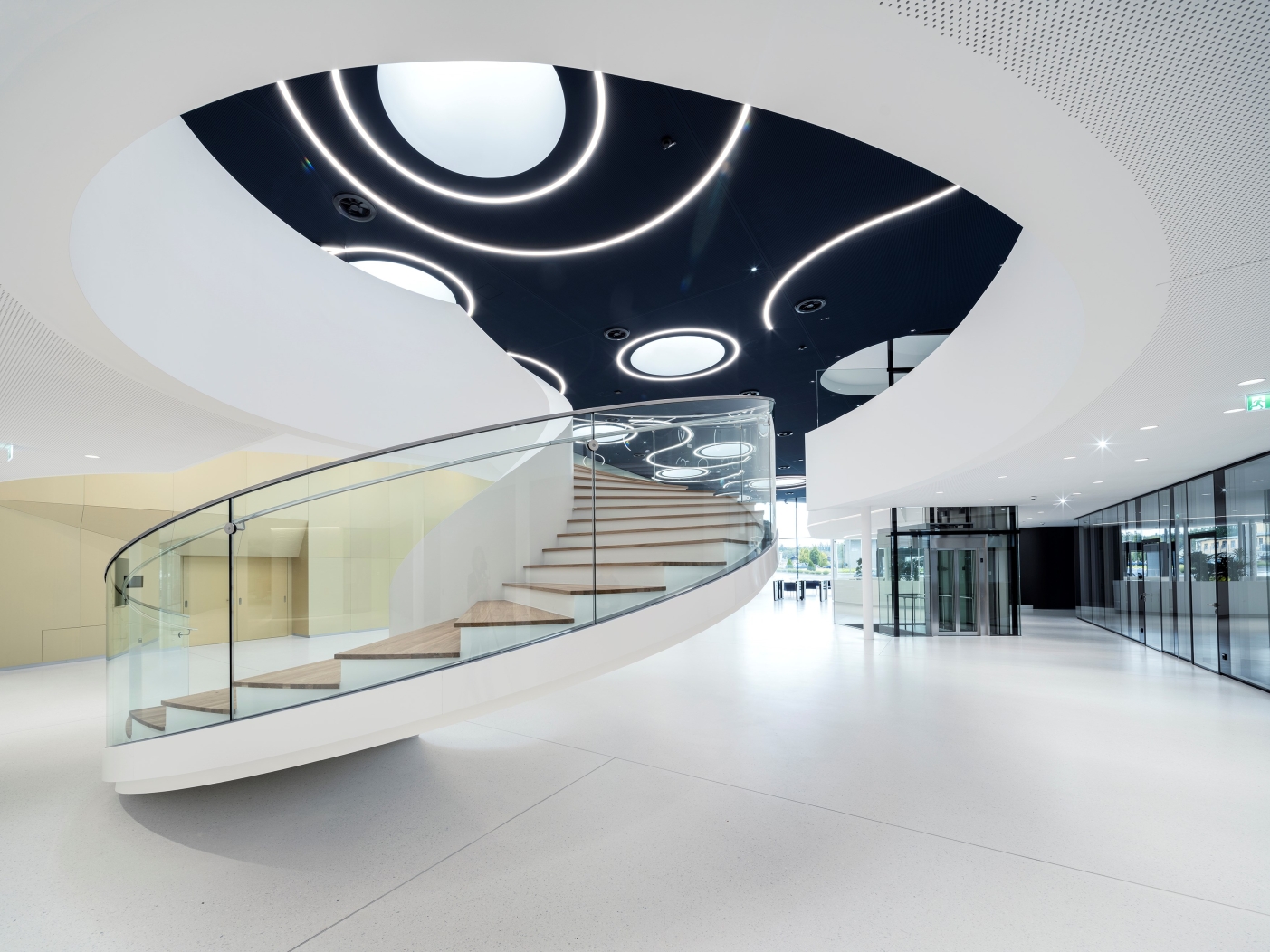 The entrance foyer with the reception and the spacious 2-story central room, 3 large (interconnectable) auditoriums, the discovery deck on the upper level, and training, academy and meeting rooms on 2 levels act as the centerpiece for corporate presentations. Flowing spatial structures for research & development spread over a total of 6 levels, clustered open-space workplaces with focus boxes, coffee&talk zones and terraces offer an open and spatially generous working environment in which the individual is allowed to keep a clear overview.