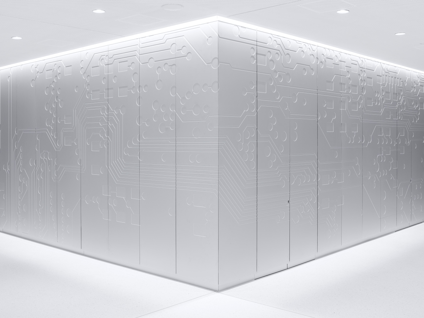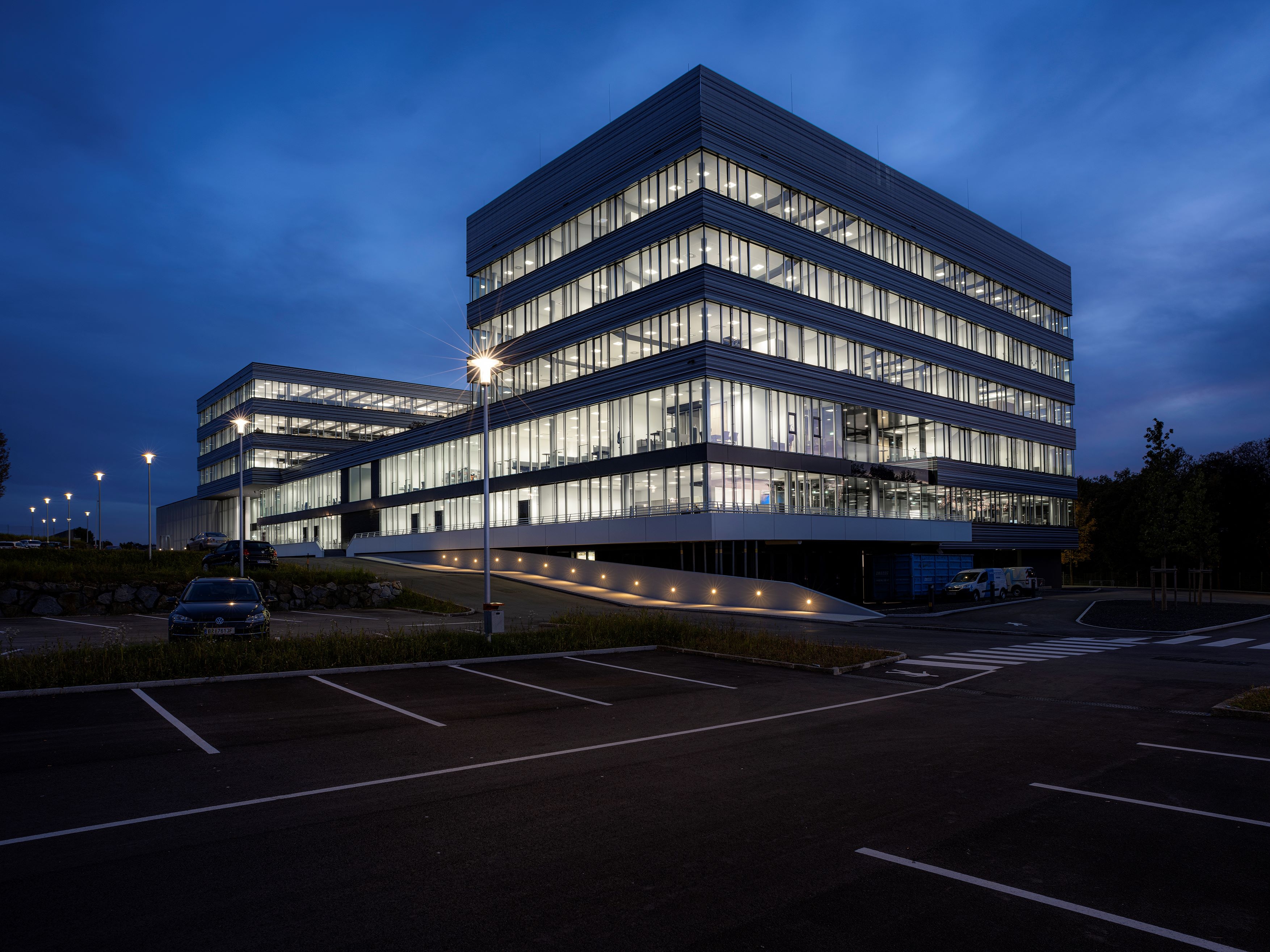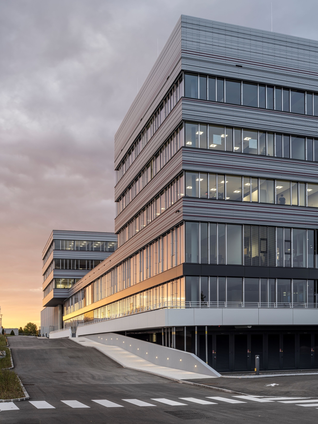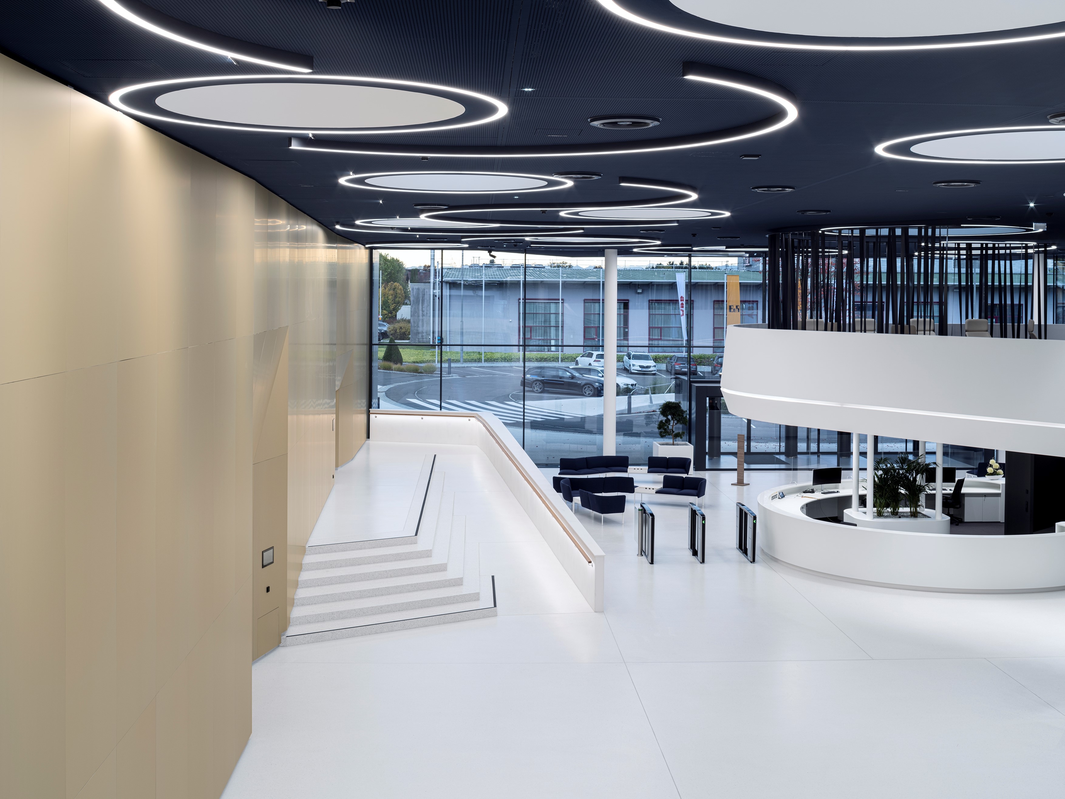 The entrance foyer with the reception and the spacious 2-story central room, 3 large (interconnectable) auditoriums, the discovery deck on the upper level, and training, academy and meeting rooms on 2 levels act as the centerpiece for corporate presentations. Flowing spatial structures for research & development spread over a total of 6 levels, clustered open-space workplaces with focus boxes, coffee&talk zones and terraces offer an open and spatially generous working environment in which the individual is allowed to keep a clear overview.