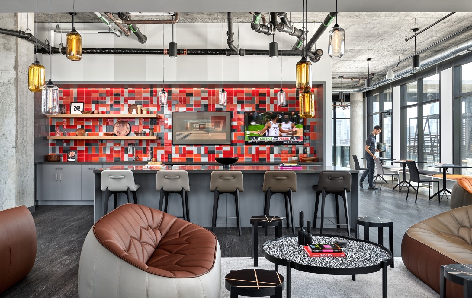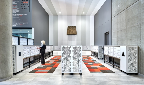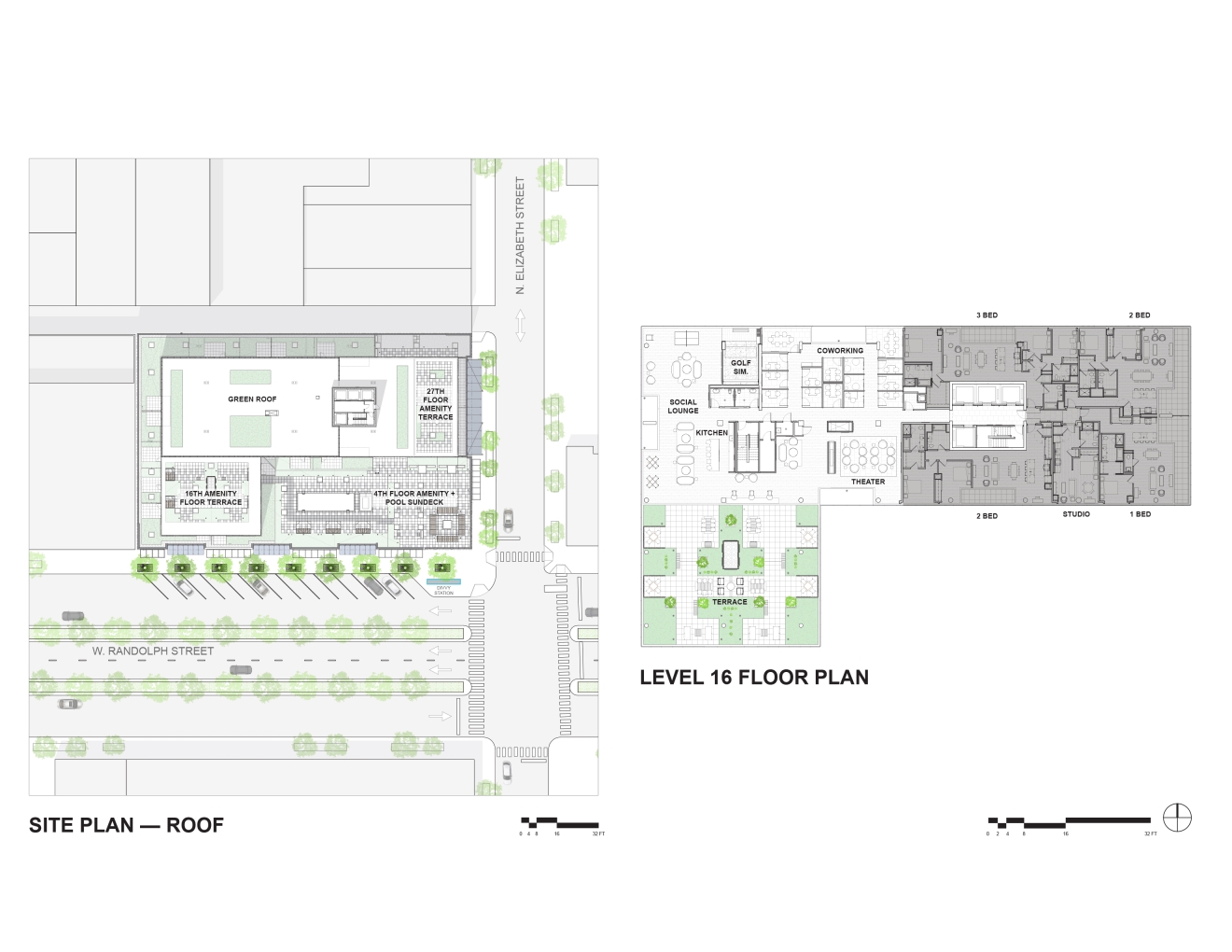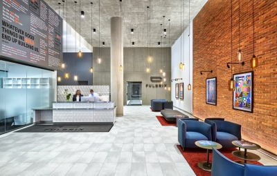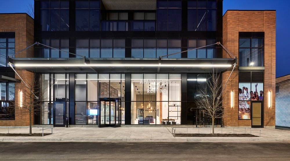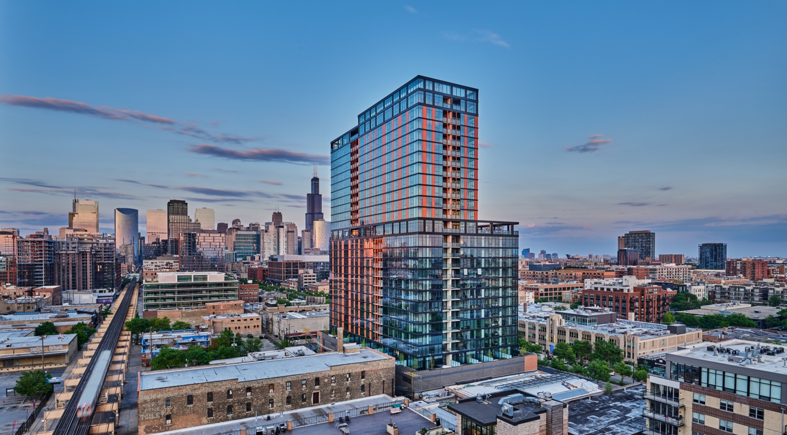 Fulbrix Apartments is a 27-story glass and steel tower of 375 apartments, with 75 affordable units onsite, located in Chicago’s Fulton Market. The public realm was much improved by replacing an under-used warehouse with new housing that is high performance environmentally, walkable and close to public transportation. Fulbrix invigorates the neighborhood by adding 9000SF of new street-level retail activity and an influx of residents with ready access to the West Loop’s work/live/play lifestyle. The tower is a glass box separated into three components: a 3-story rectangular base with lobby, retail and parking; the apartments on L4-16 are set within an L-shaped plan, and L17-27 are topped off with a smaller rectangular plan. The geometry shifts and deconstructs cuboids accented by both glassy and solid metal panels painted a burnt-orange to match the brick color at the base. The shifting solid panels create movement and interest in the large facades. A filigree of fins provides a delicate transition between the glassy and solid panels. This is an eco-friendly, healthy, high-performance building designed using sustainable strategies with the targeted goal of achieving two Green Globes.