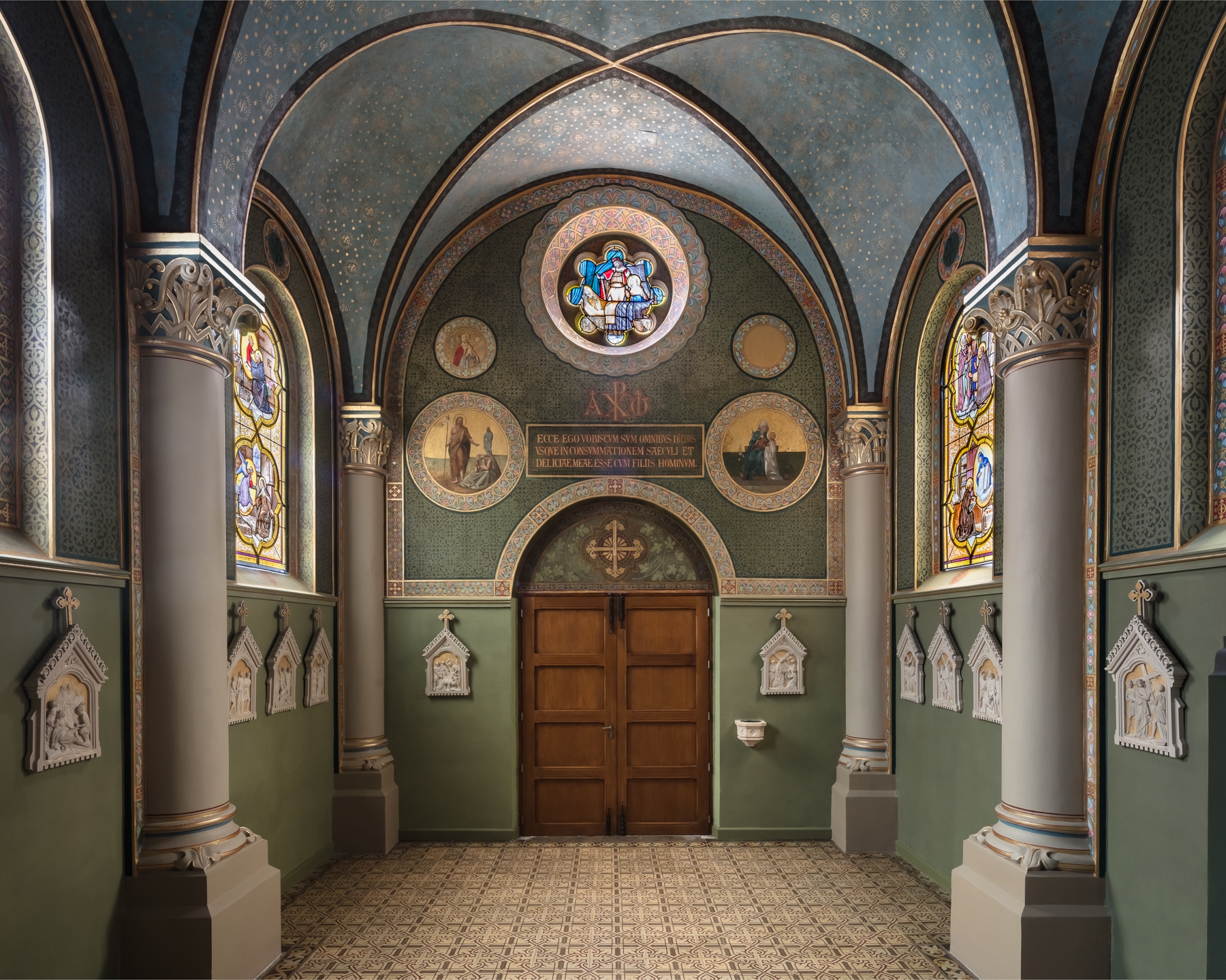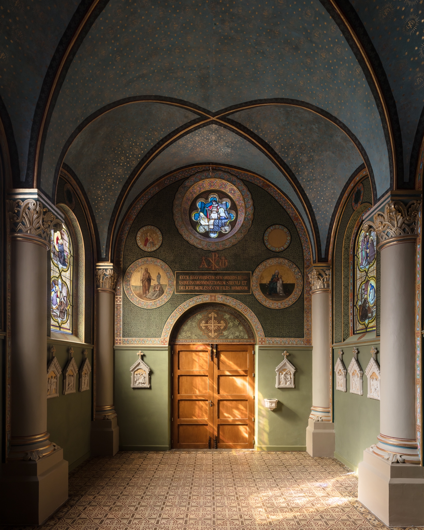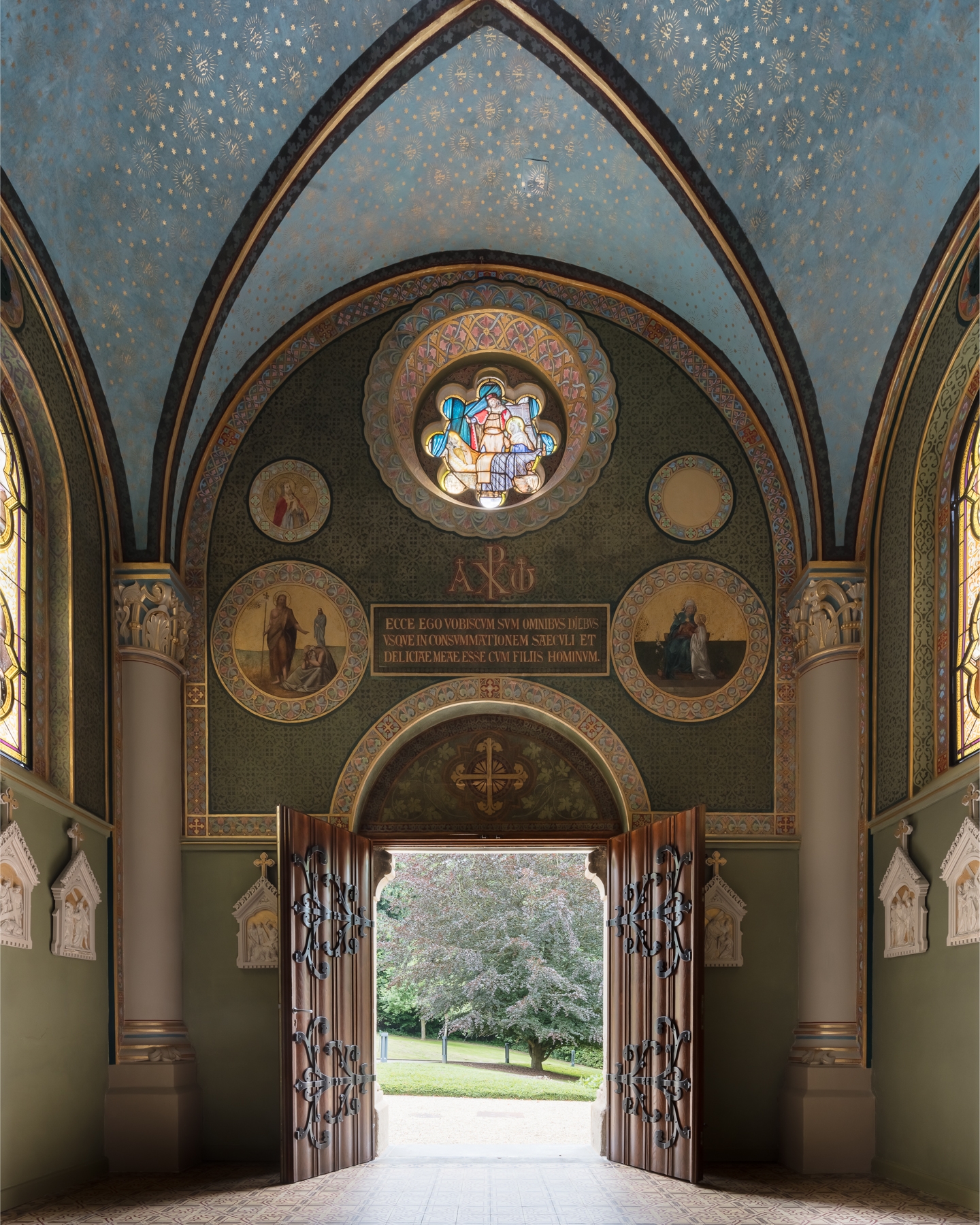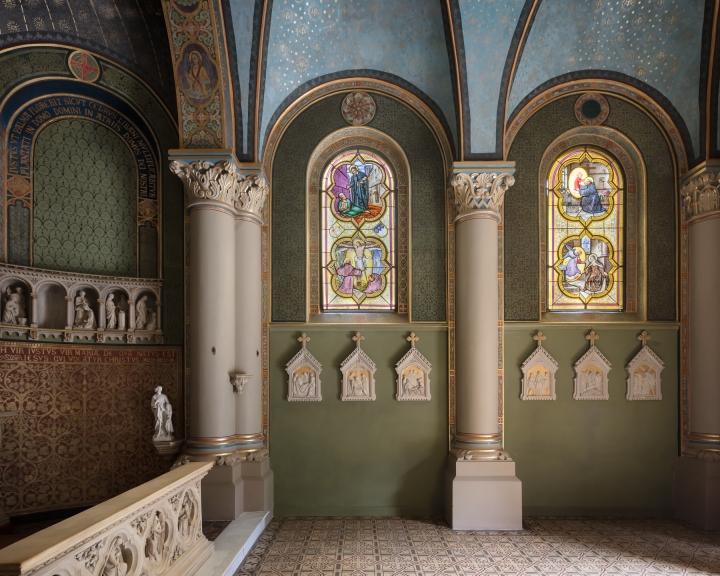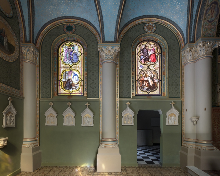 In 1994, SAS Institute - American leader in business intelligence and analytical software and services - bought the castle de Robiano. This castle site dates with certainty back to the 14th century and includes an eclectically inspired castle and a neo-Romanesque chapel. Until 1994, the site was used as a Children's Colony. After a complete restoration, SAS integrates its offices into the castle in 1997. The neo-Romanesque chapel wasn't part of this restoration. After years of abandonment, SAS decided in 2009 to restore the chapel to its former glory. First, the roofs got restored, including the reconstruction of the 19th century tower, based on drawings and in close collaboration with tower builders. Afterwards the facade got purposefully preserved without major reconstructions or stone replacements. After a total renovation, the 19th century ‘Gesamtkunstwerk’ was restored. In the interior, the richly decorated interiors by top German artist, who were hidden for decades under a thick layer of yellow paint become visible again. The chapel becomes a treasure for all heritage enthusiasts.