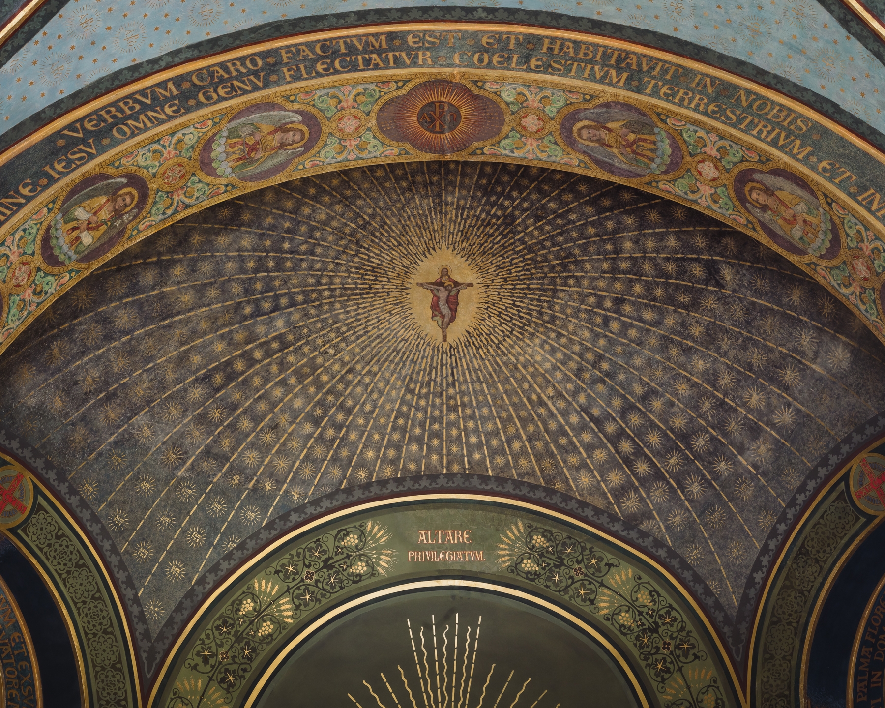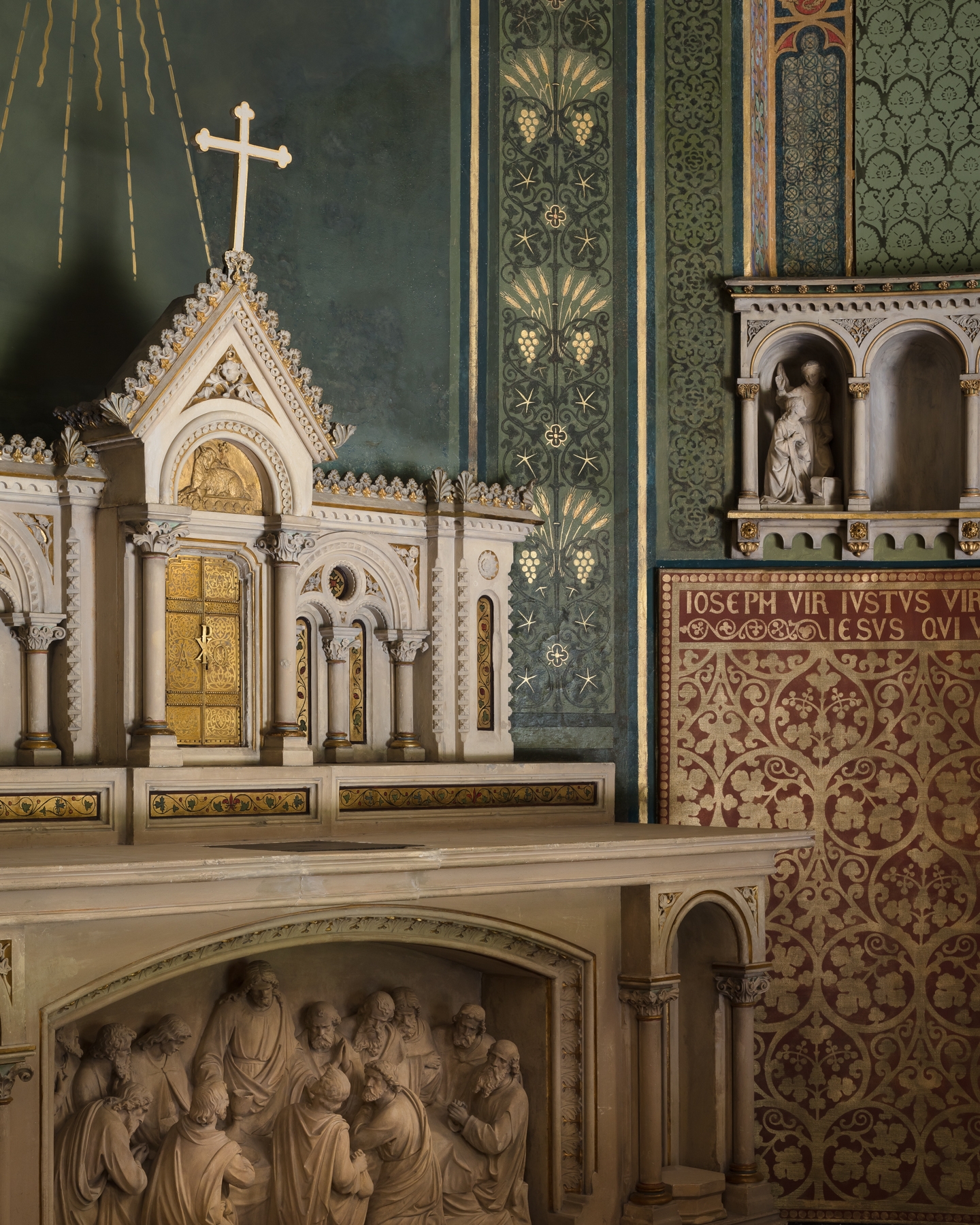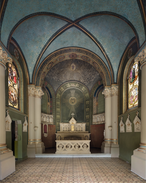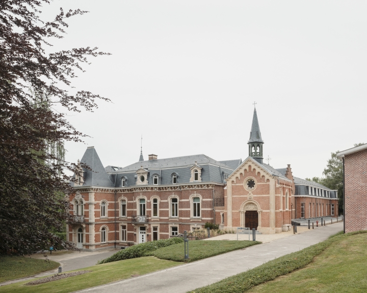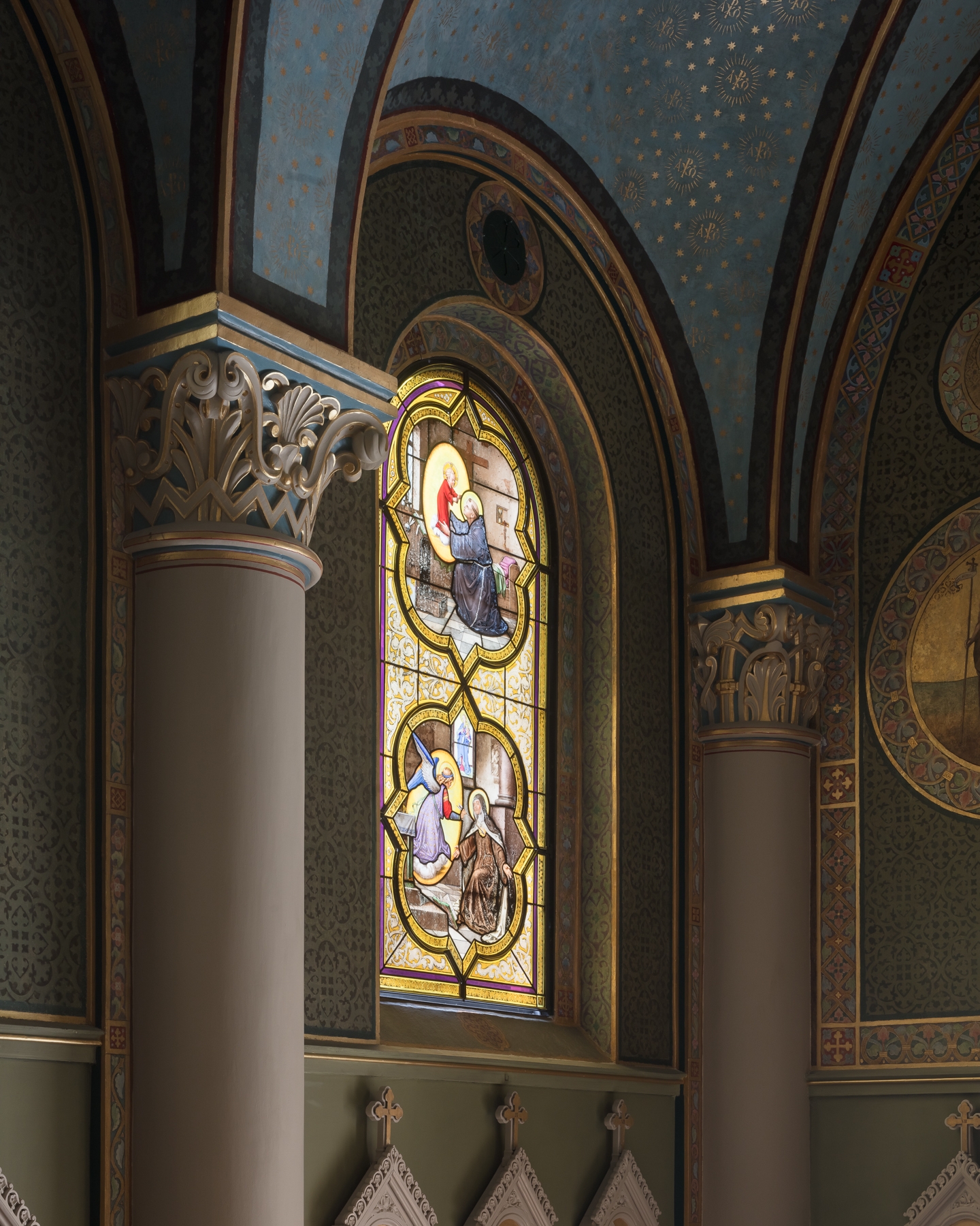 In 1994, SAS Institute - American leader in business intelligence and analytical software and services - bought the castle de Robiano. This castle site dates with certainty back to the 14th century and includes an eclectically inspired castle and a neo-Romanesque chapel. Until 1994, the site was used as a Children's Colony. After a complete restoration, SAS integrates its offices into the castle in 1997. The neo-Romanesque chapel wasn't part of this restoration. After years of abandonment, SAS decided in 2009 to restore the chapel to its former glory. First, the roofs got restored, including the reconstruction of the 19th century tower, based on drawings and in close collaboration with tower builders. Afterwards the facade got purposefully preserved without major reconstructions or stone replacements. After a total renovation, the 19th century ‘Gesamtkunstwerk’ was restored. In the interior, the richly decorated interiors by top German artist, who were hidden for decades under a thick layer of yellow paint become visible again. The chapel becomes a treasure for all heritage enthusiasts.