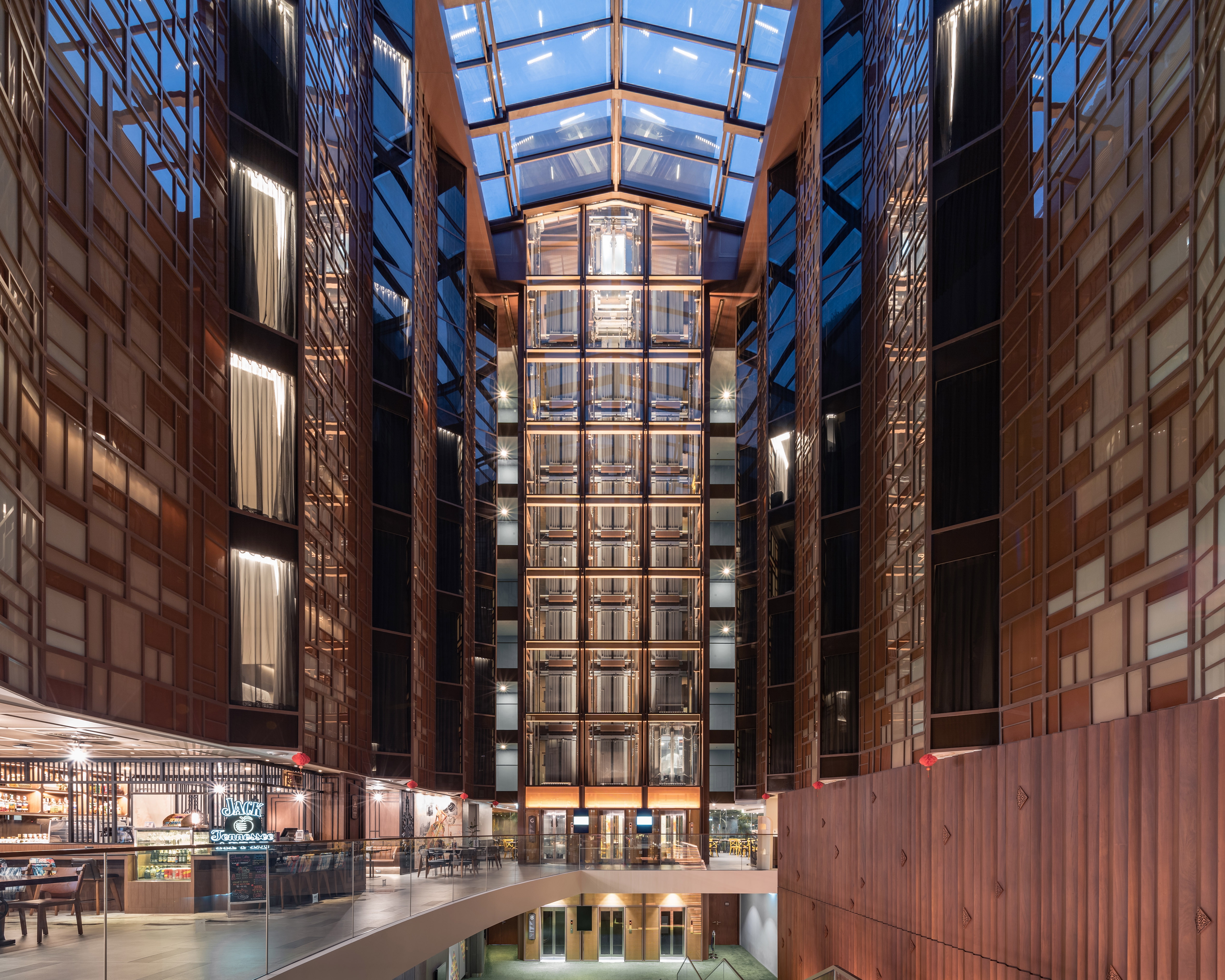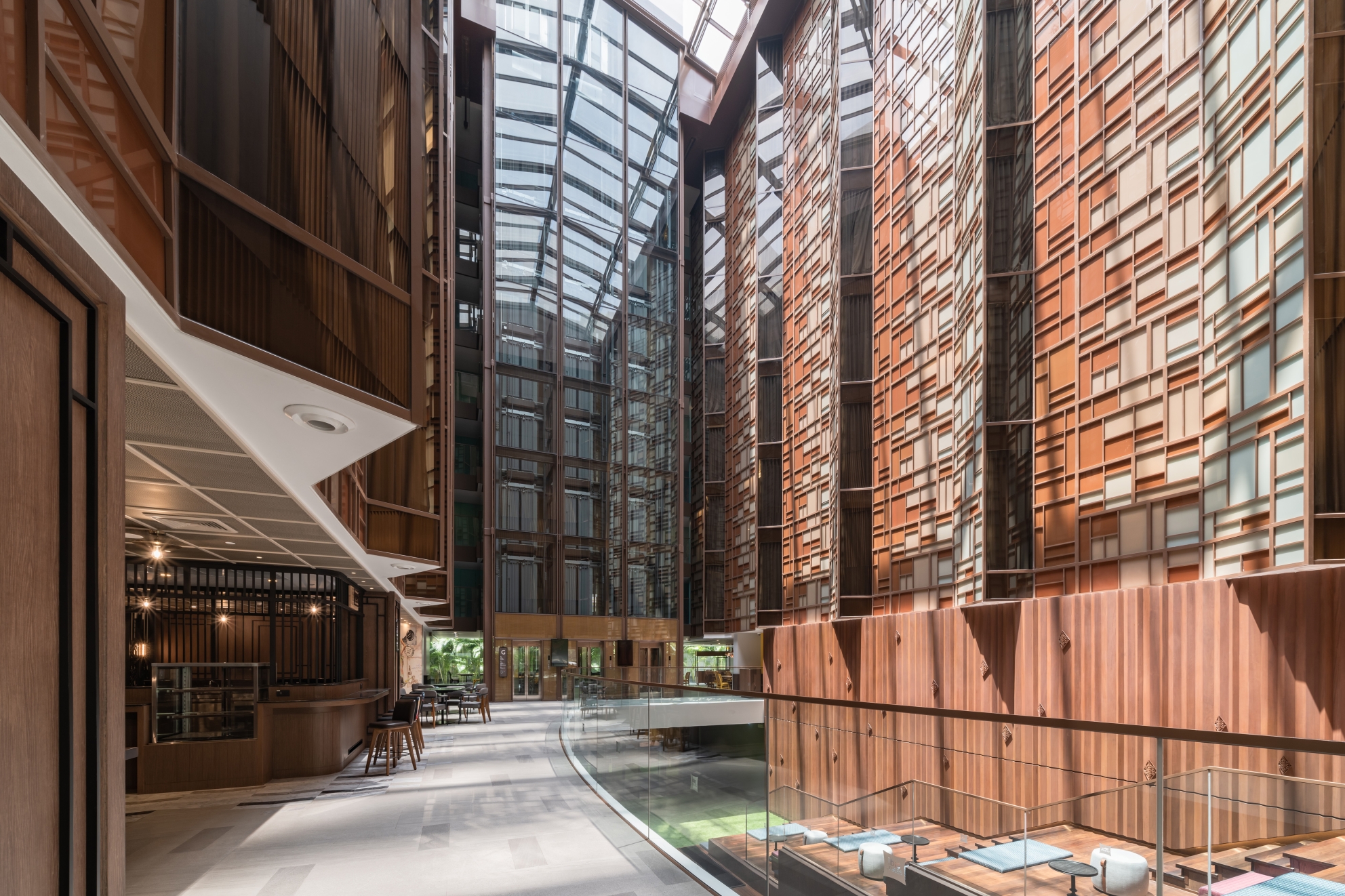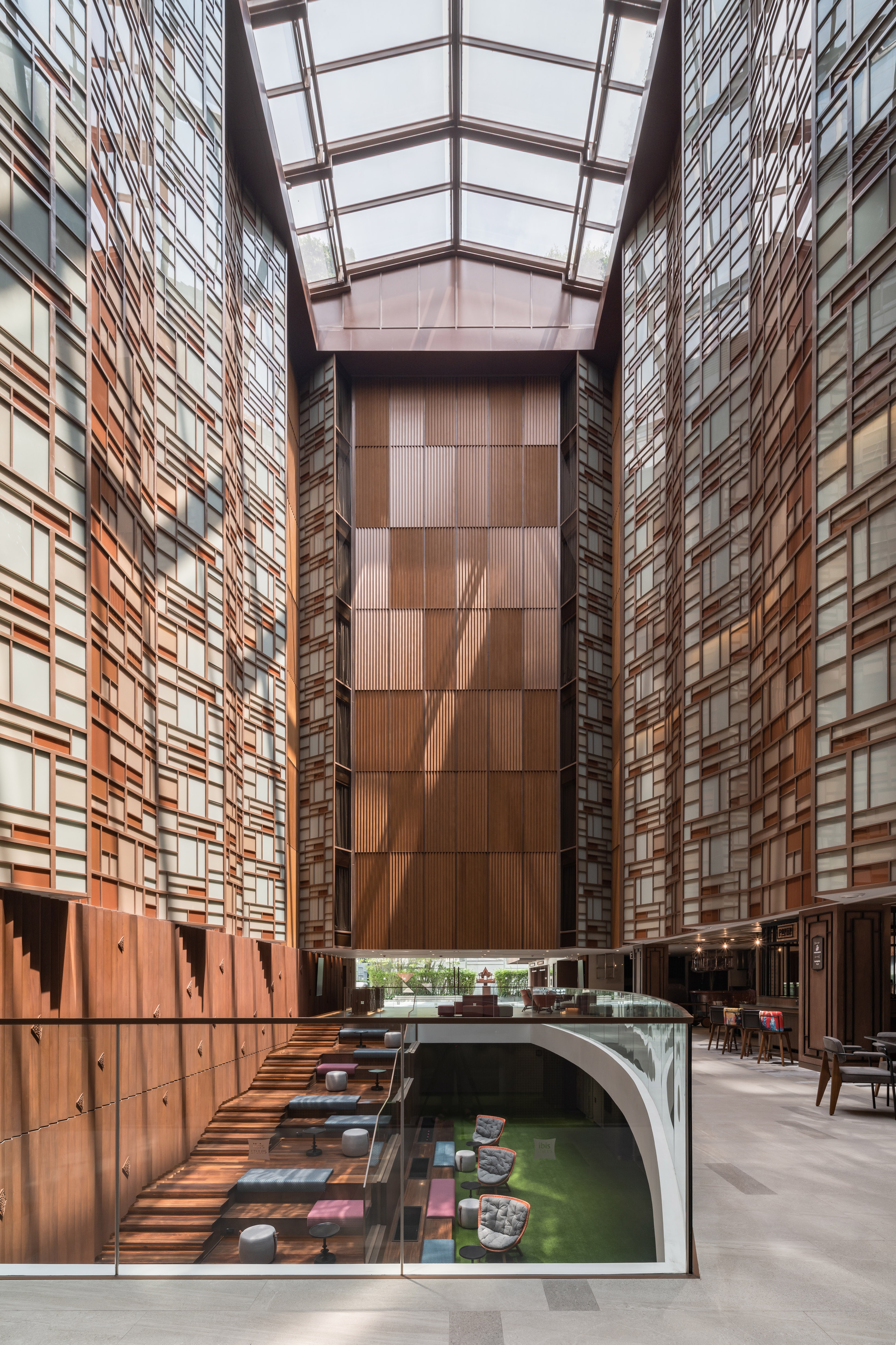 Its façade greets them with a simple box design. Strategically placed lighting subtly reveals glimpses of the treasures within, enticing guests to enter the hotel and explore its gems. Upon entering, guests are immersed in a stunning atrium, meticulously designed as the central space that connects various amenities. Each of these areas represents a precious gem within the chest, stimulating the innate desire of travellers to uncover not only the hotel but also the vibrant city beyond its walls.