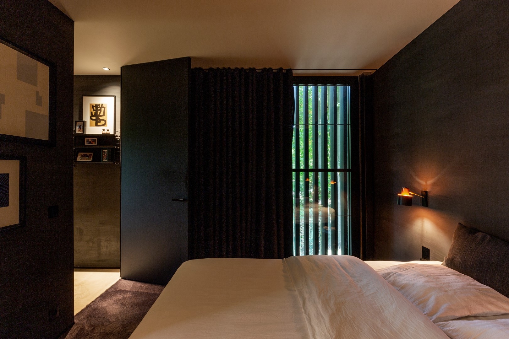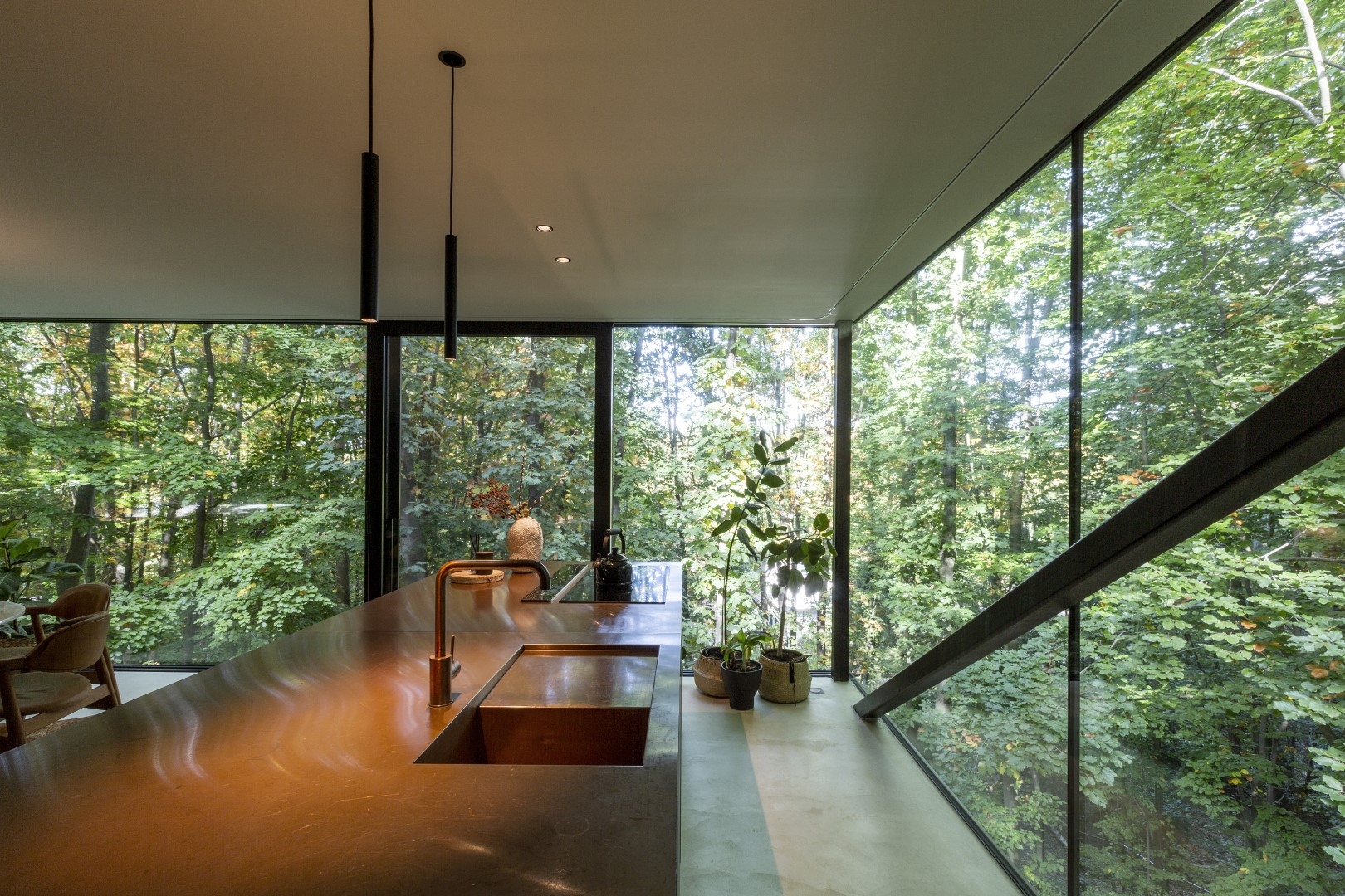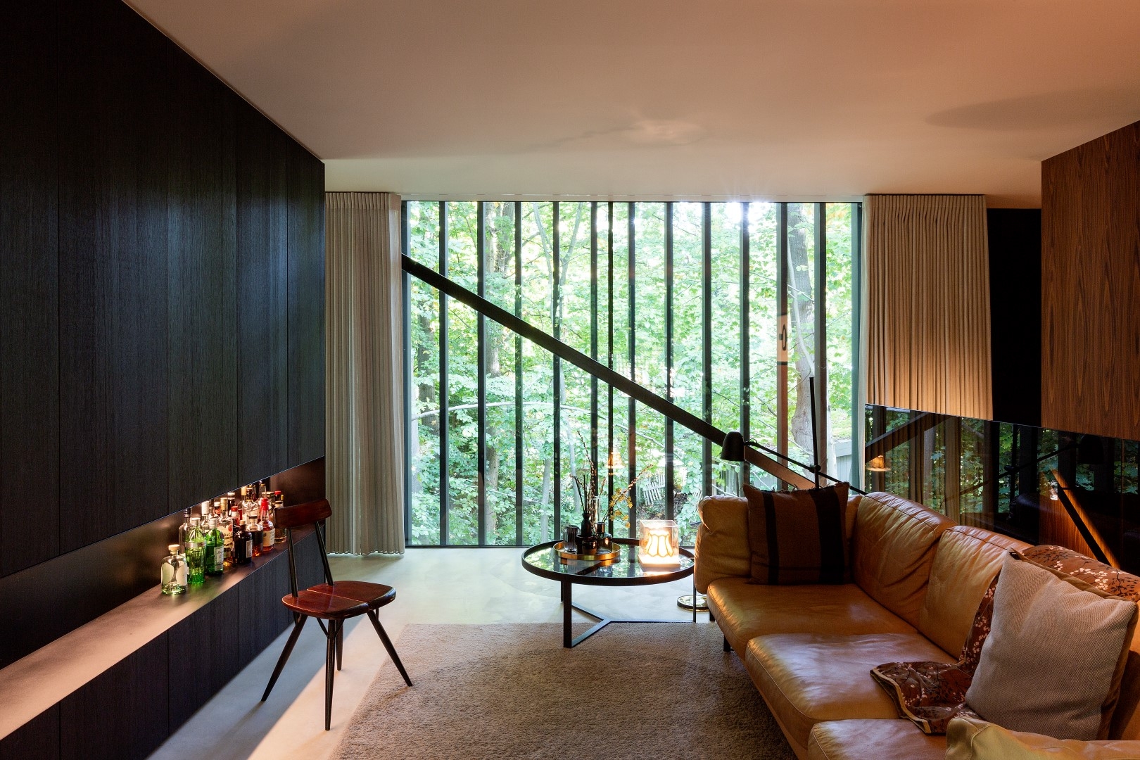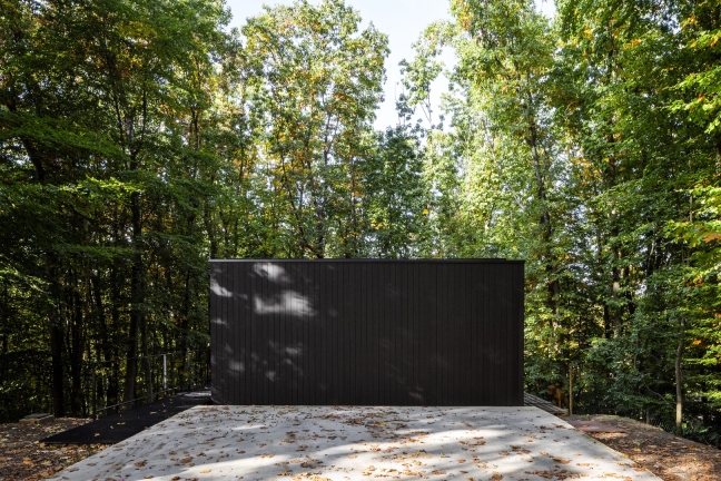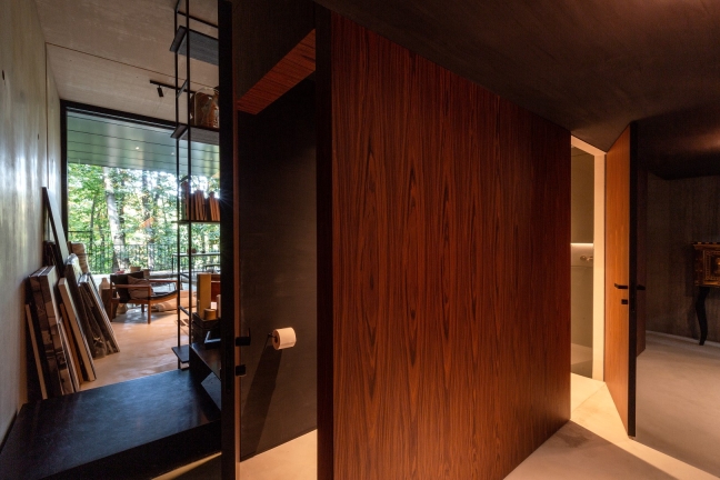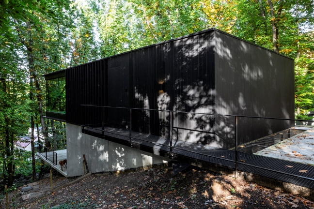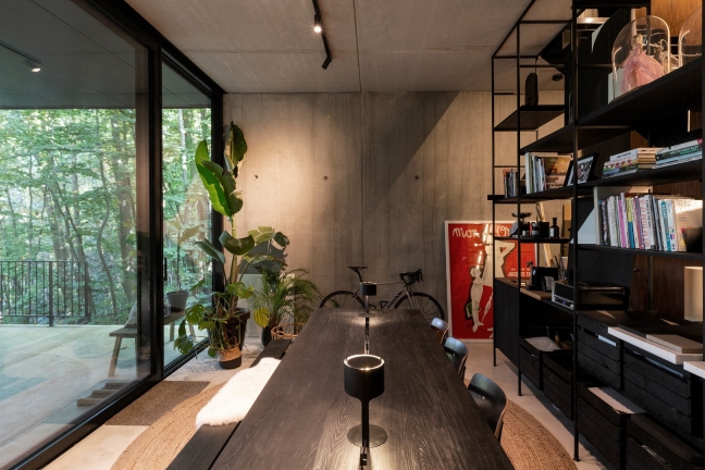 The house appears as a black wooden box from the street and gradually deconstructs into a transparent glass volume that blends with the trees. Natural and raw materials like wood, concrete, and steel were used to emphasize the connection between the house and its surroundings